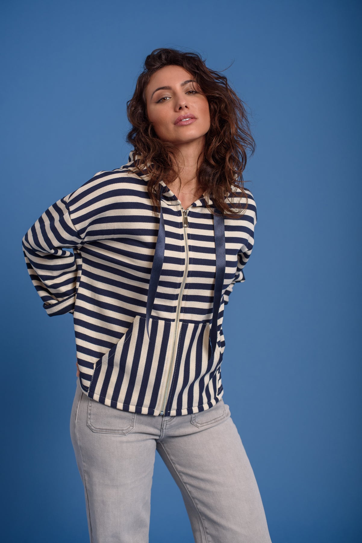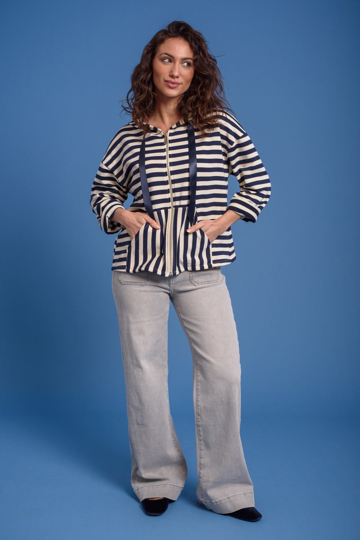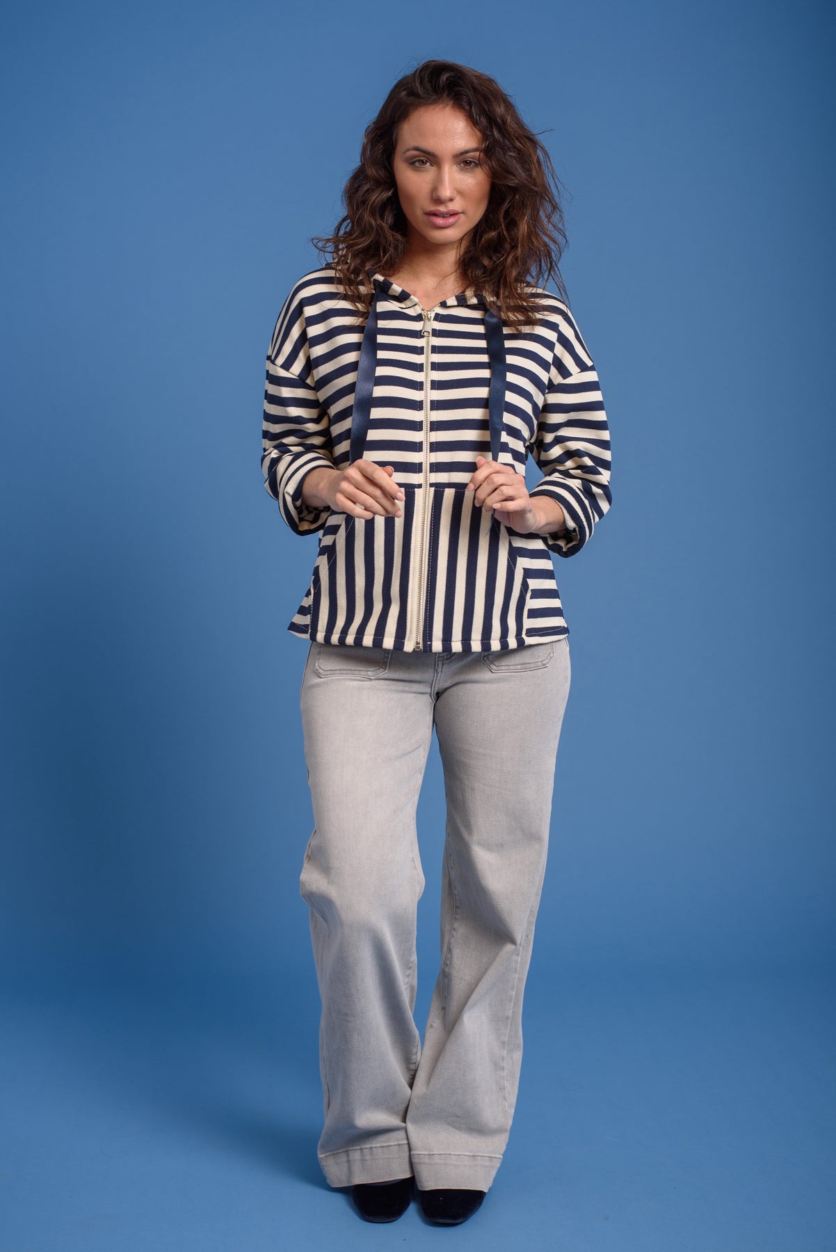 Chaqueta cierre de cremalleta. Capucha con ajuste de lazo. Bolsillos en plastron.