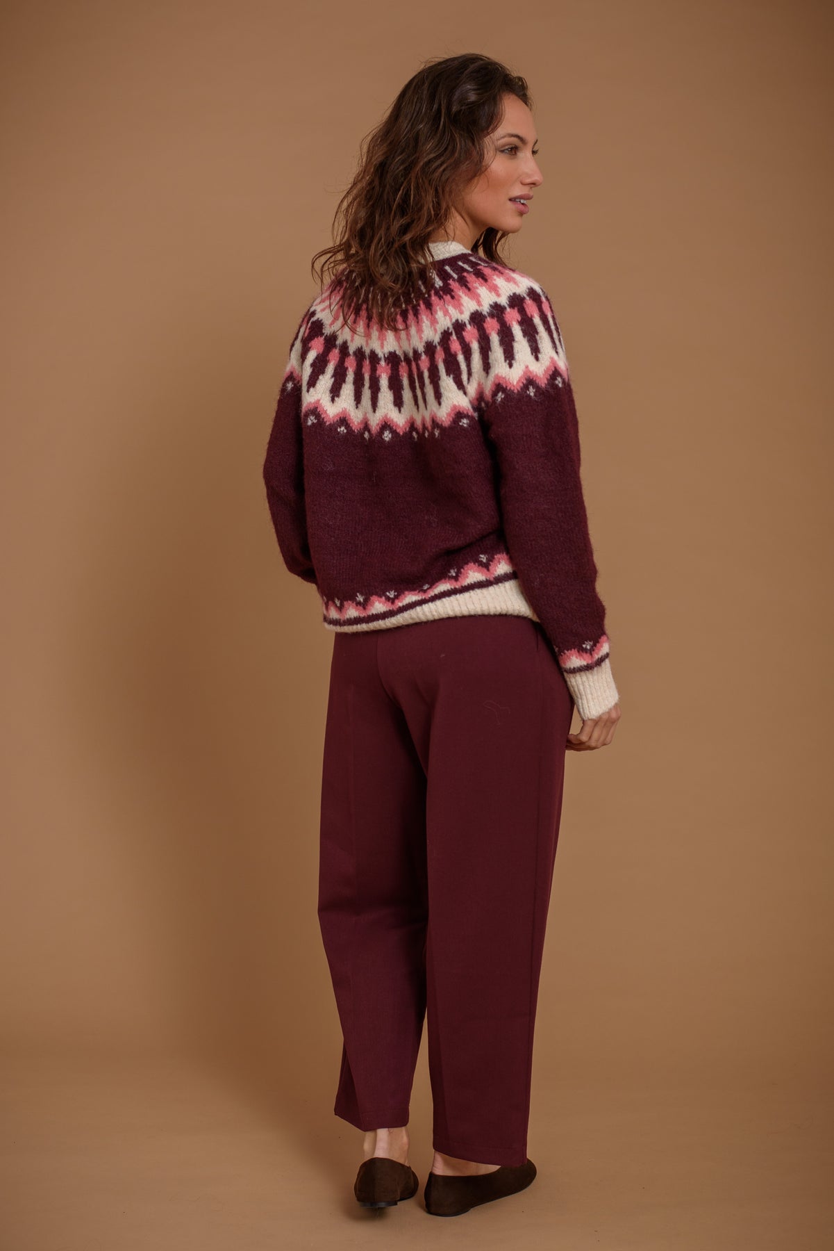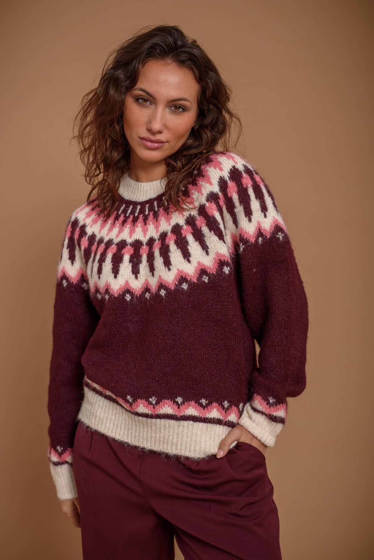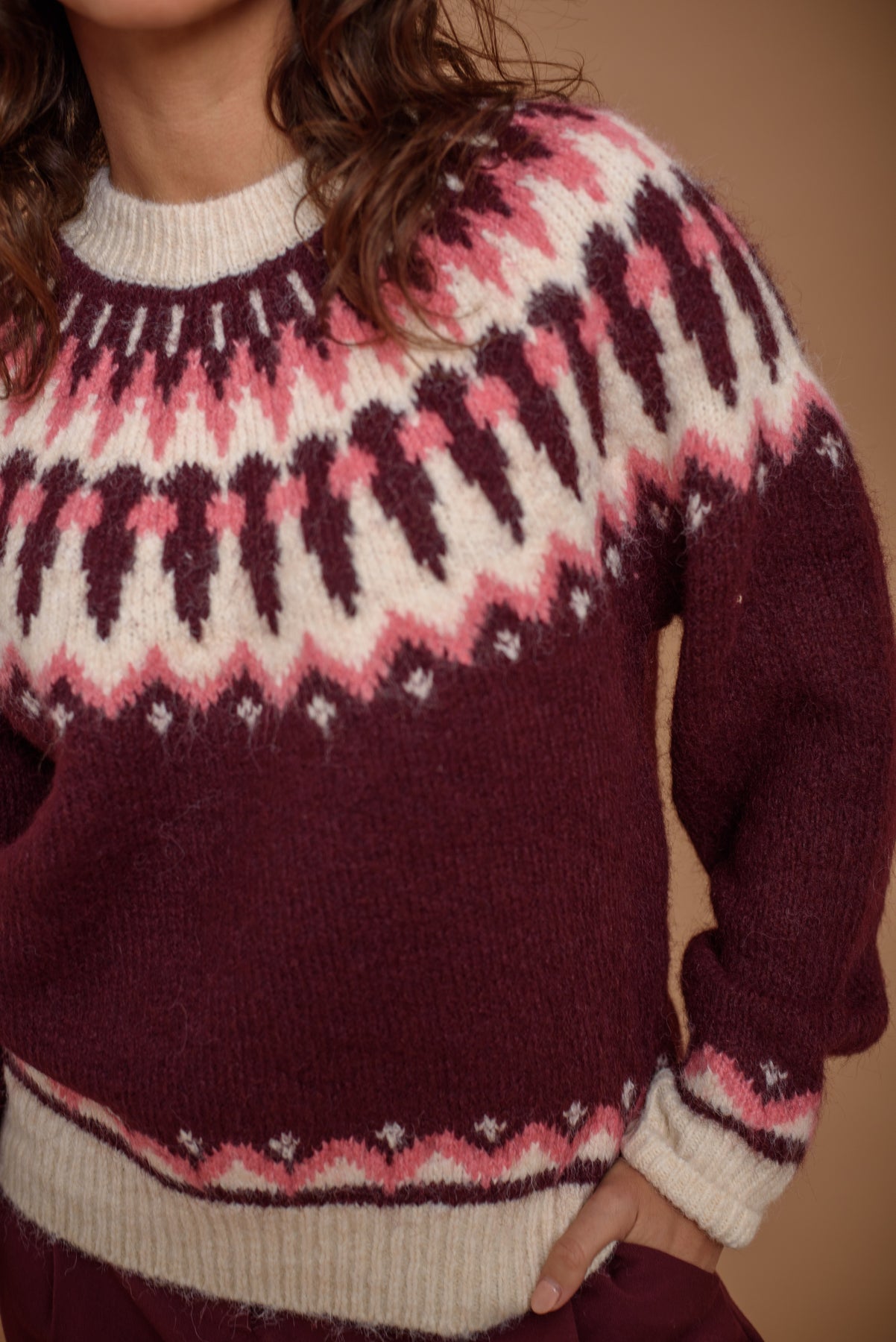 Jersey grecas en tono borgoña. Un básico atemporal en los colores de la temporada. Favorecedor, suave y super confortable.