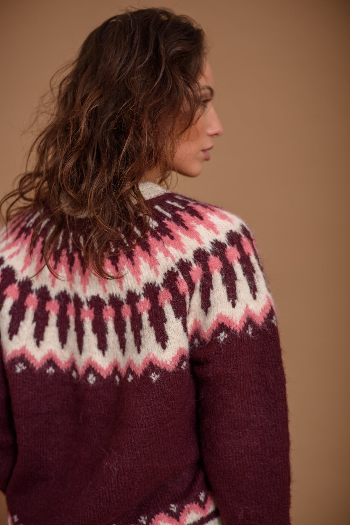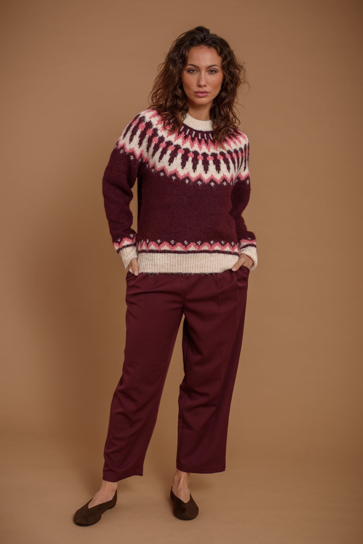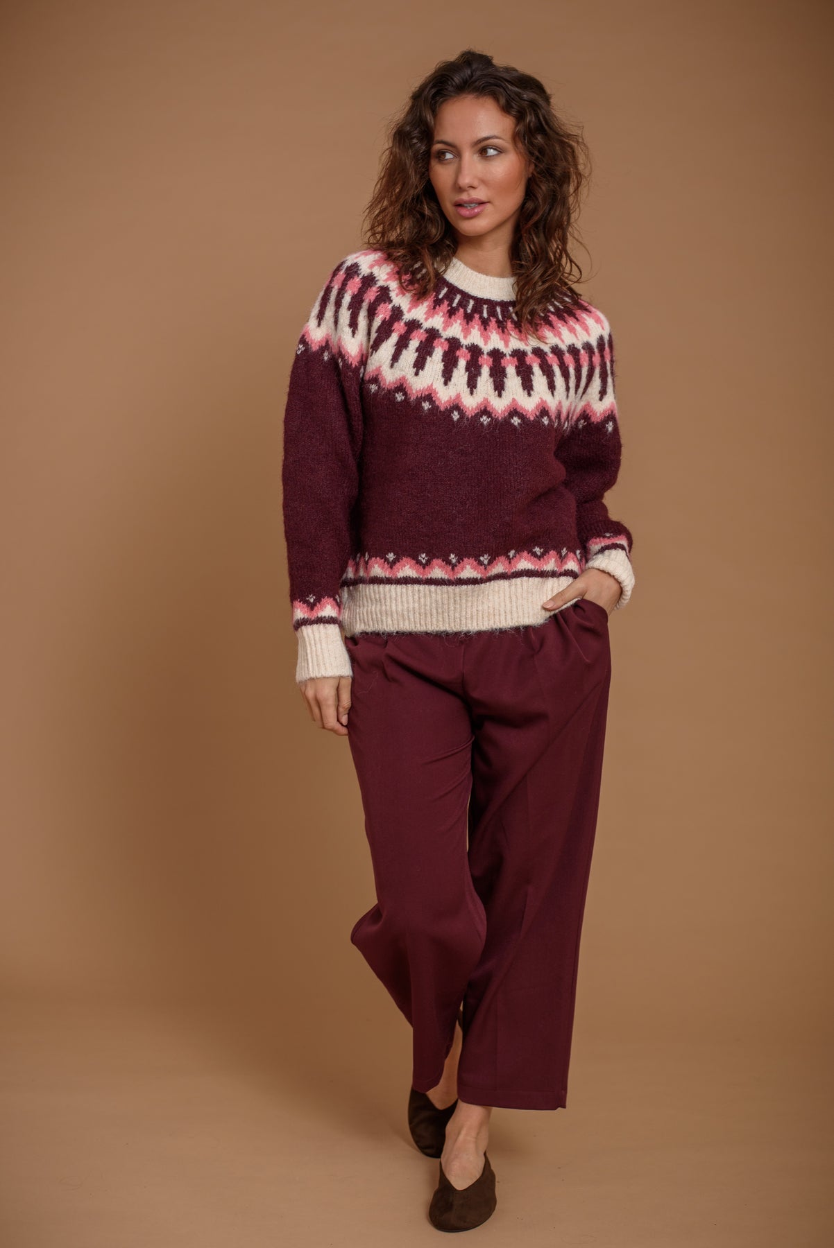 Jersey grecas en tono borgoña. Un básico atemporal en los colores de la temporada. Favorecedor, suave y super confortable.