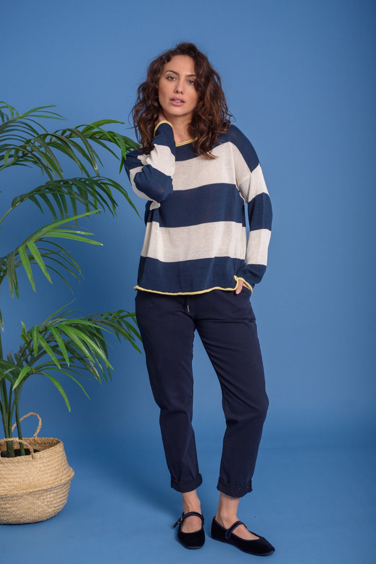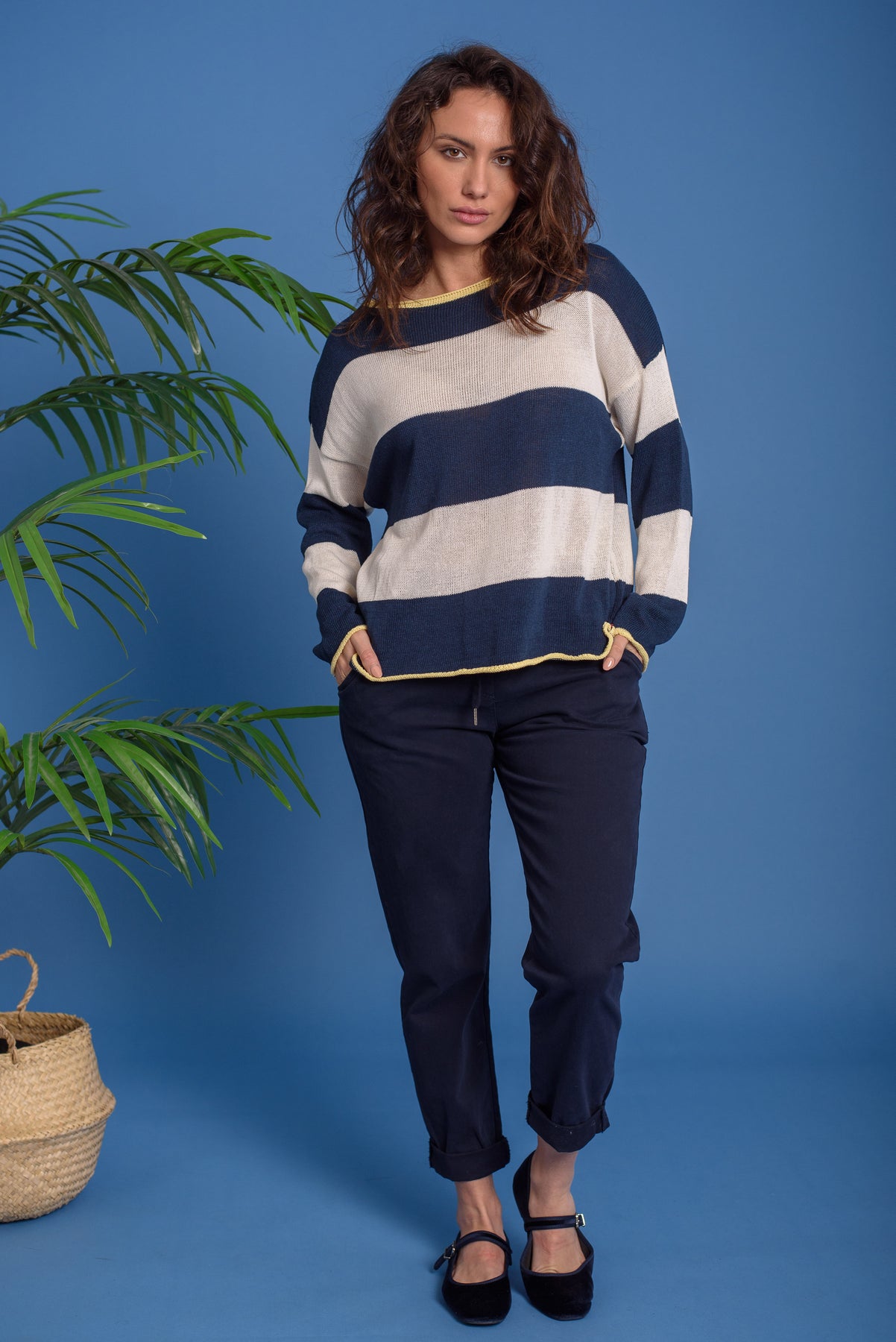 Jersey punto de algodón. Estampado a rayas. Cuello, bajo y puños con tira a contraste.
