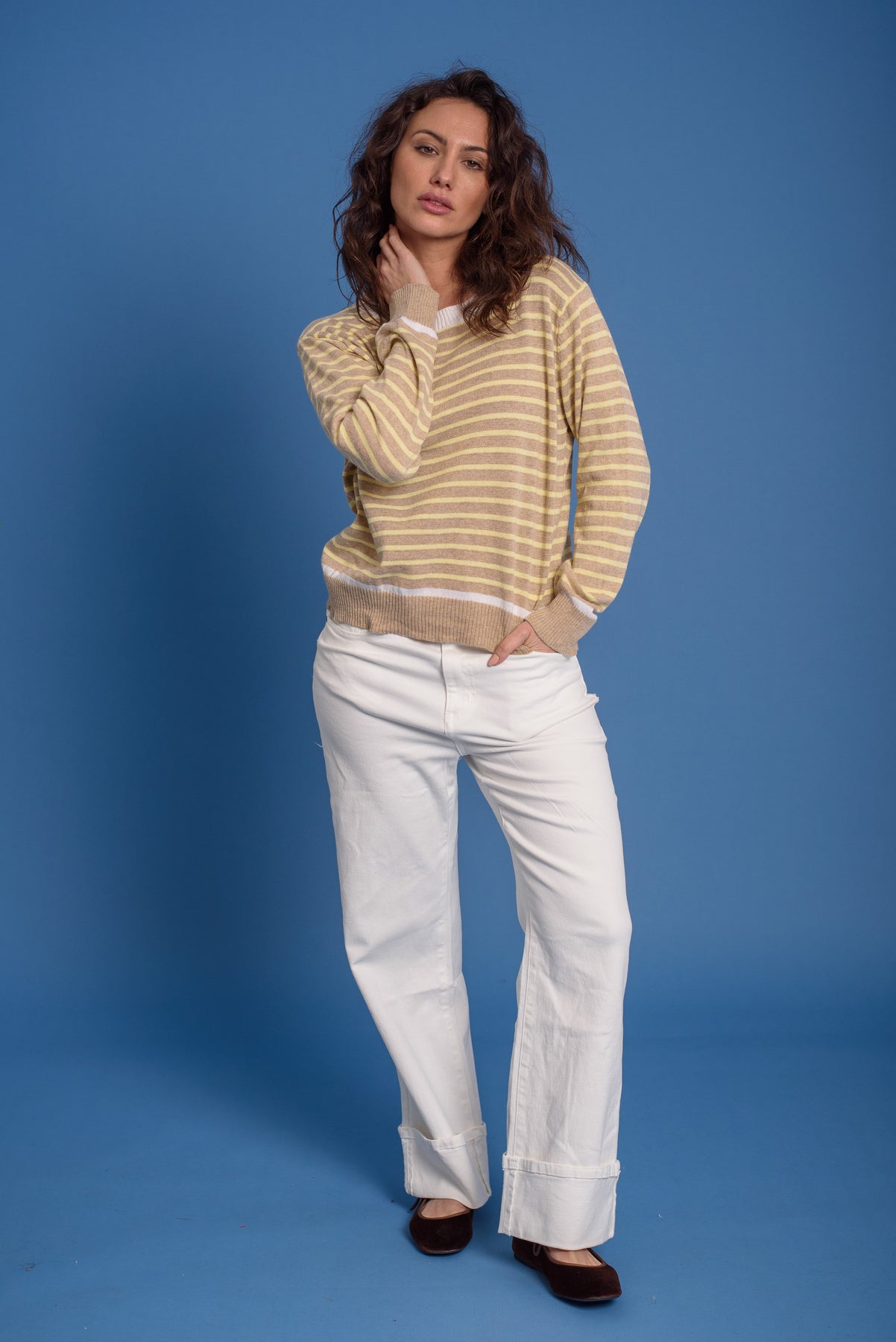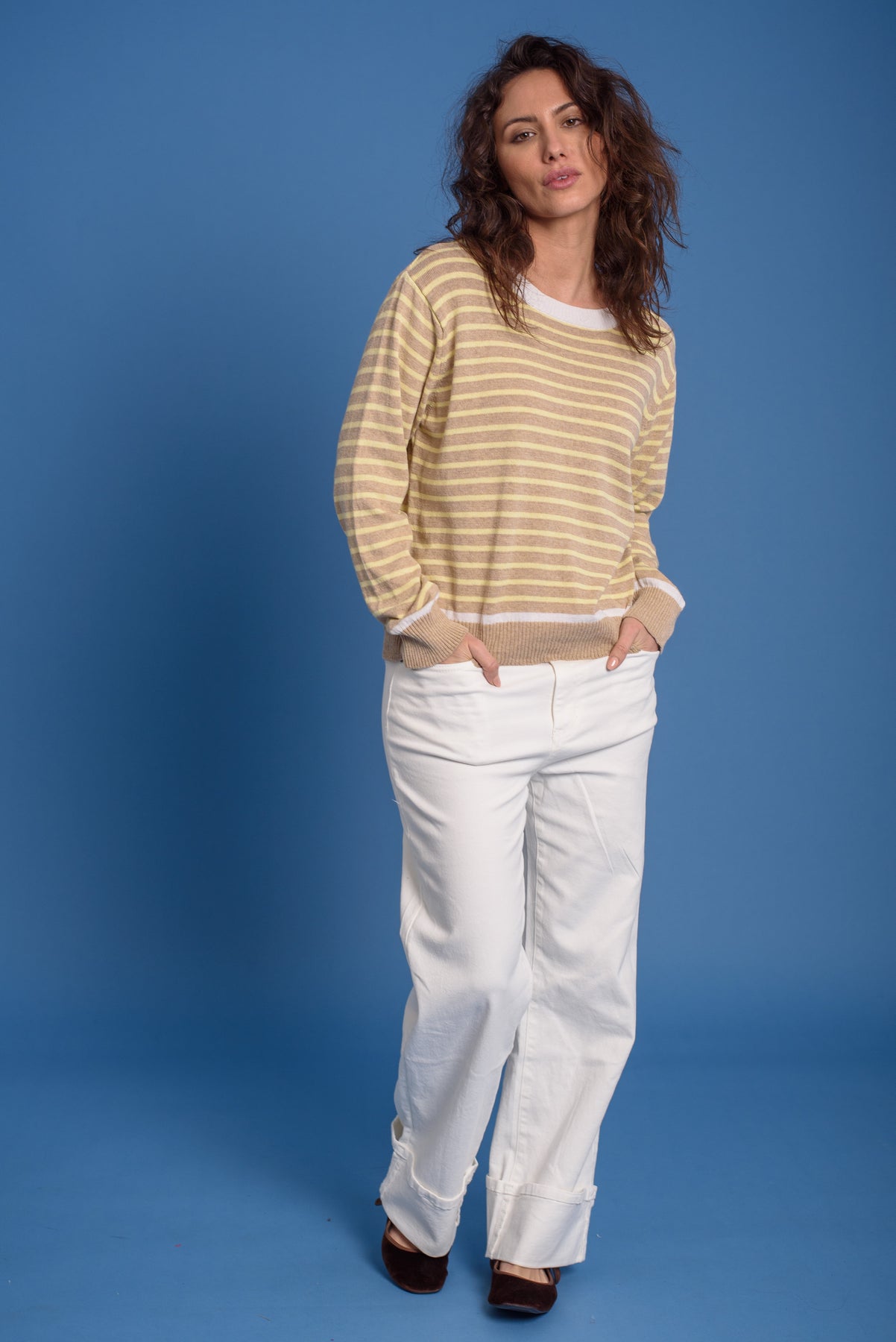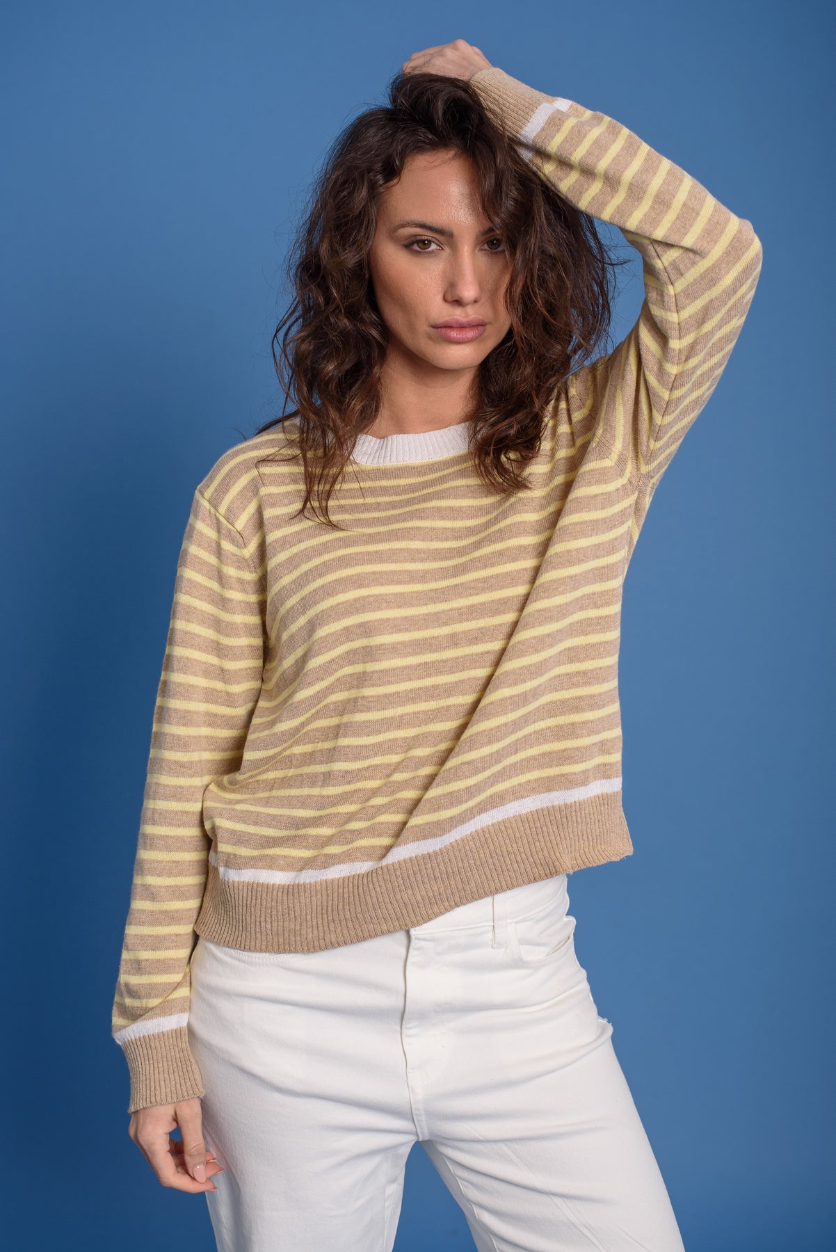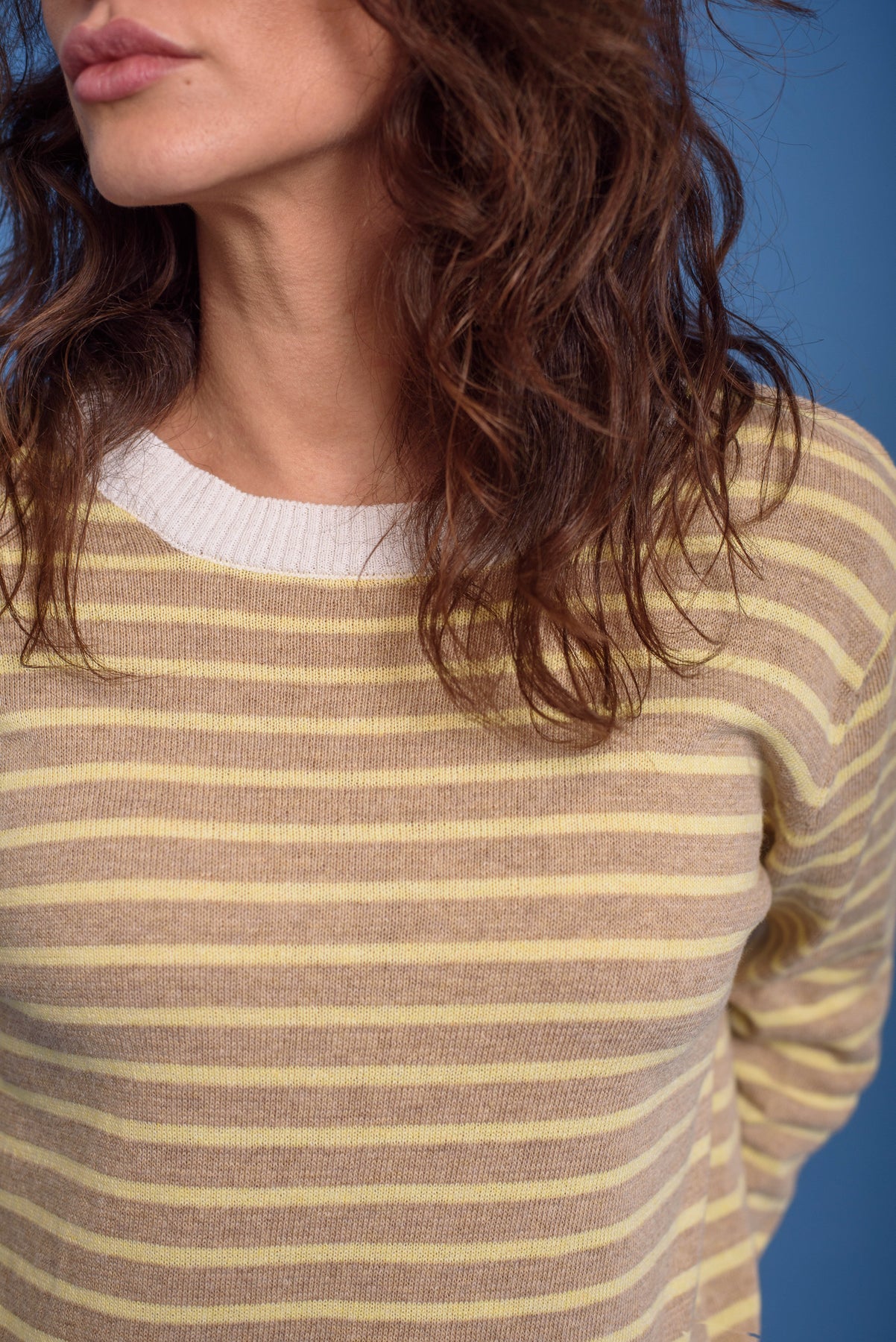 Jersey punto de algodón. Estampado a rayas en tonos camel y amarillo. Cuello redondo.