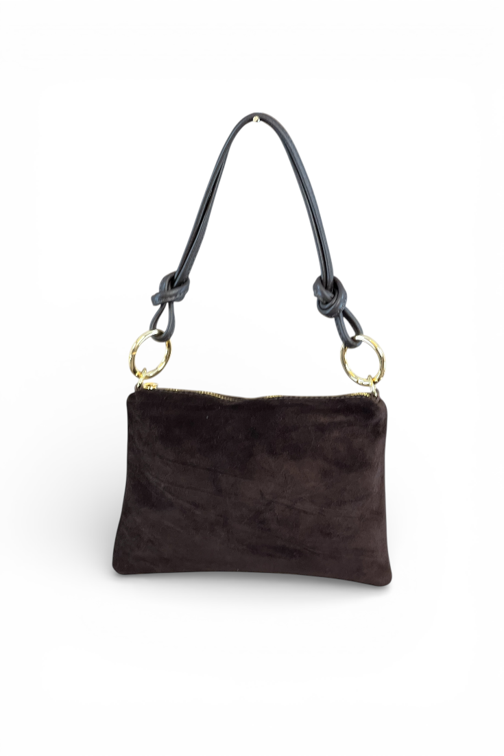 Bolso pequeño, asa corta con nudo, y asa larga adicional para llevar en bandolera. Cierre cremallera.