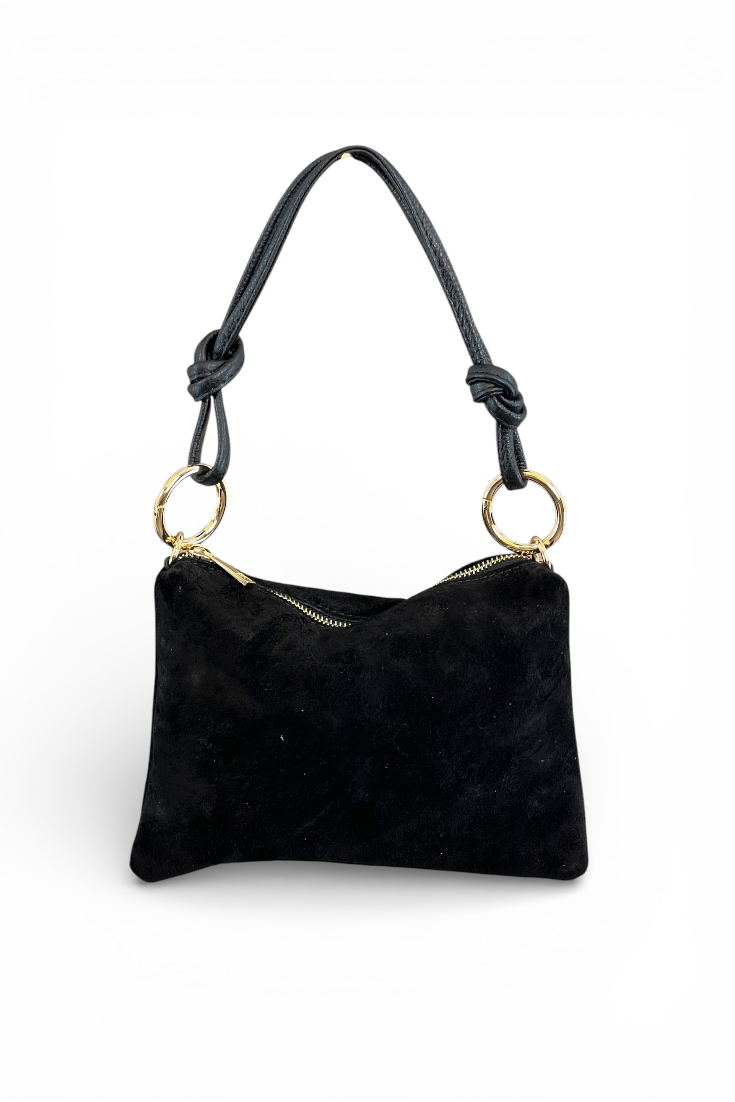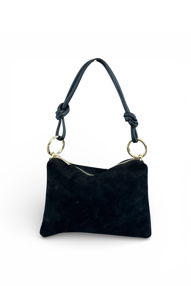 Bolso pequeño, asa corta con nudo, y asa larga adicional para llevar en bandolera. Cierre cremallera.