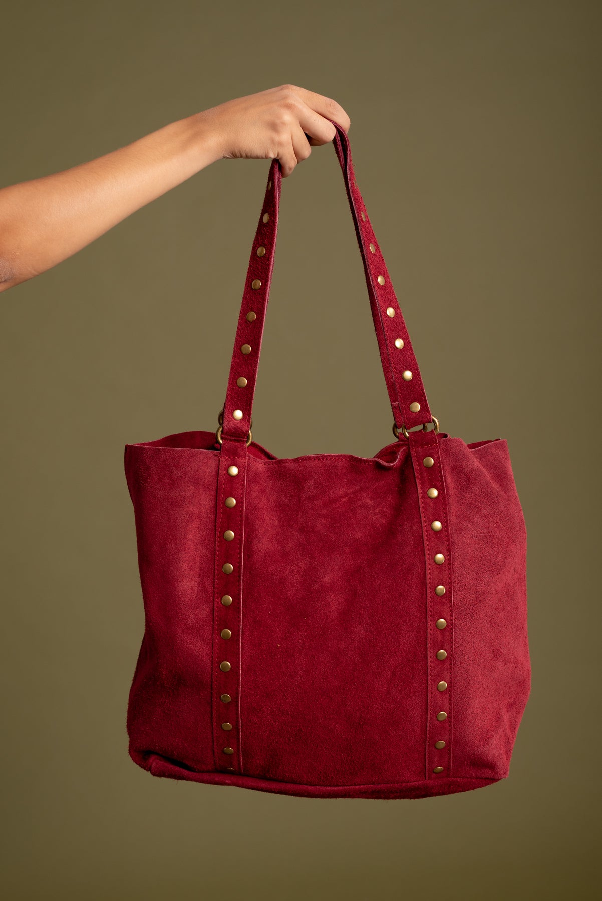 Bolsto estilo shopper. Serraje con detalle de tachuelas. Cierre cremallera.