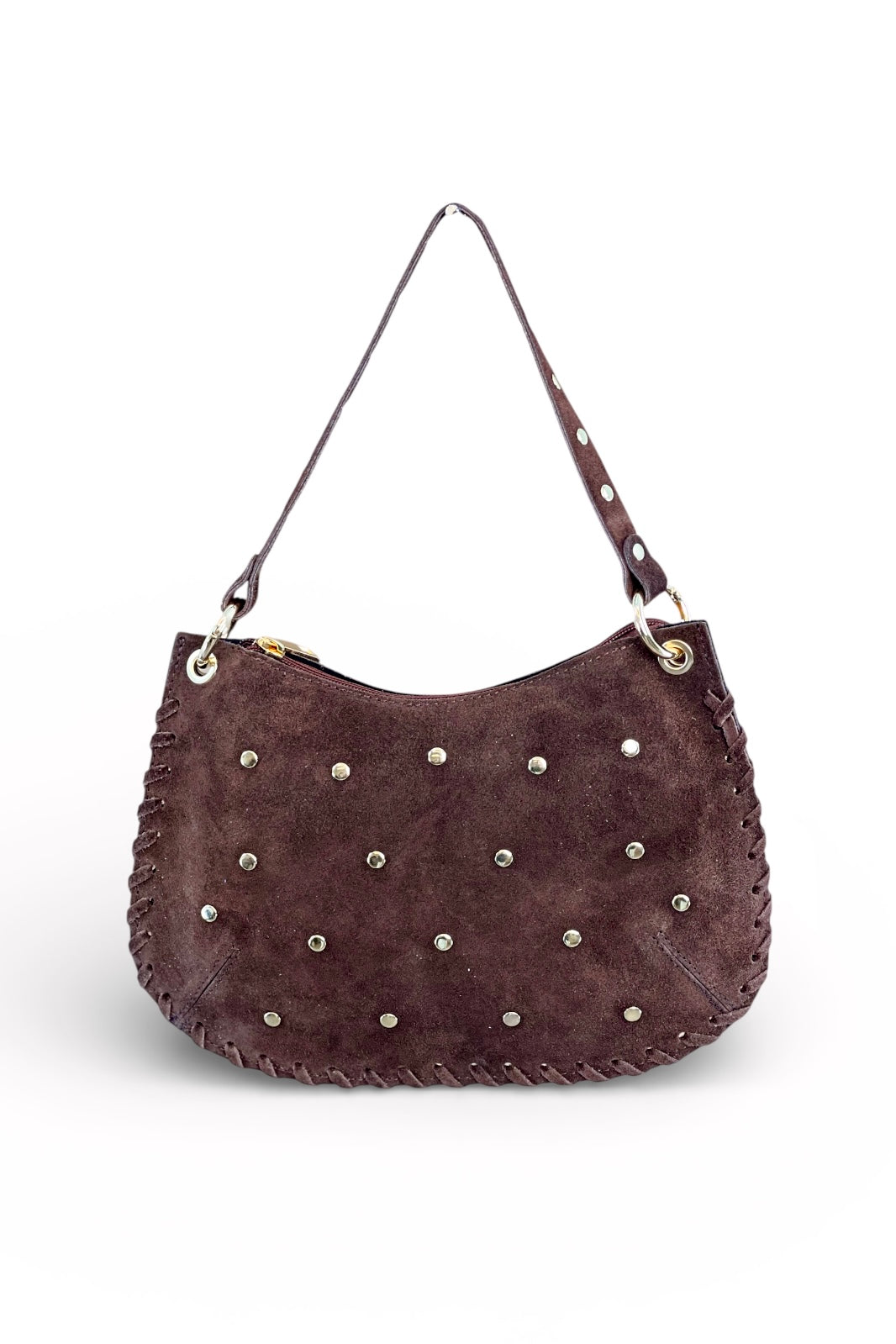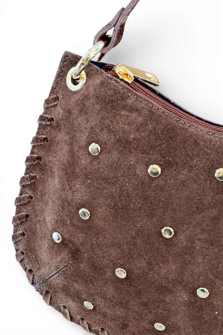 Bolso luna, asa corta con tachuelas y larga adicional. Serraje con tachuelas doradas.