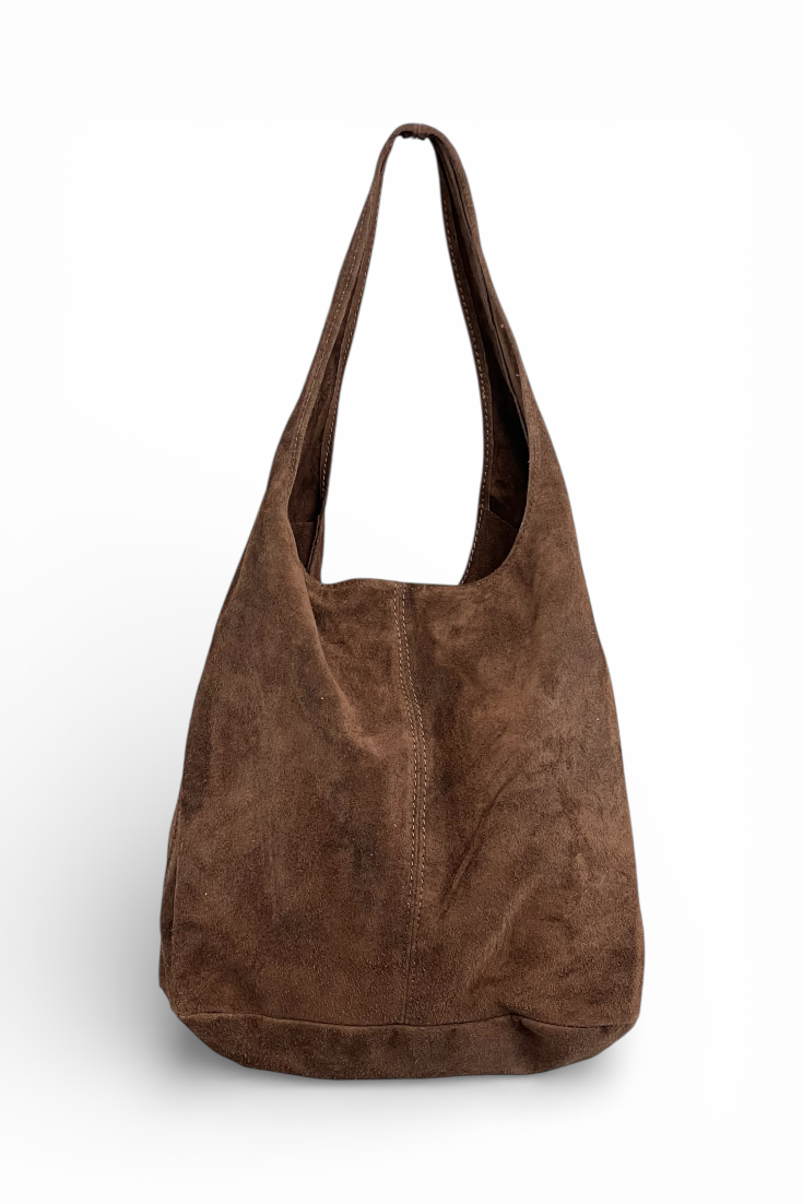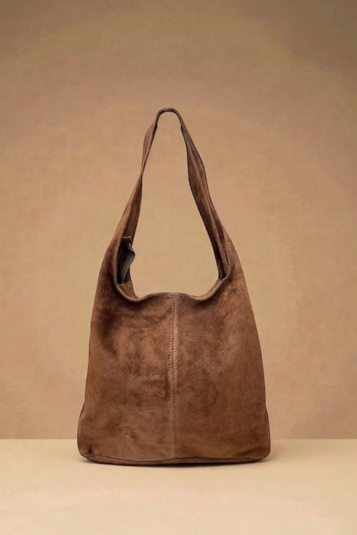 Bolso estilo saco de ante. Una sola asa. Cierre cremallera.