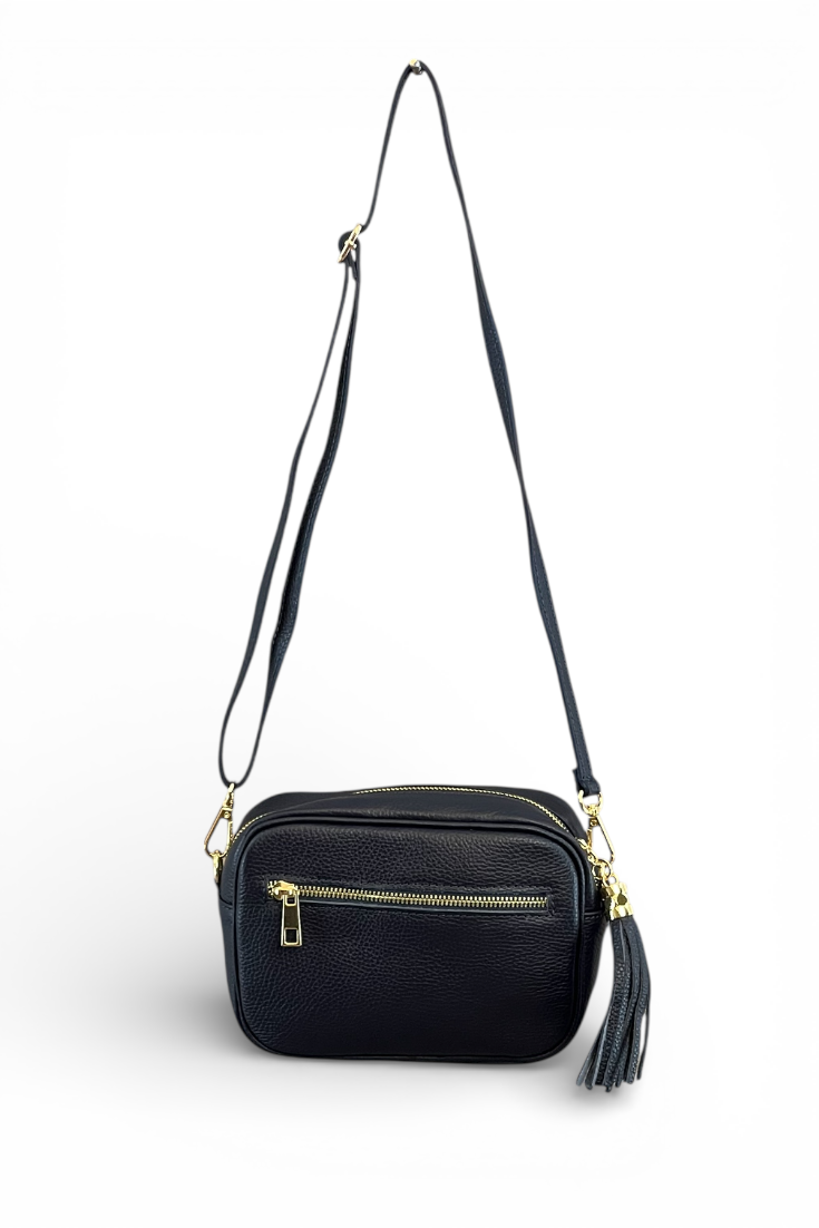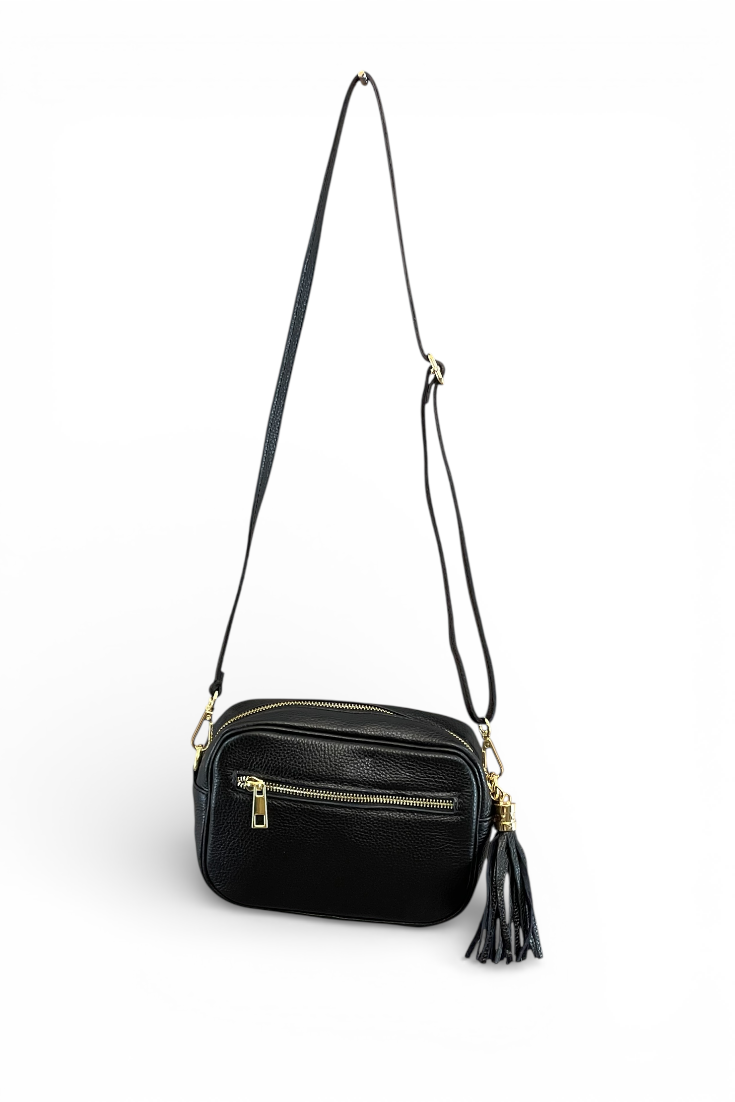 Bandolera de piel. Bolsillo cremallera en uno de los lados. Cierre cremallera.