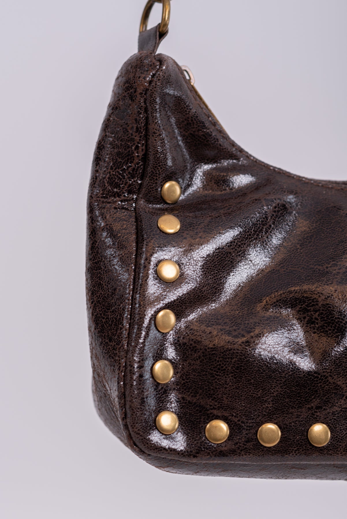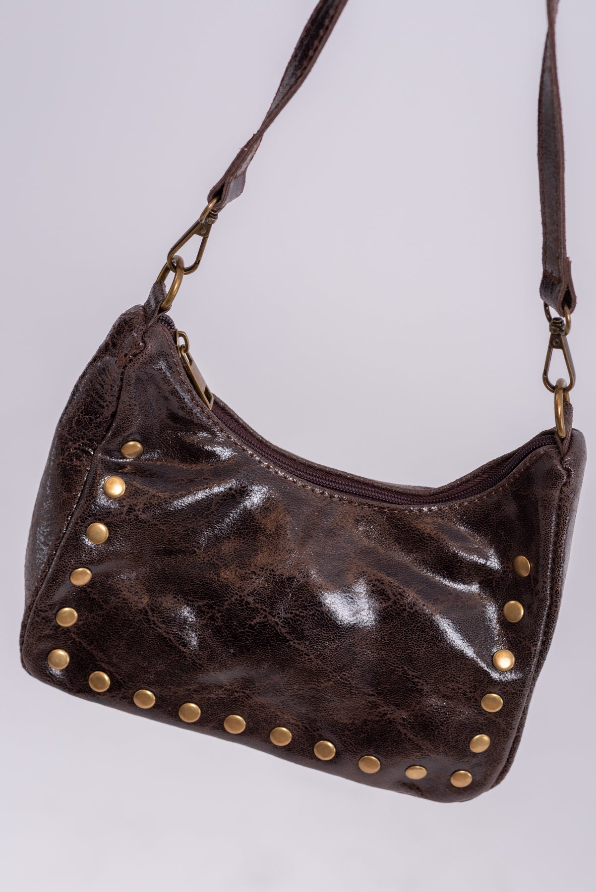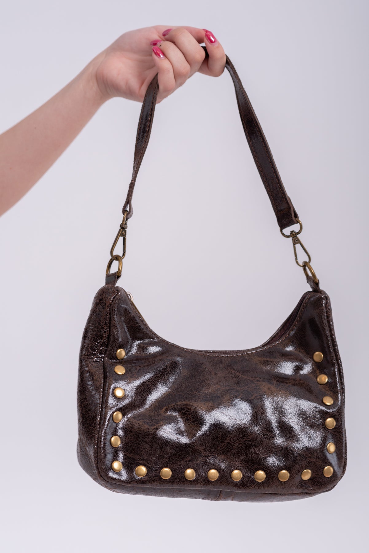 Bolso piel con detalle de tachuelas doradas. Bandolera ajustable adicional.