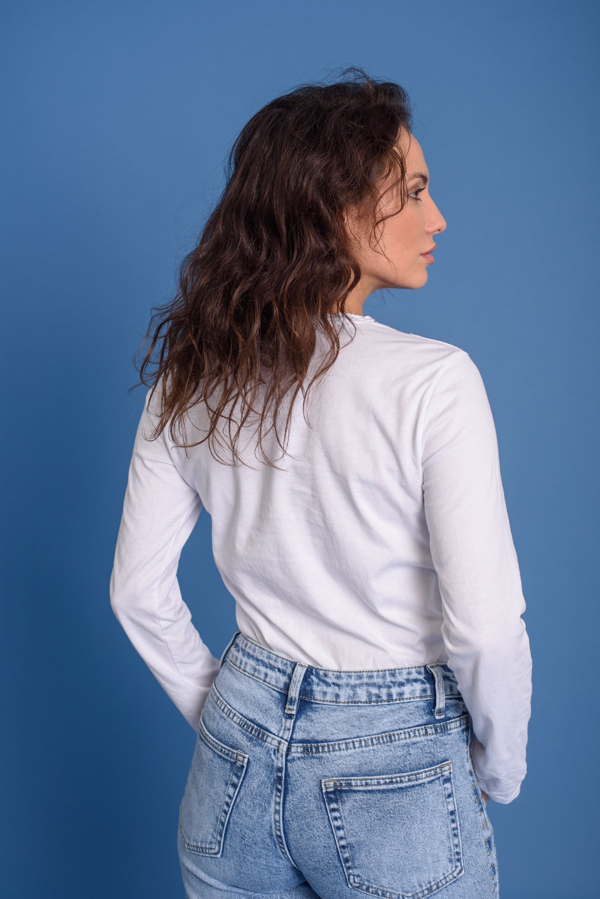 Camiseta básica con nuestro logo bordado al tono. Cuello redondo con detalle de volante tableado. Manga larga. Un fondo de armario imprescindible. Ideal en todos lo colores.