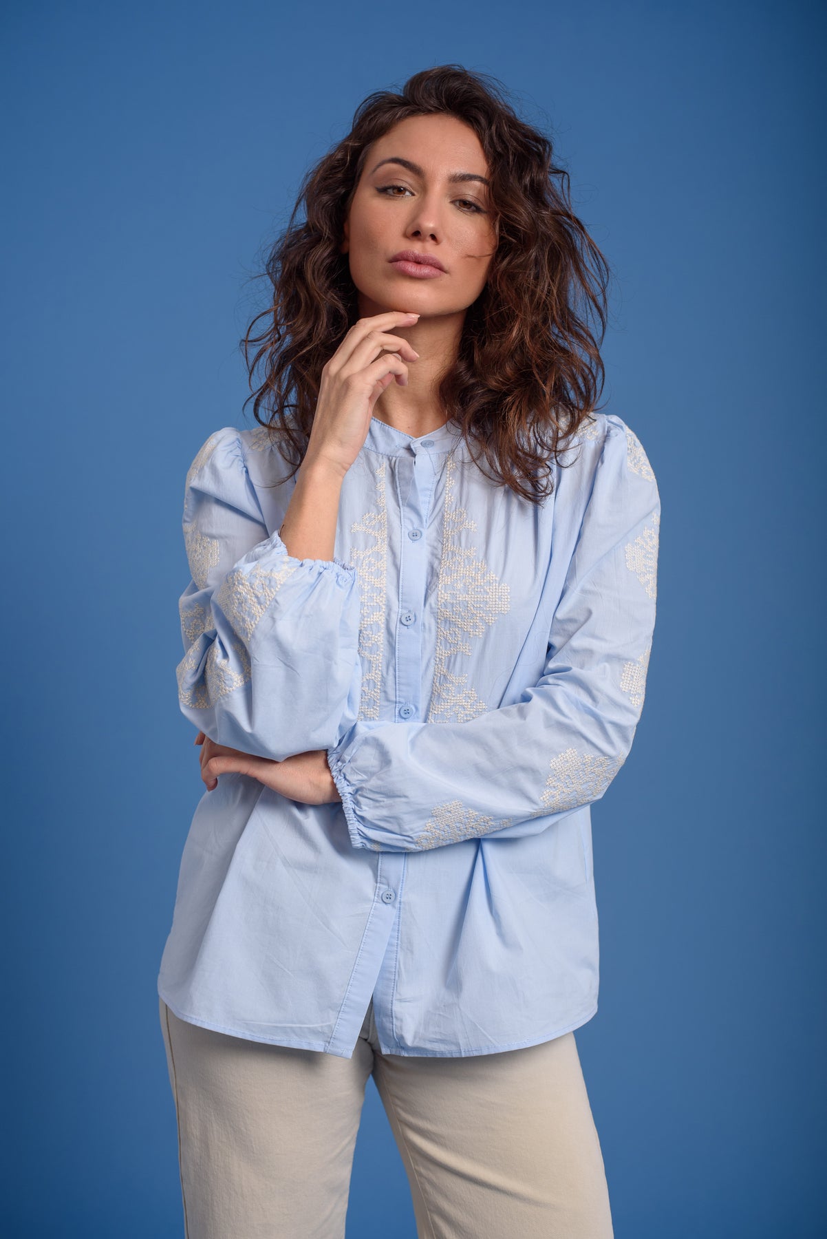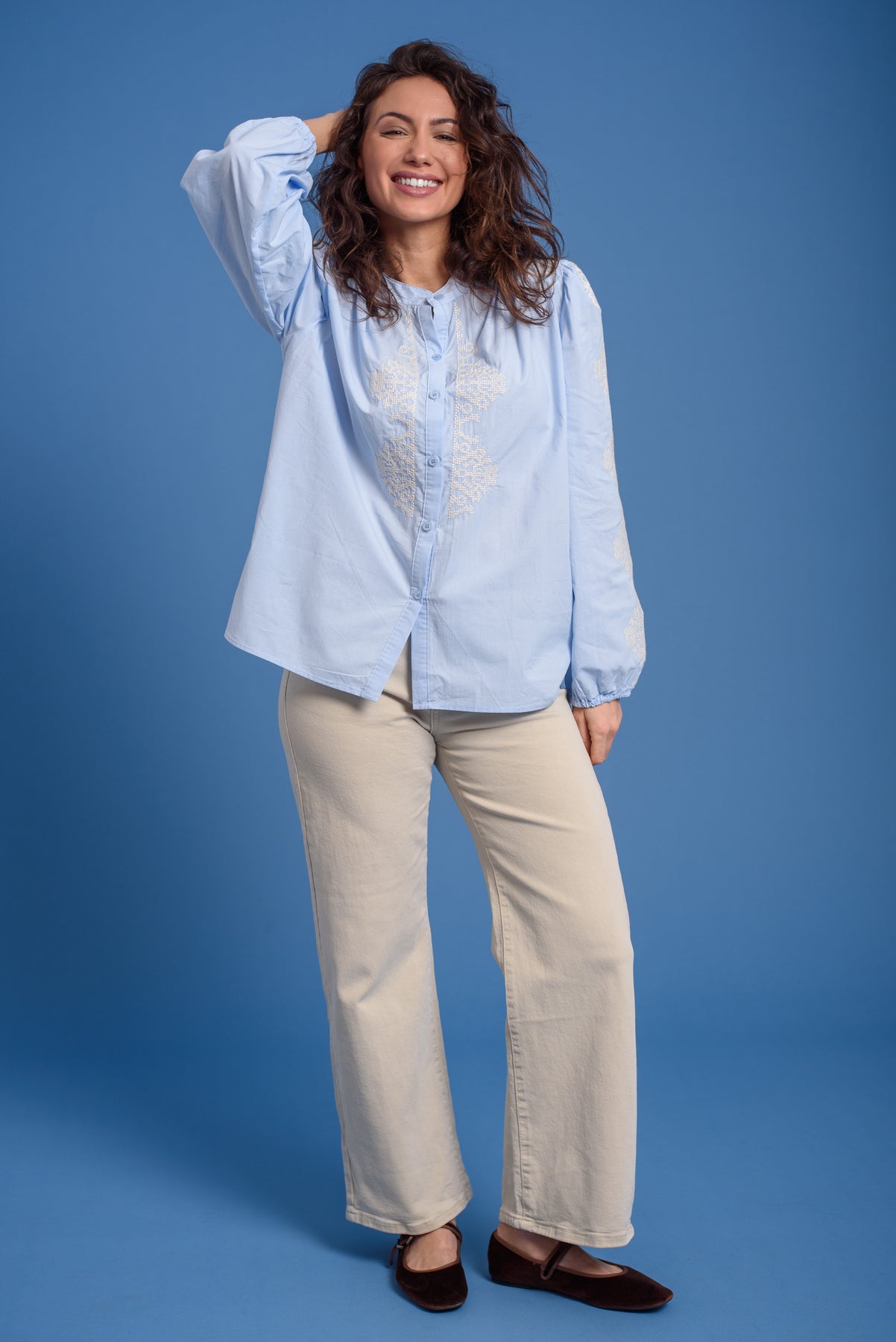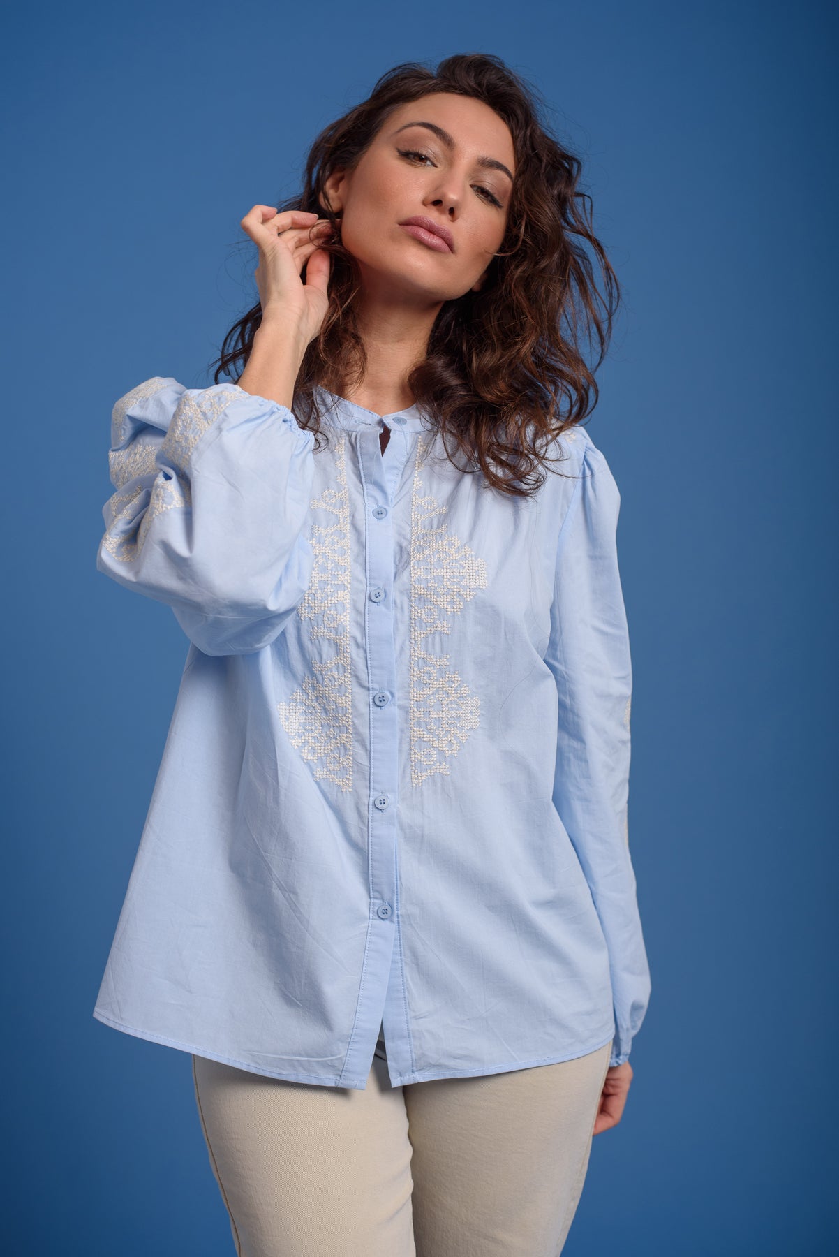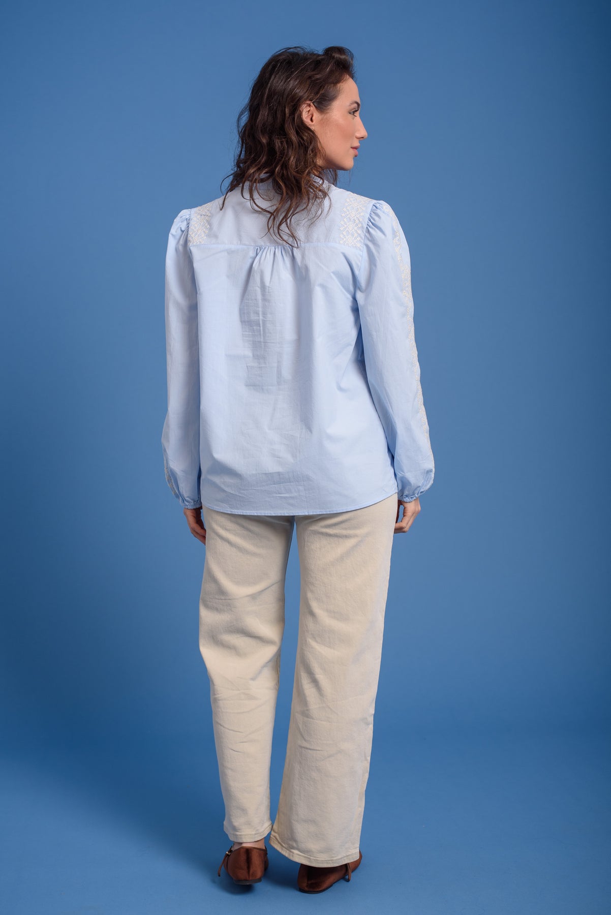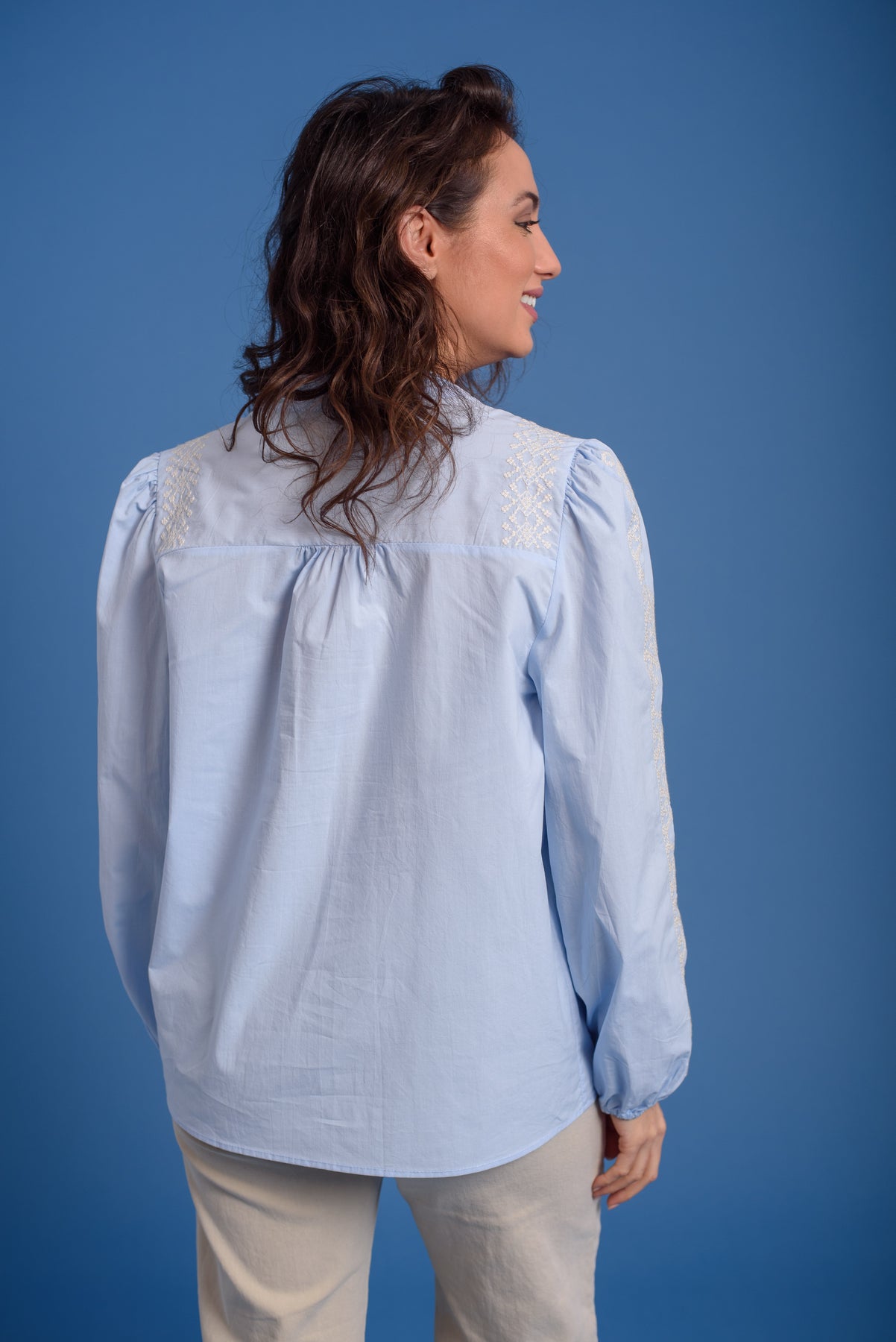 Blusa bordada en mangas y frontal. Cuello redondo. Manga larga con goma en el puño.