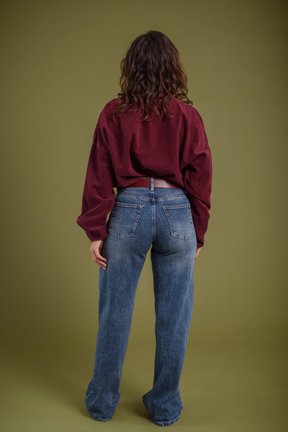 Blusa micropana. Abotonada en el frente. Cuello redondo con tirilla. Detalle de cintas con pompon. Manga larga con cierre botón en el puño.