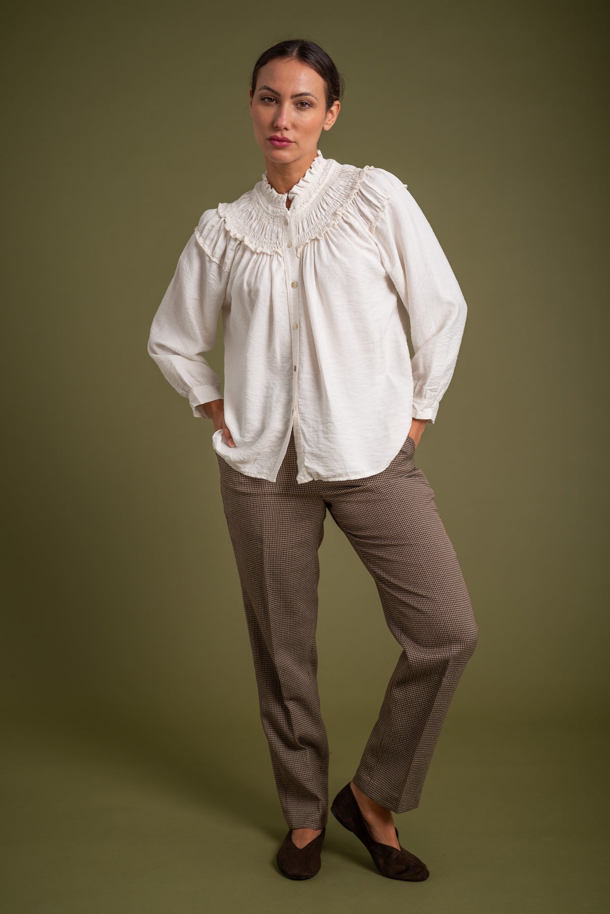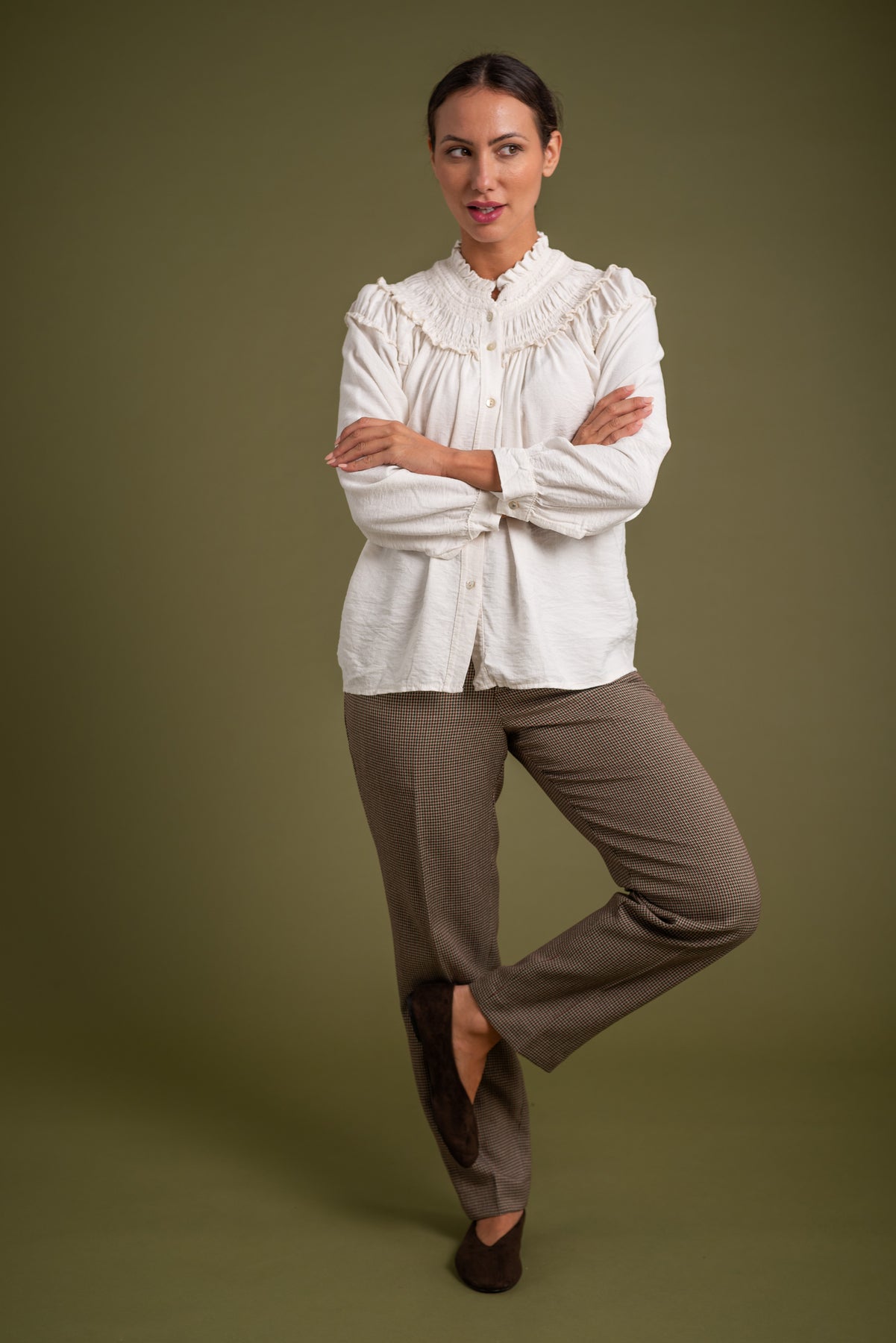 Blusa tejido fluido. Cuello redondo con remate de tira engomada. Abotonada sobre el pecho. Manga larga con puño engomado y volante. Cómoda y super favorecedora. Ideal en todos los colores.