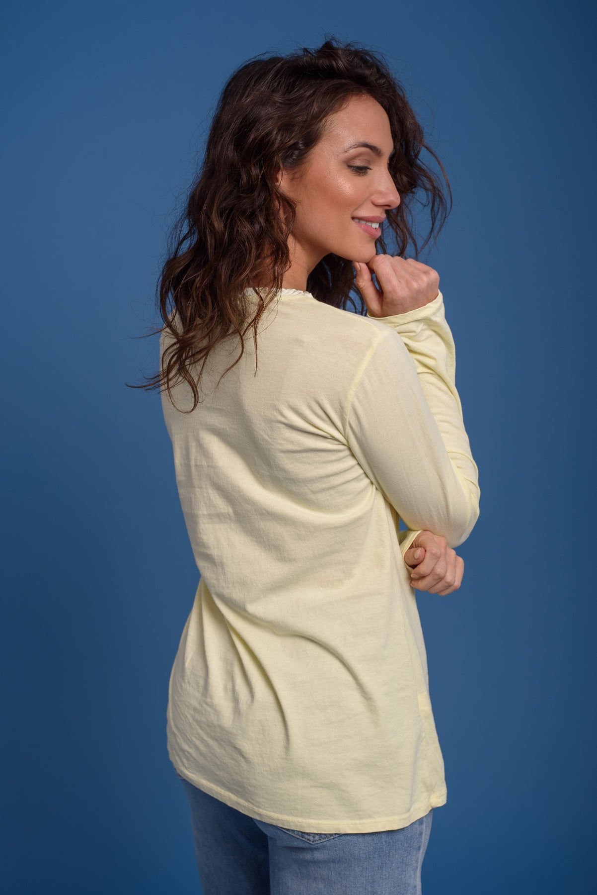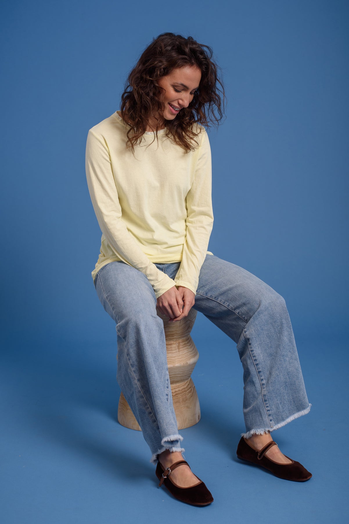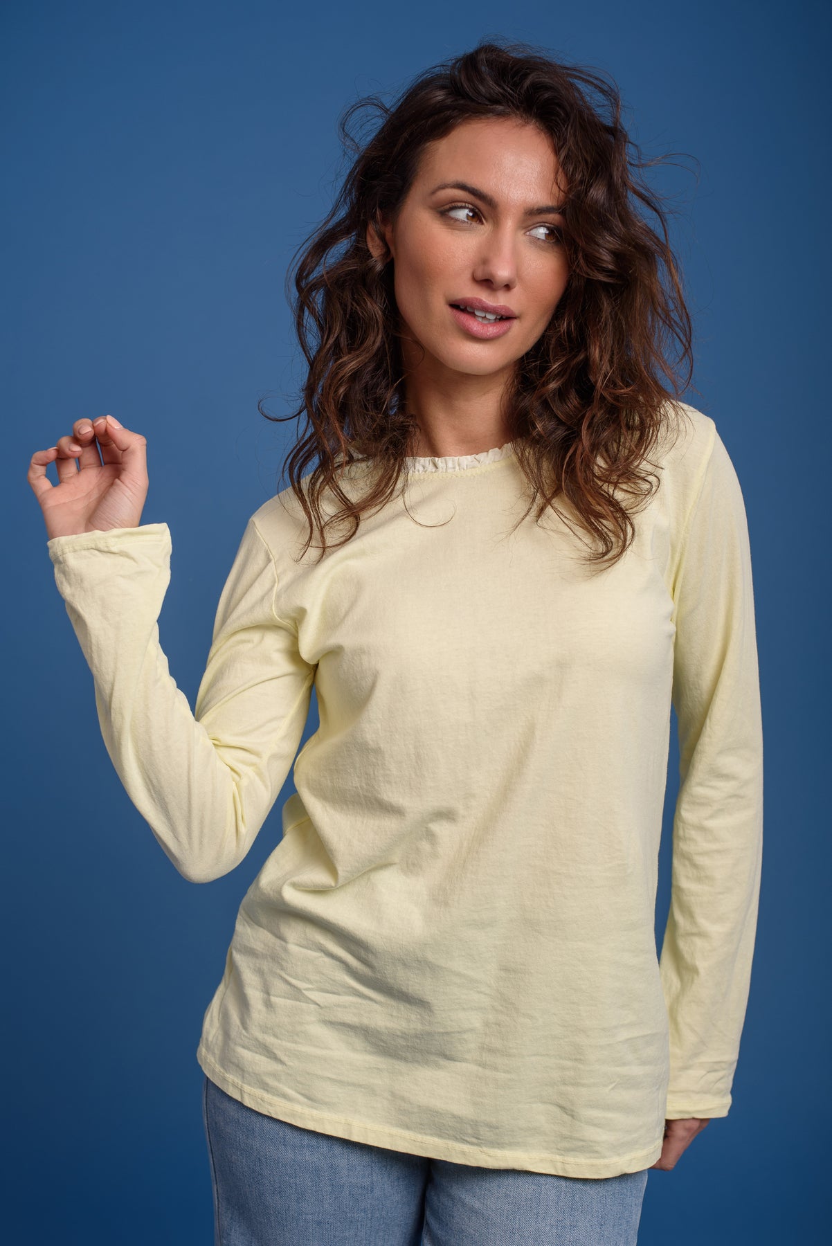 Camiseta básica con nuestro logo bordado al tono. Cuello redondo con detalle de volante tableado. Manga larga. Un fondo de armario imprescindible. Ideal en todos lo colores.