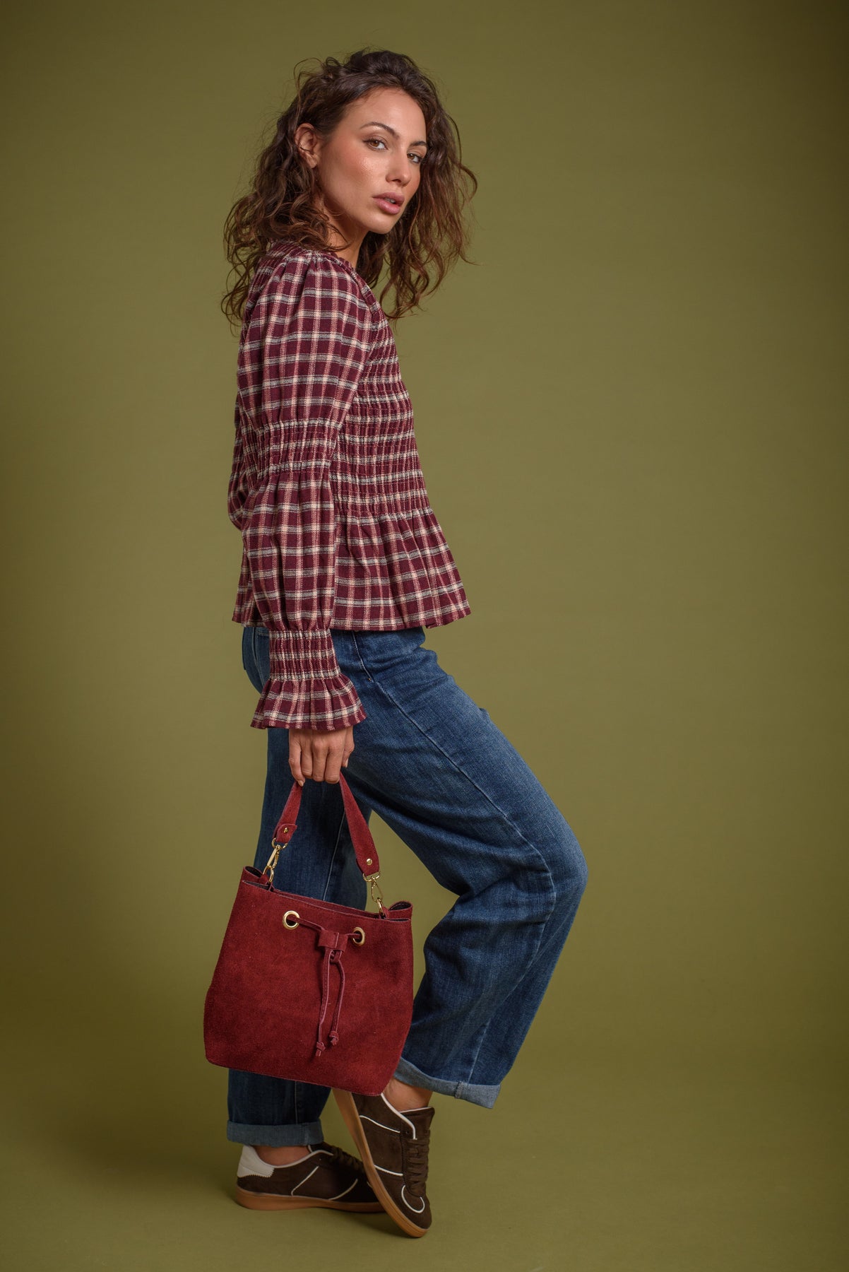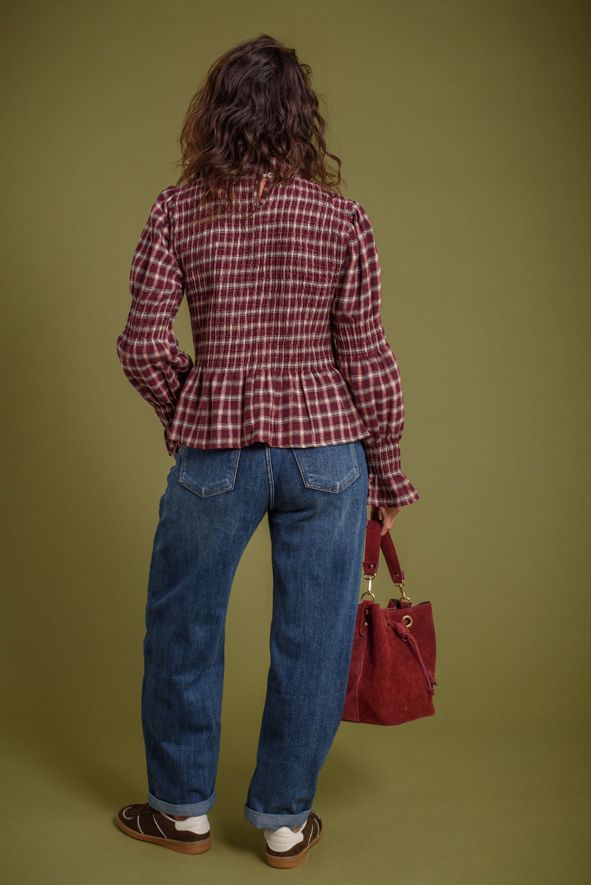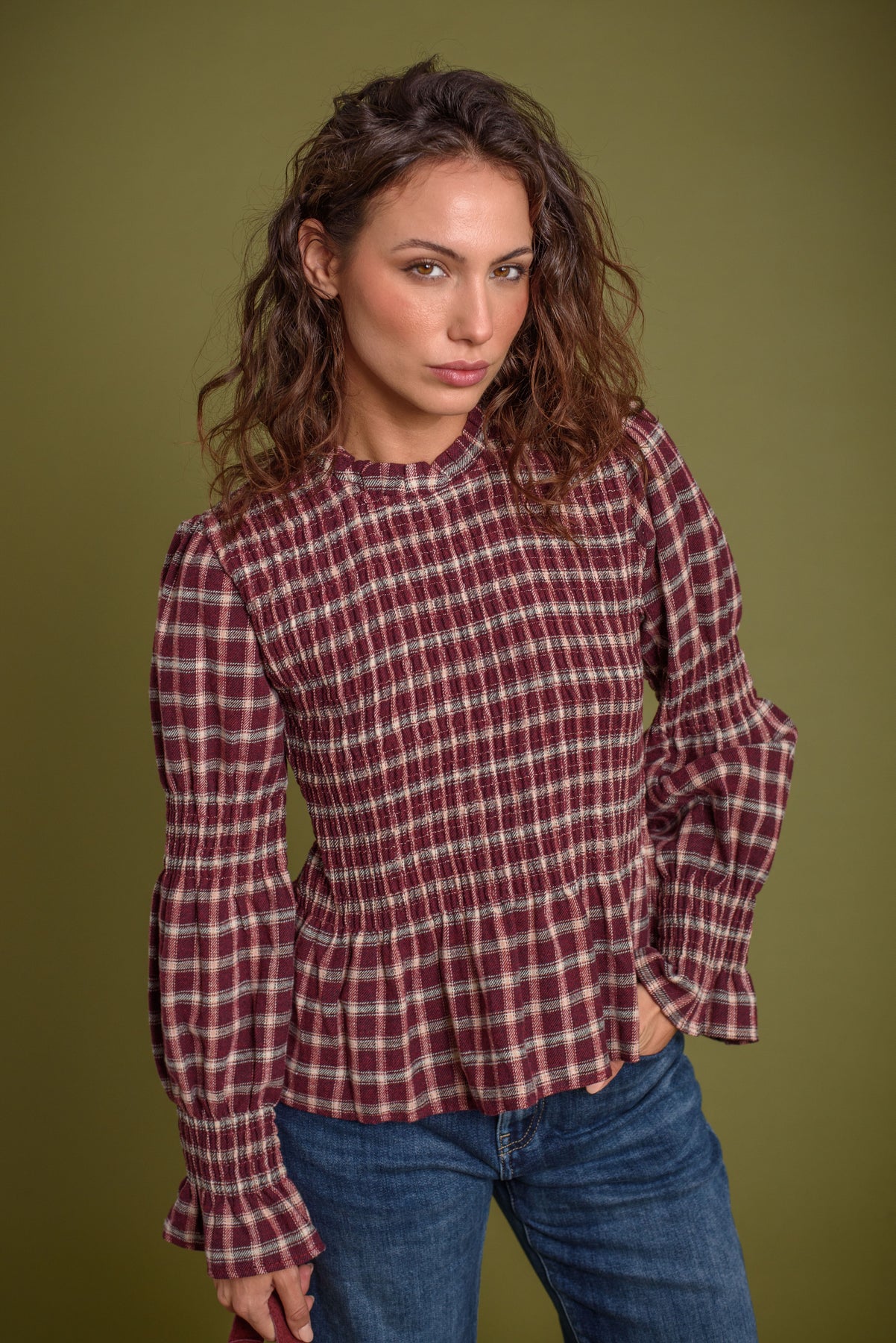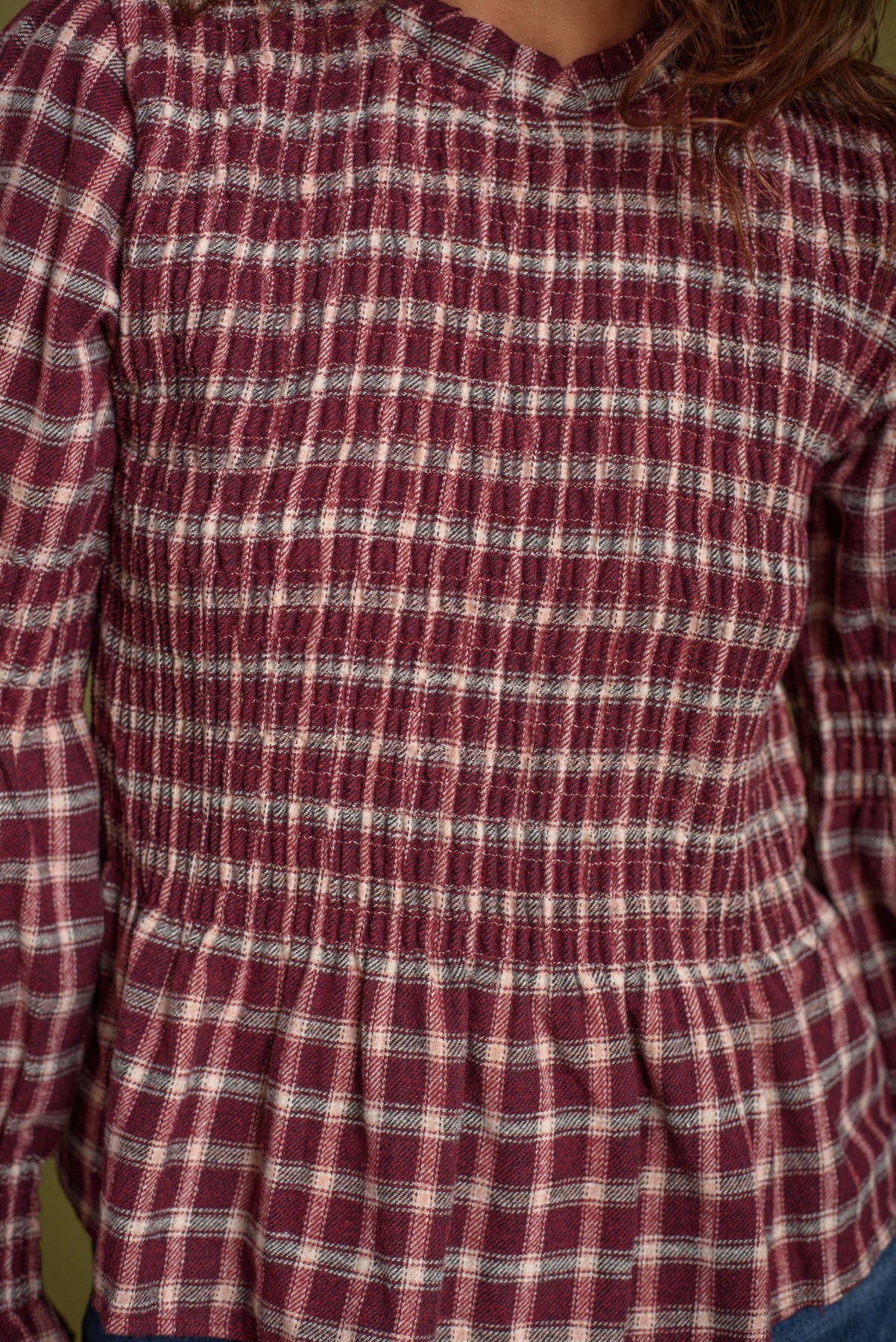 Blusa de cuello redondo y manga larga. Frunces de nido de abeja en pecho y en ambos brazos. Estampado vichy. Tejido tipo franela, calentito y super agradable.