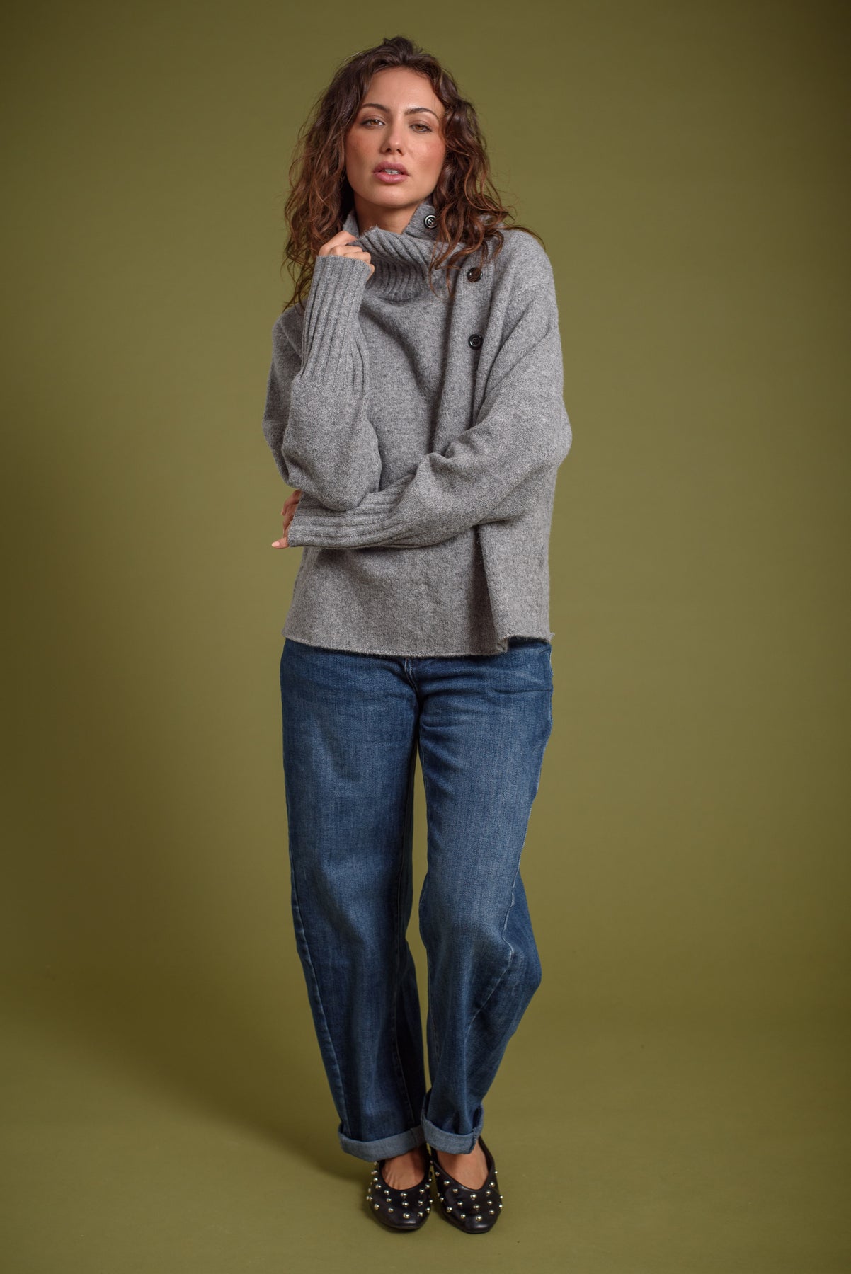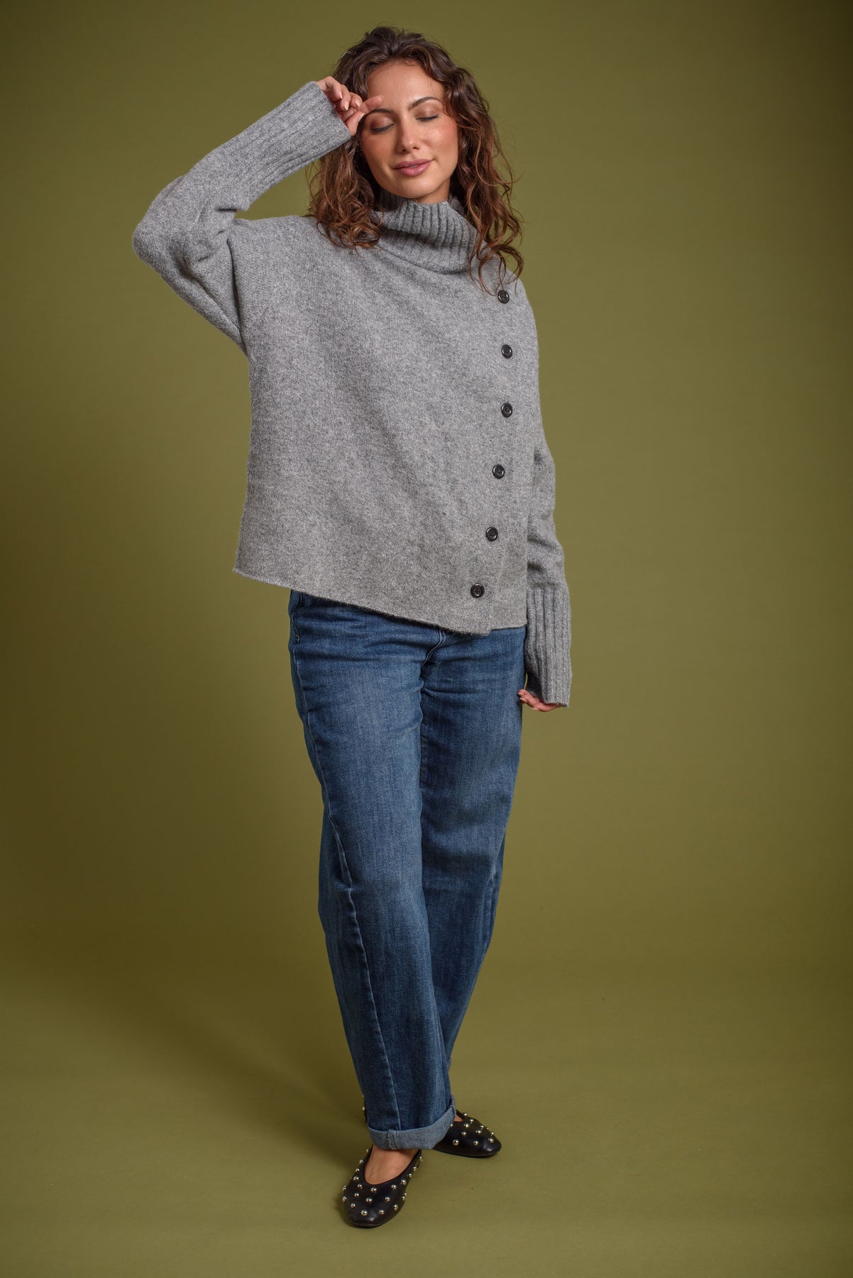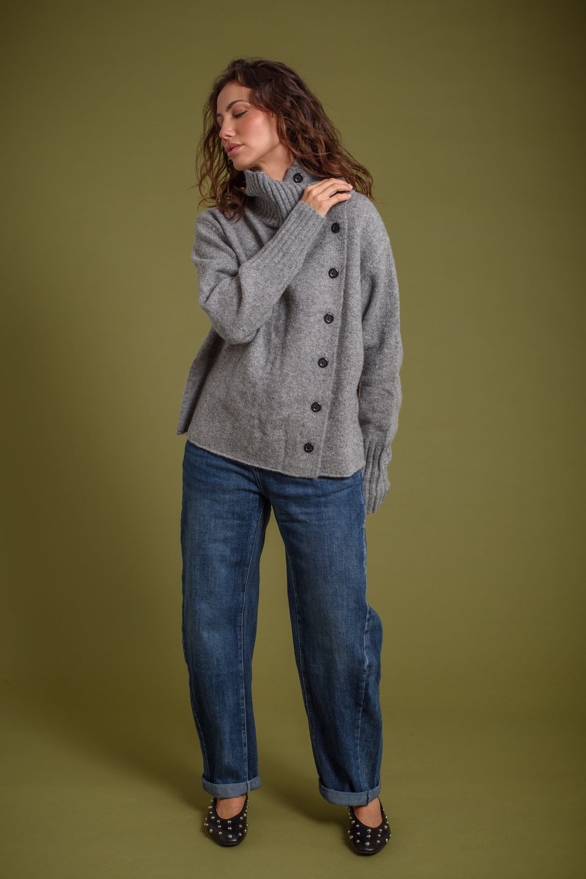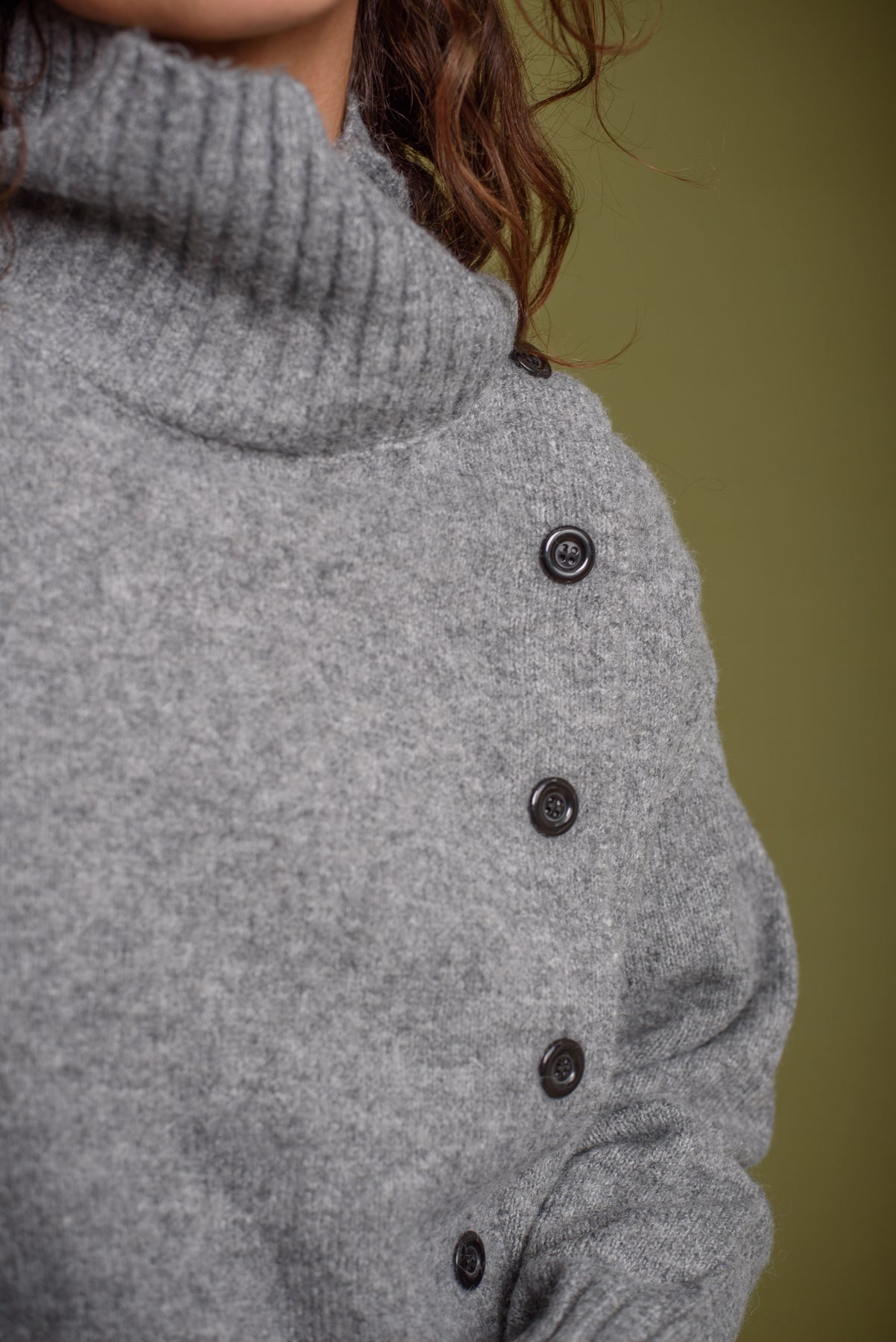 Jersey / Cardigan. Cuello alto. Detalle de hilera de botones que lo convierte en cardigan.