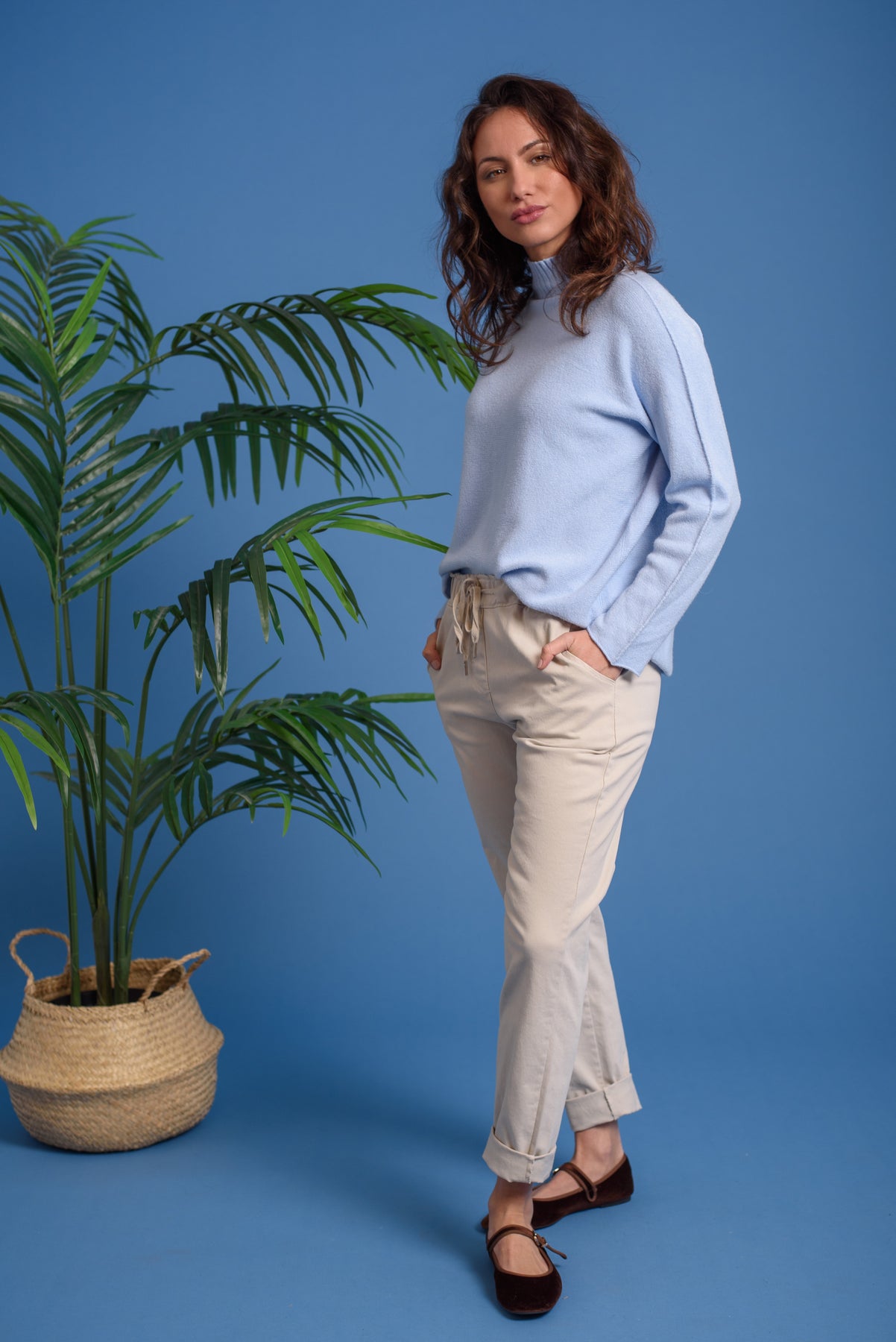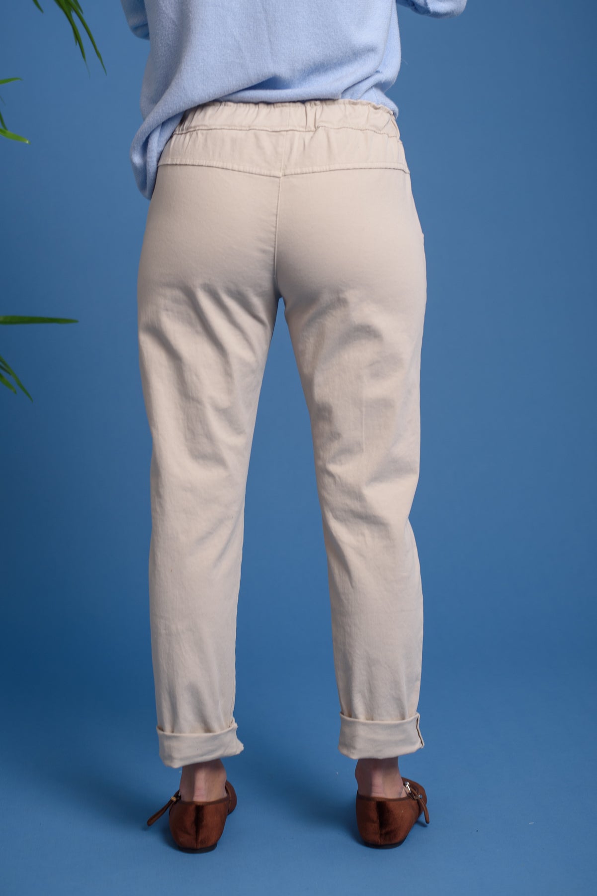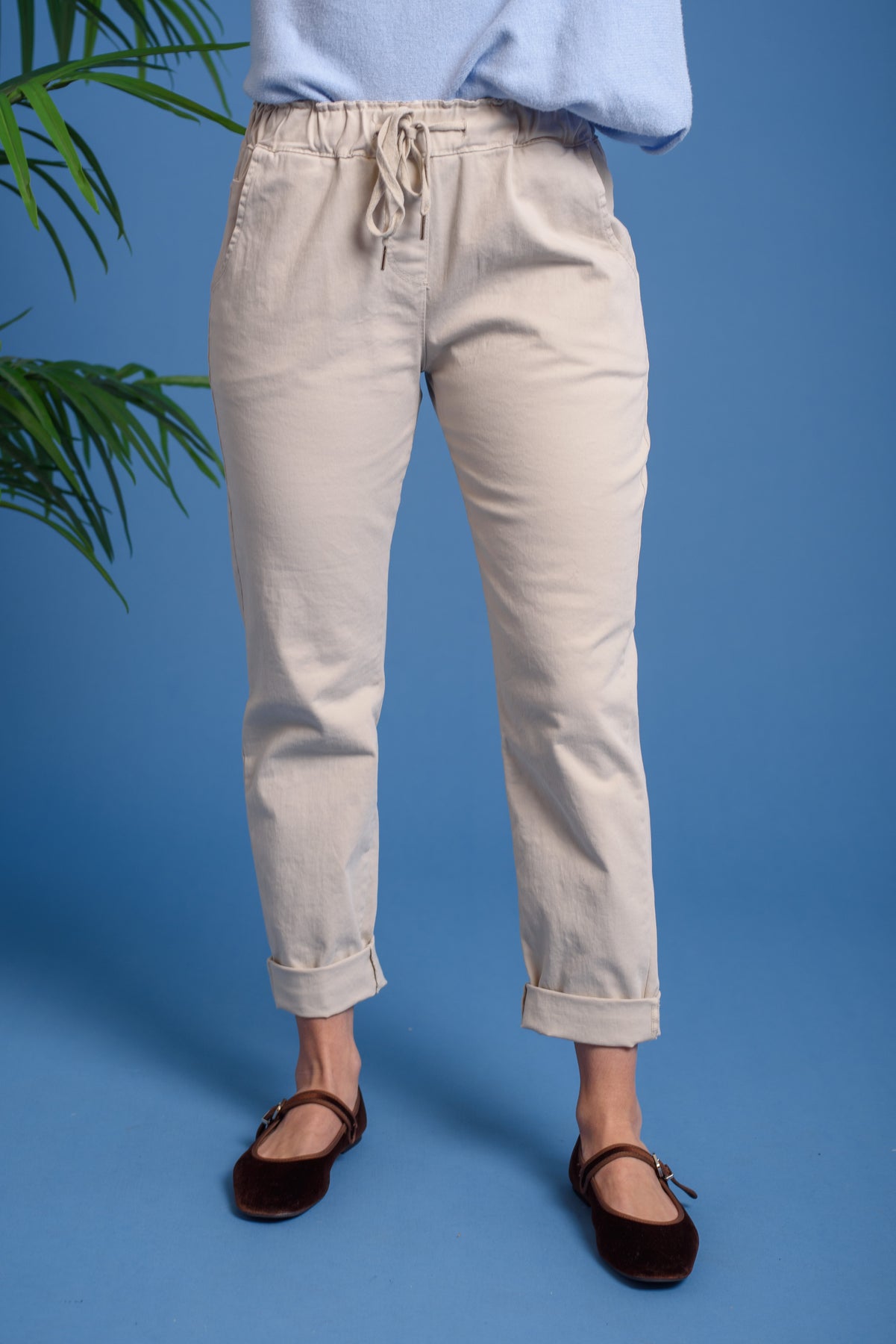 Pantalón tipo chino, con goma en cintura y cordón de ajuste. Bolsillos laterales. Cómodo y perfecto para toda la temporada. Básicos imprescindibles.
