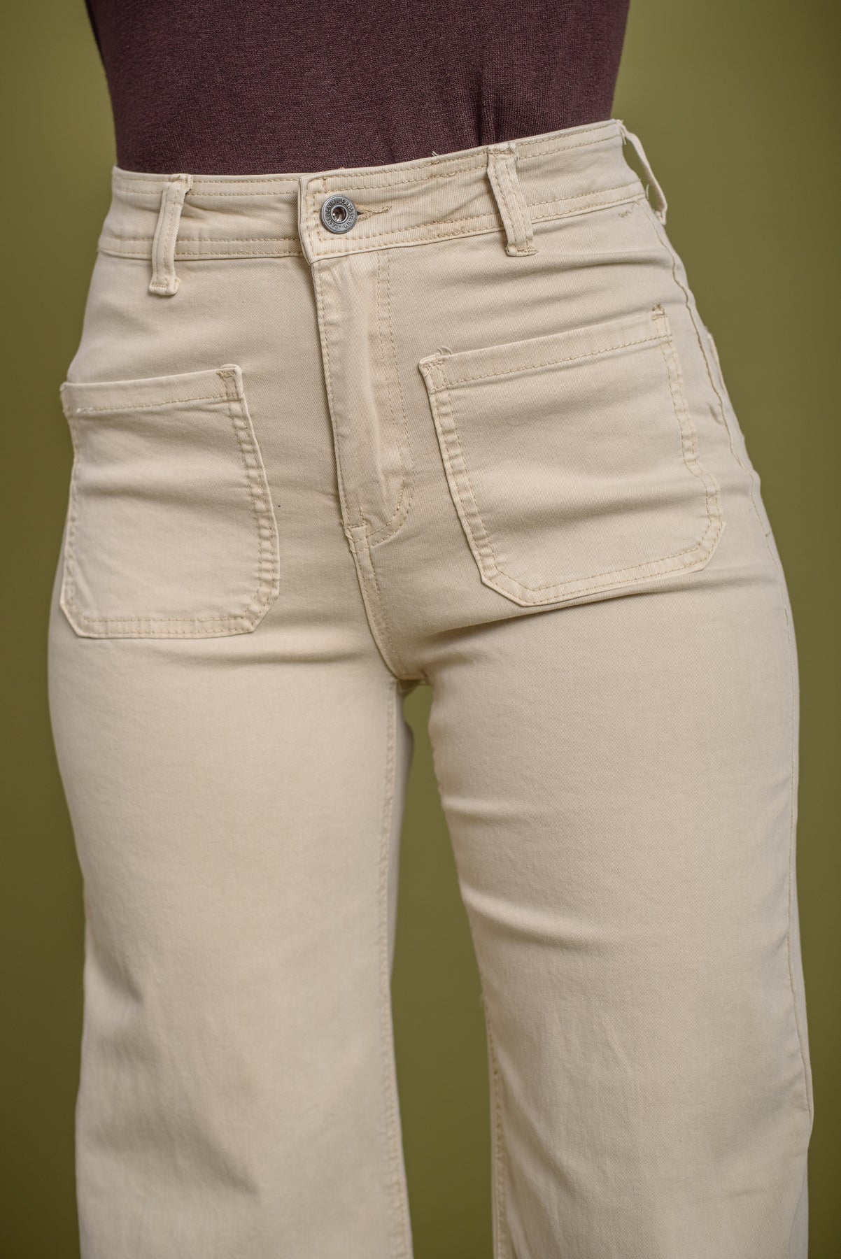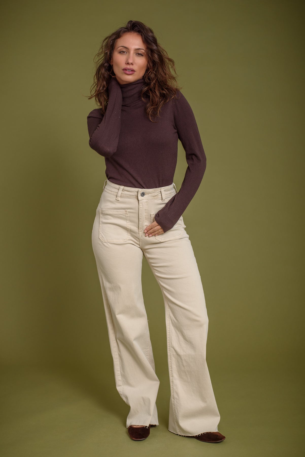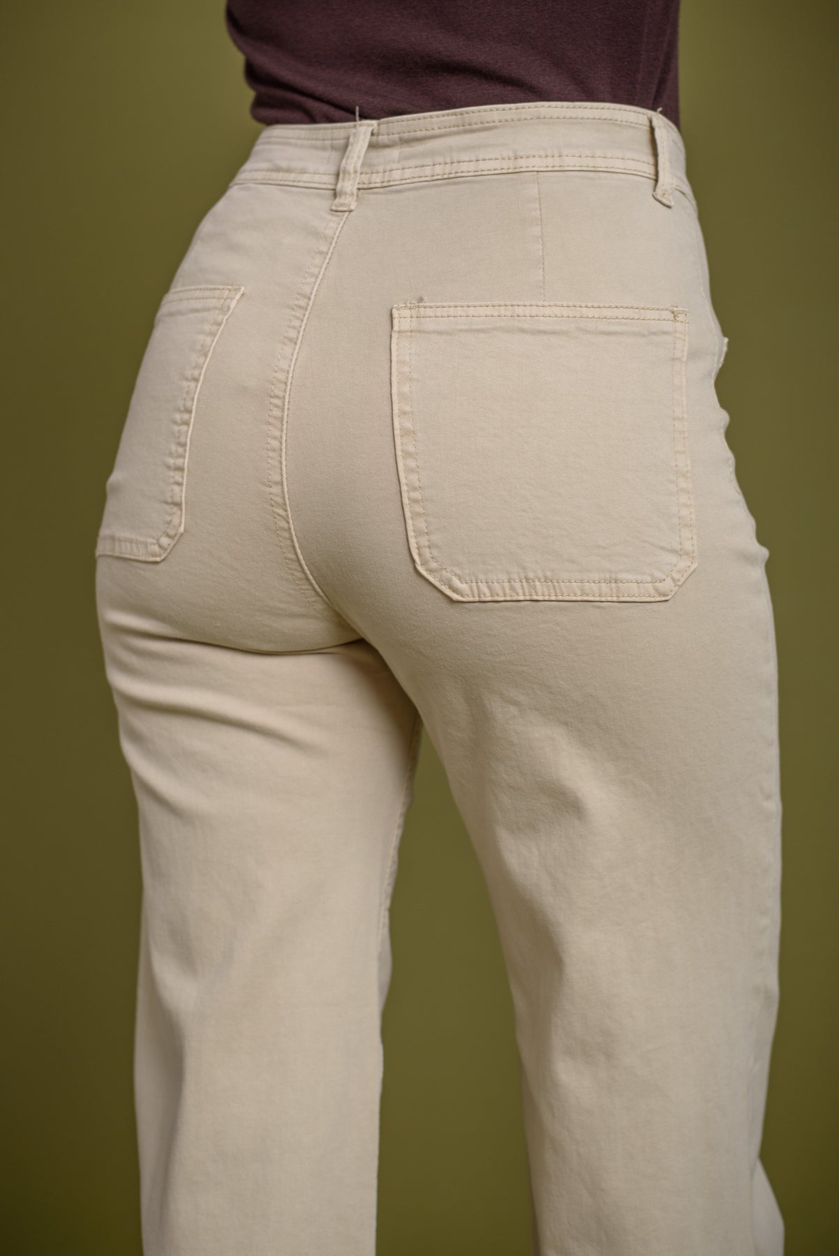 Pernera ancha con cierre de cremallera y botón. Bolsillos de plastron, Bajo cortado sin rematar. Ideal y muy favorecedor.