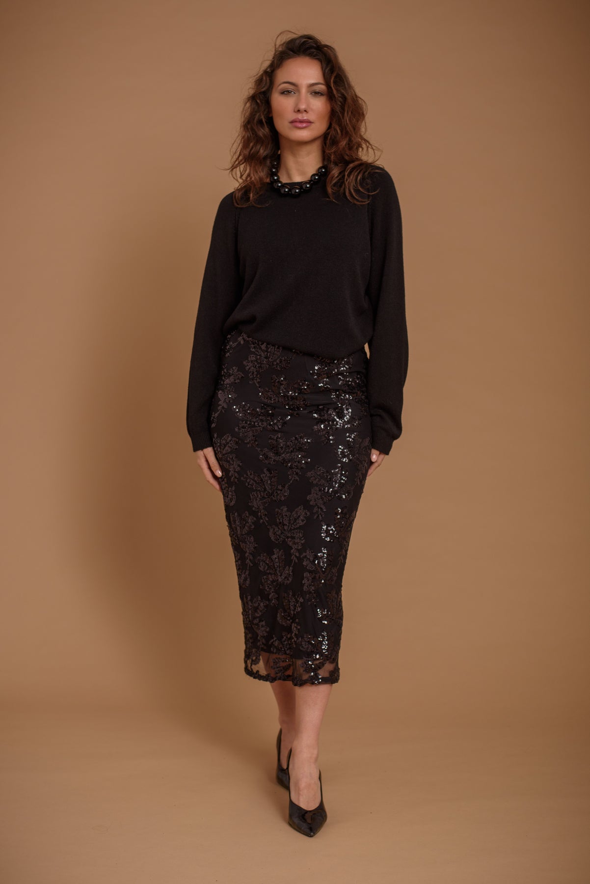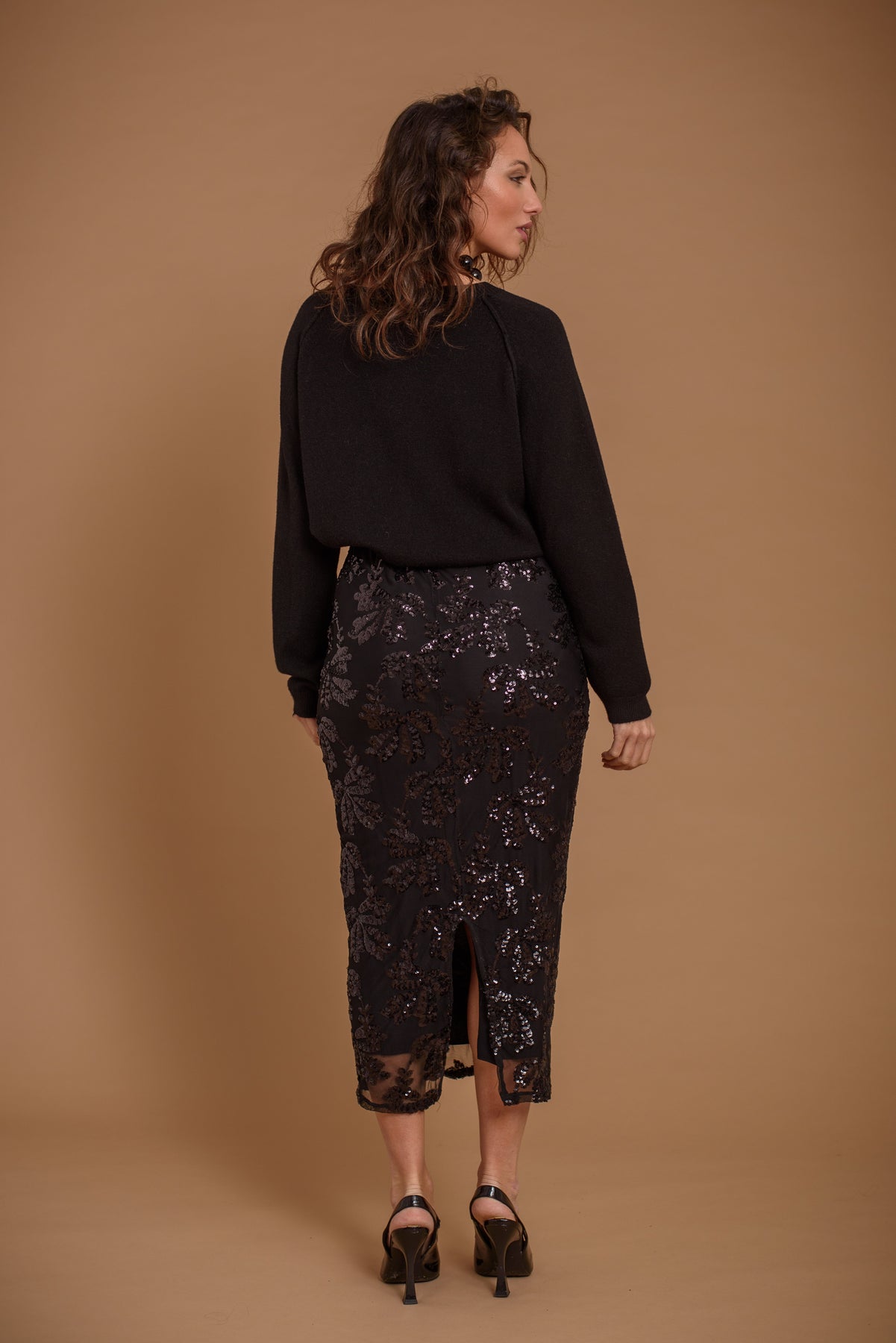 Falda de tul bordado de lentejuelas. Forro interior. Abertura trasera. Largo midi. Elgante y versatil. Perfecta como fondo de armario para todos tus eventos.