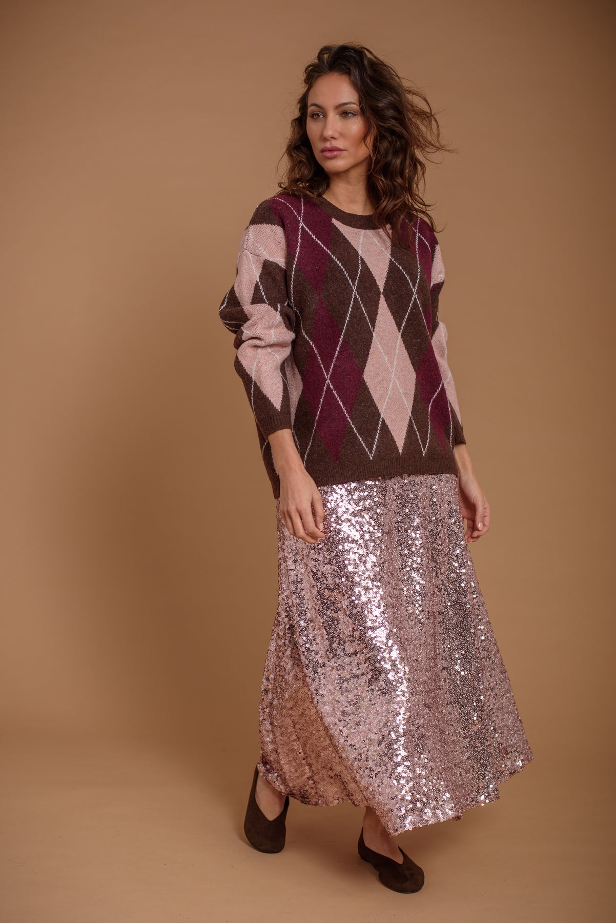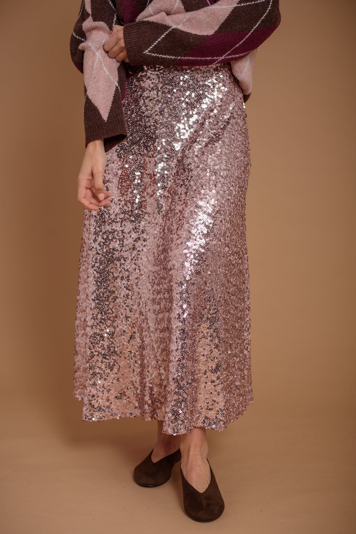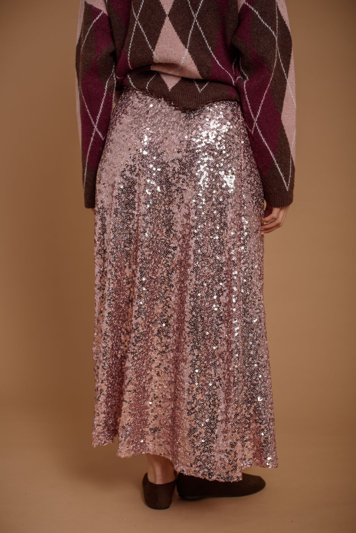 Falda larga de lentejuelas. Goma en cintura. Un básico imprescindible para tus looks más festivos.
