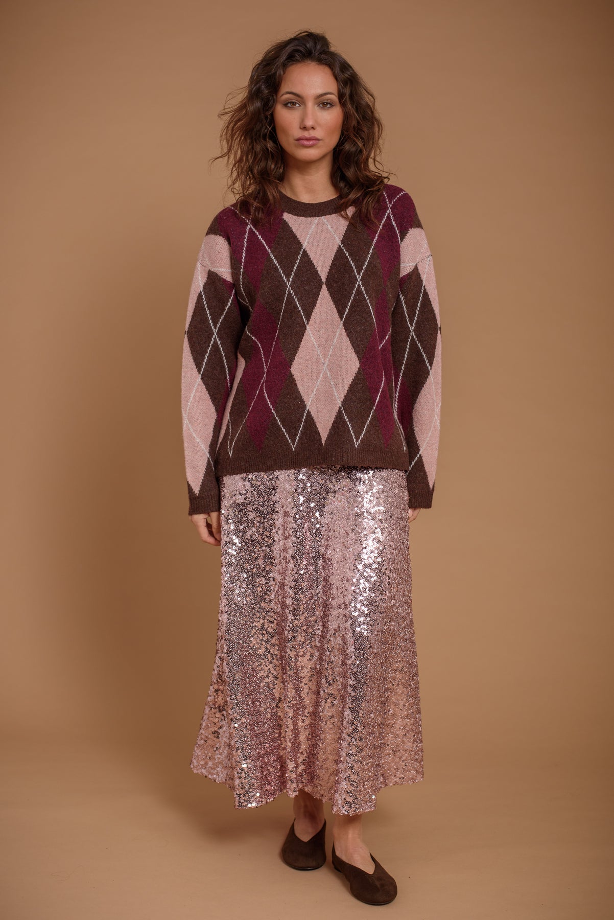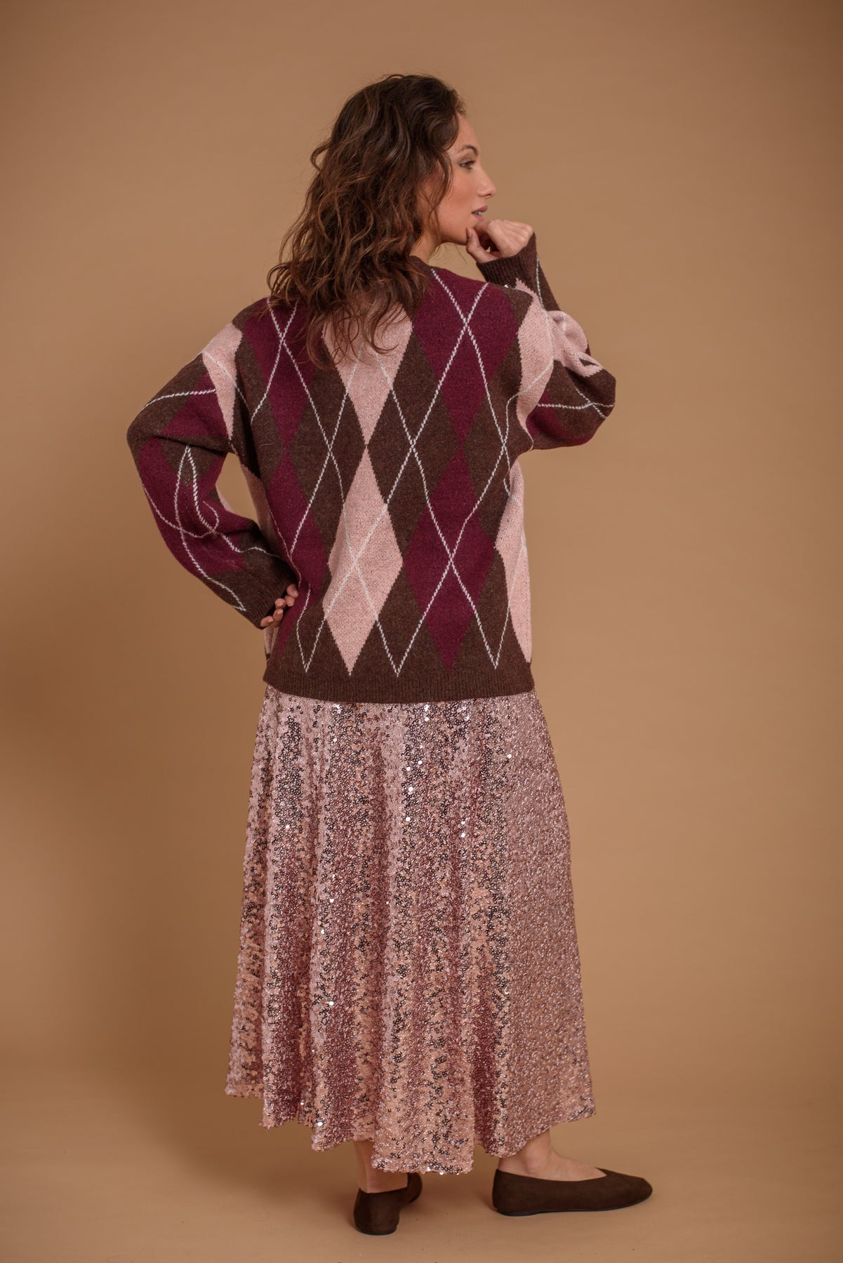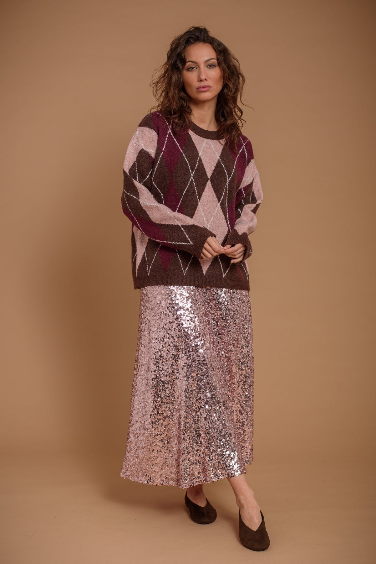 Falda larga de lentejuelas. Goma en cintura. Un básico imprescindible para tus looks más festivos.