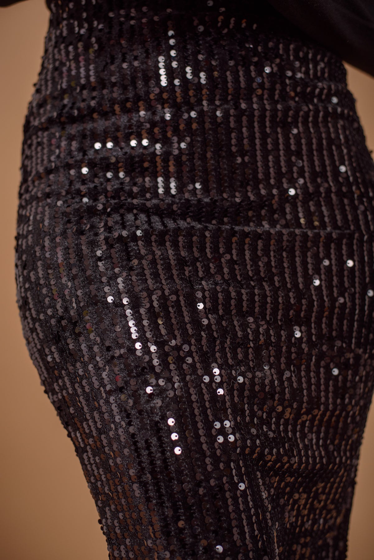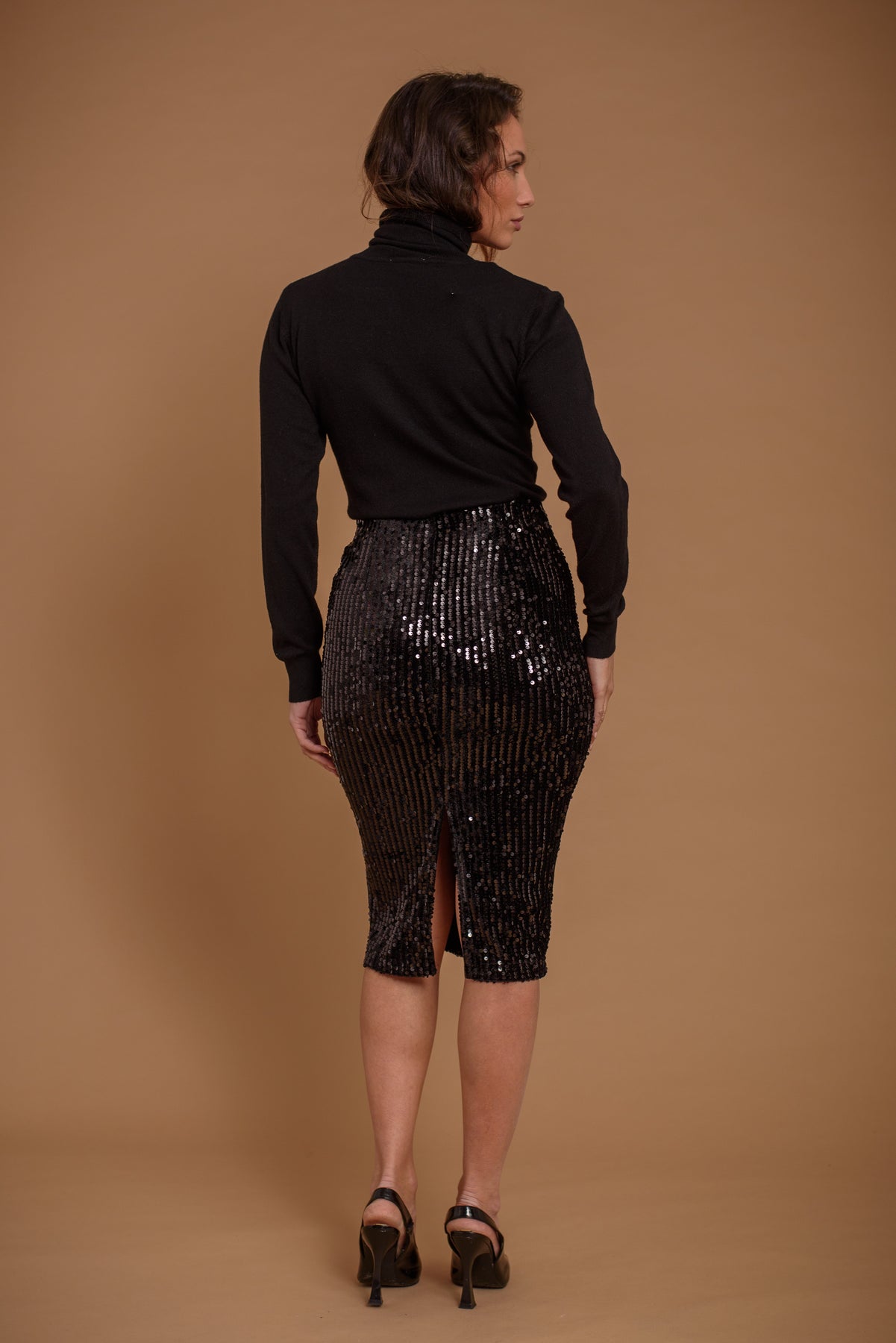 Falda de lentejuelas en tono negro. Abertura trasera. Facil de combinar. Ideal para los eventos de la temporada.