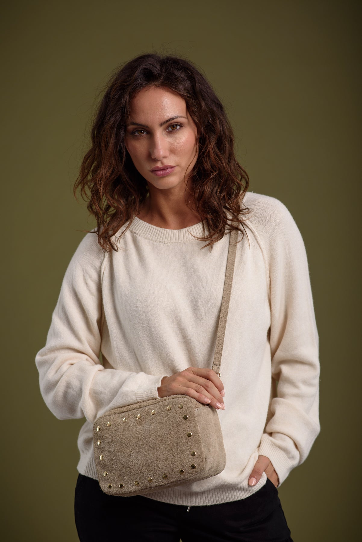 Bolso bandolera, doble cremallera. Detalle de tachuelas doradas en frontal.