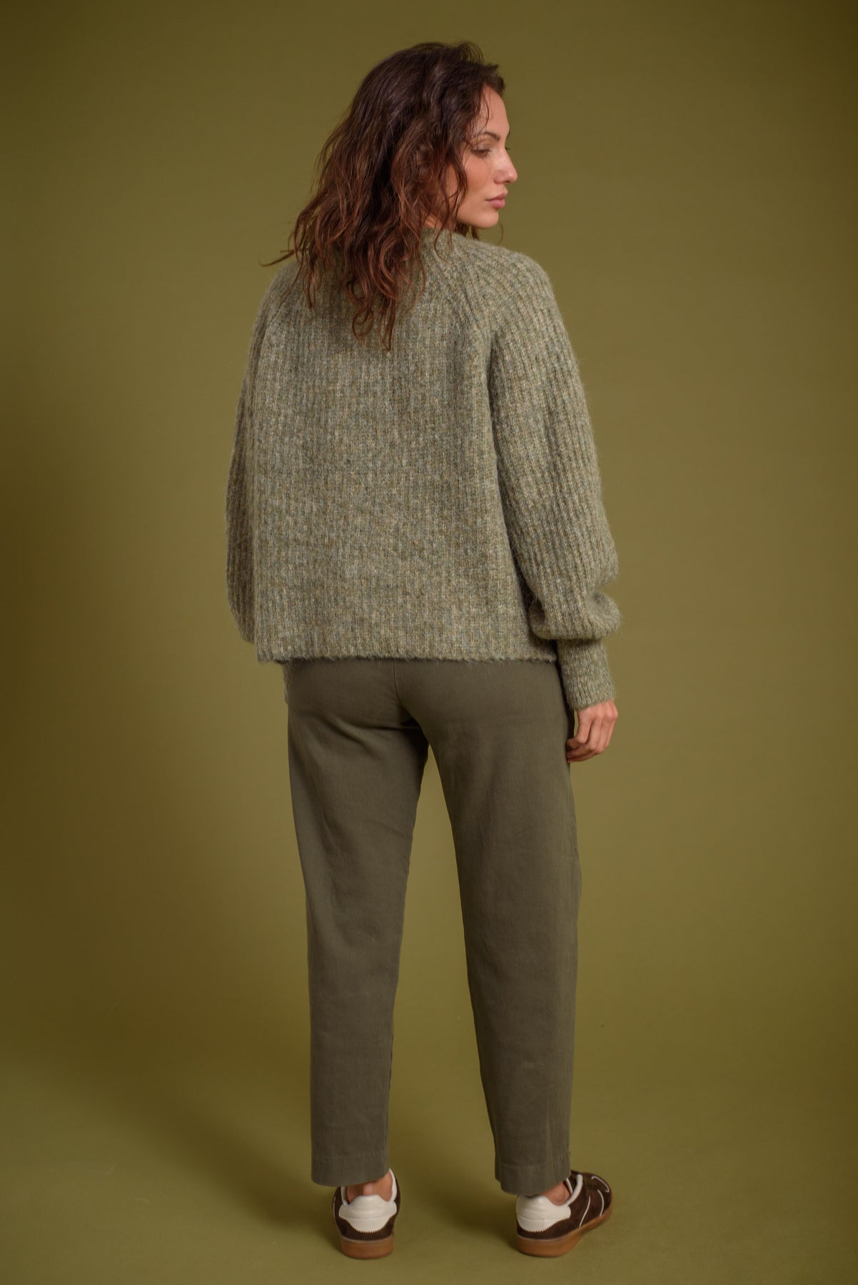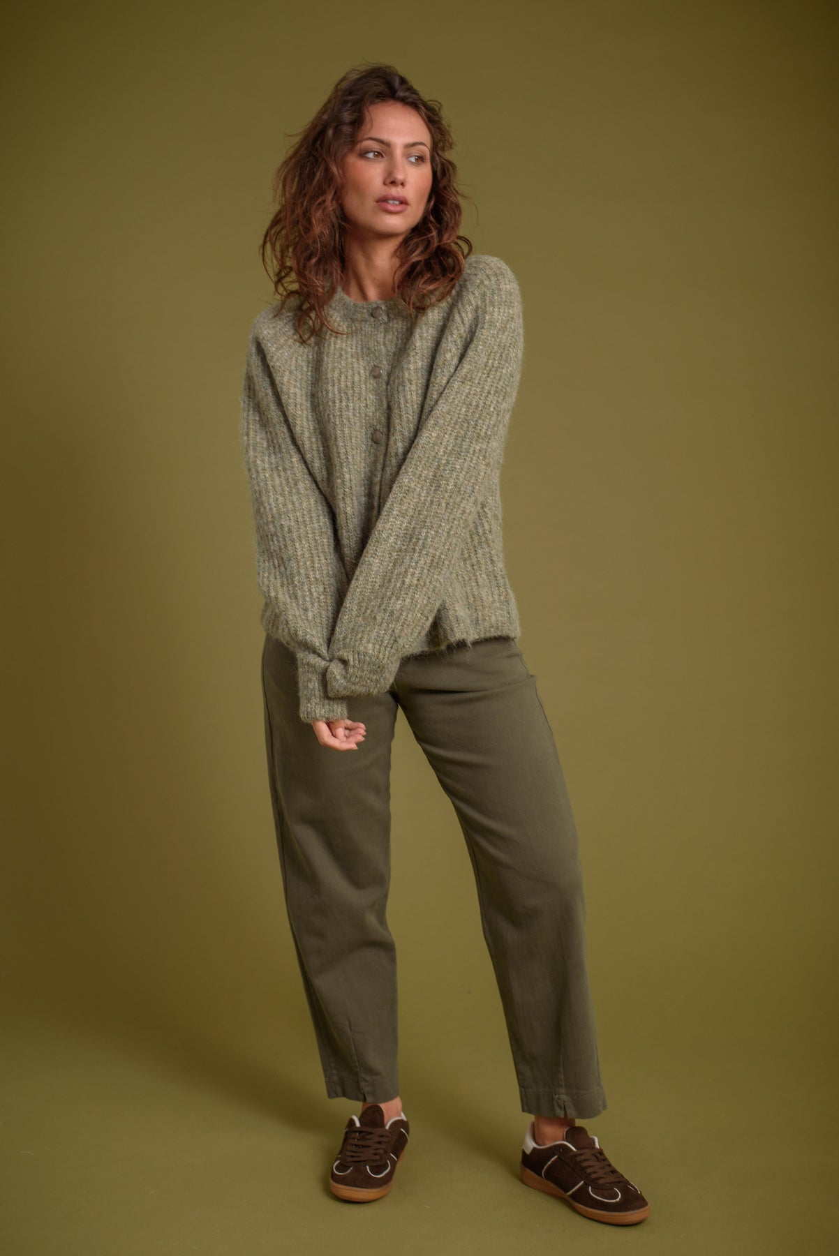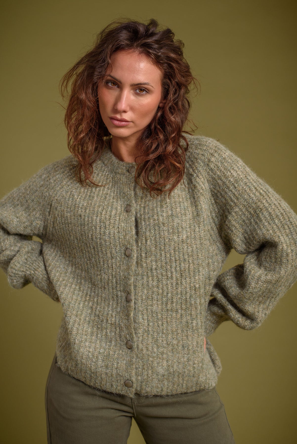 Cardigan cuello redondo. Abotonada sobre el pecho. Suave y super confortable.