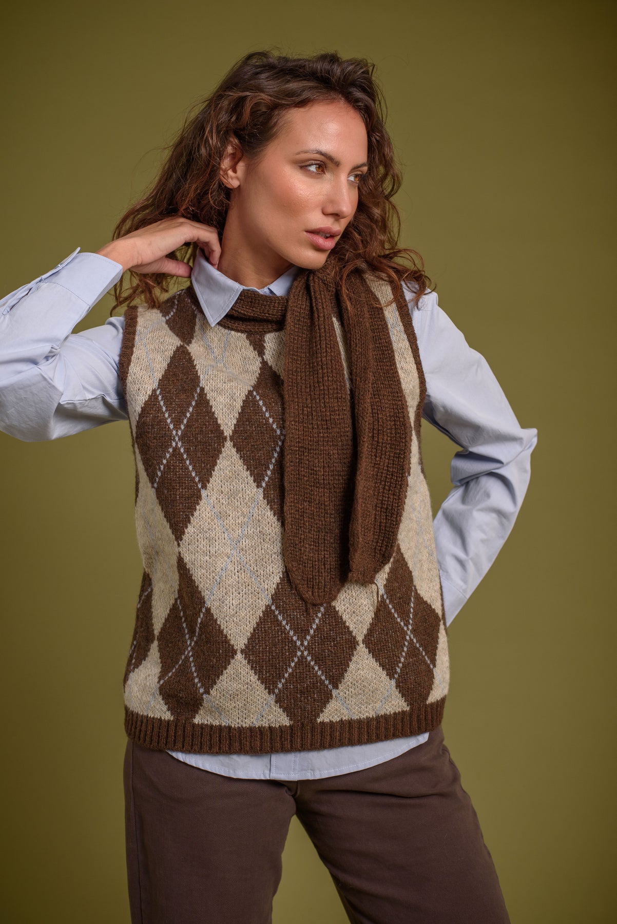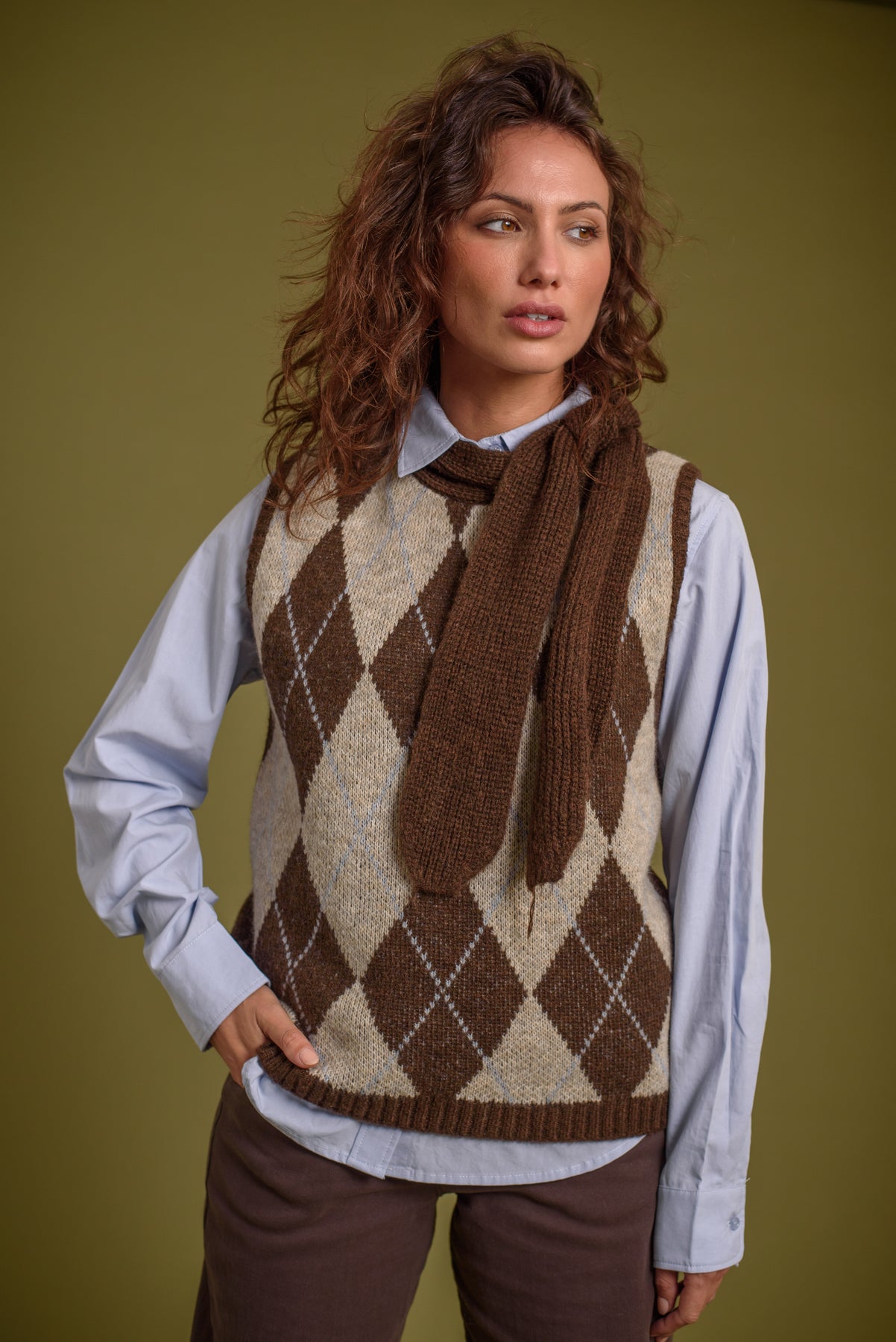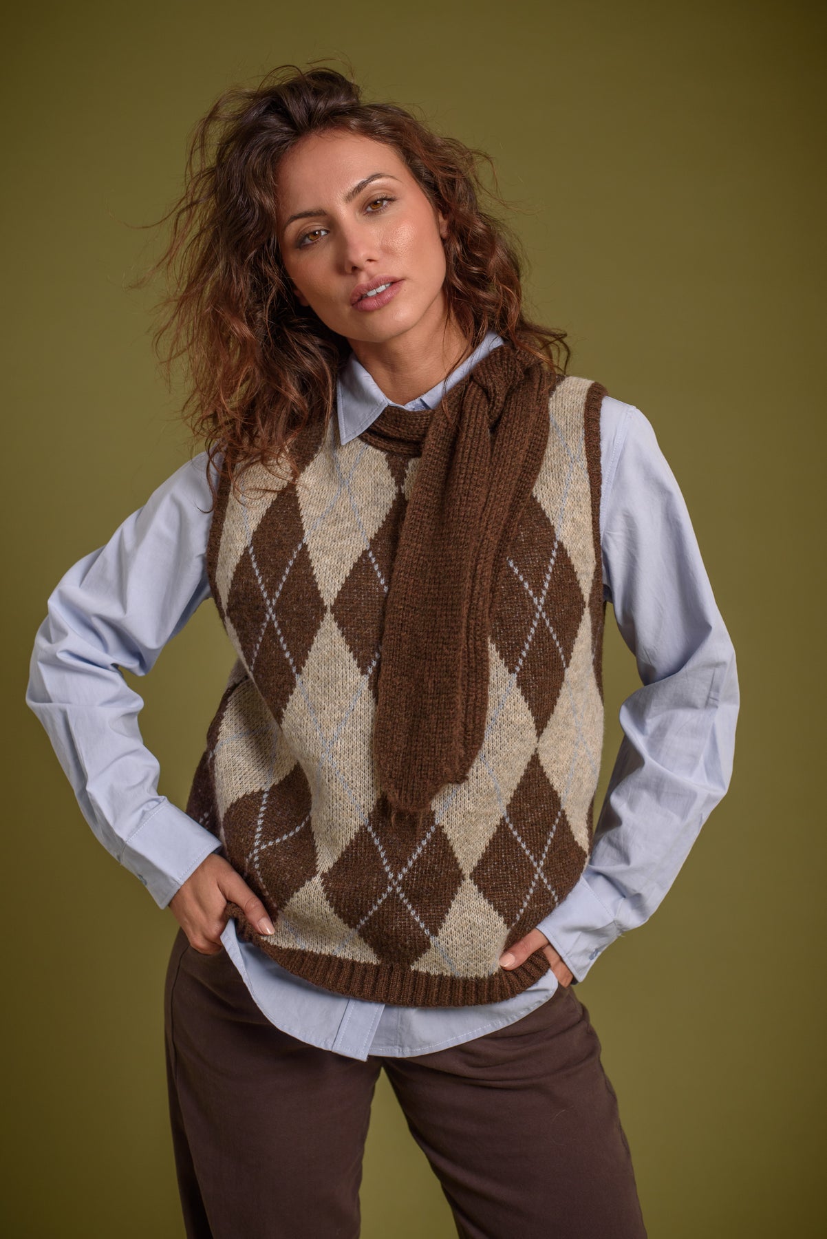 Chaleco estampado rombos. Cuello con detalle de lazada. Favorecedor y con estampado super tendencia.