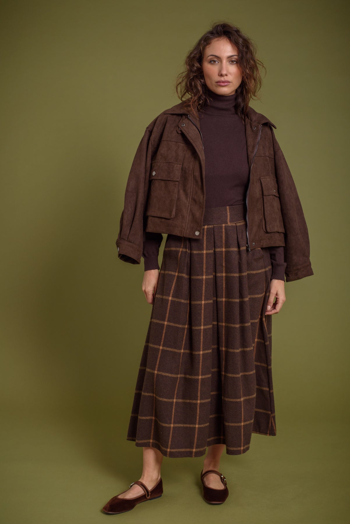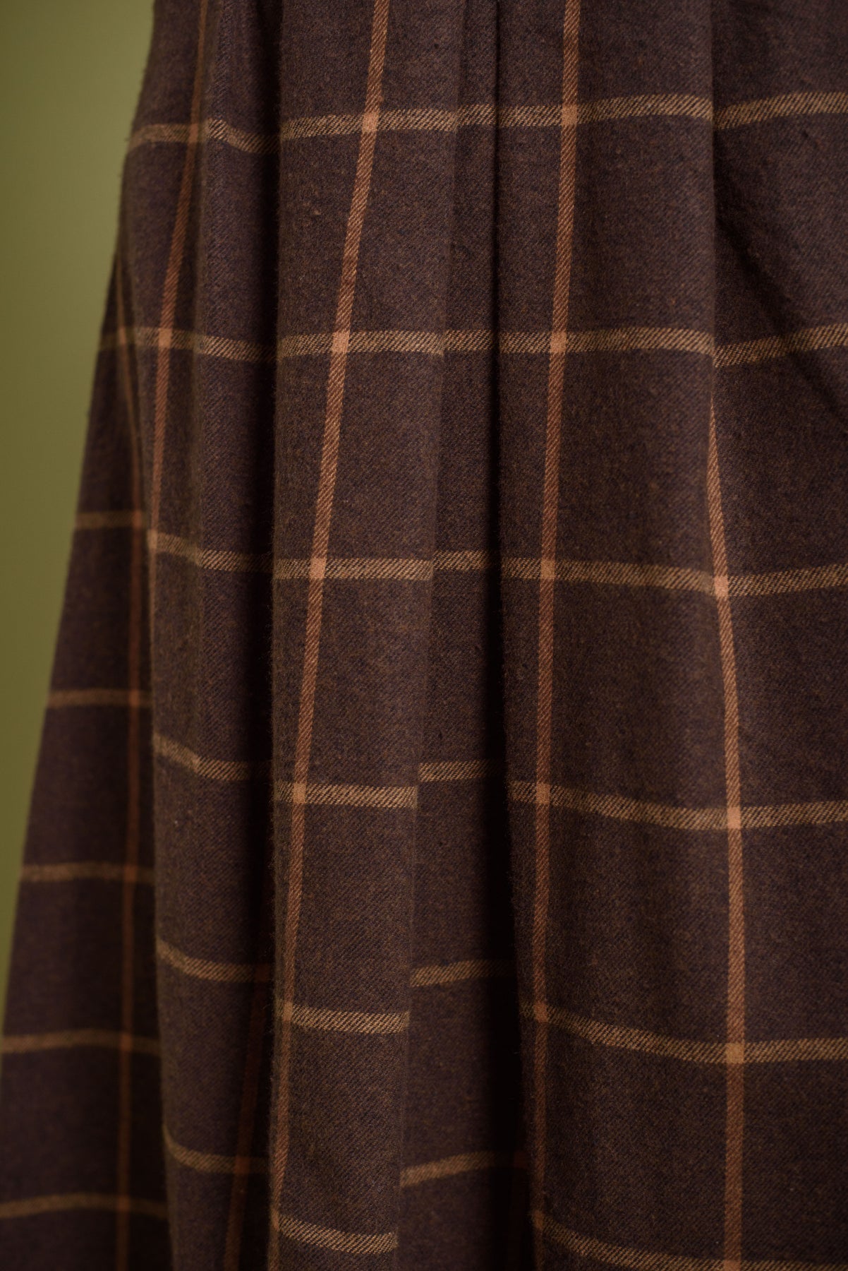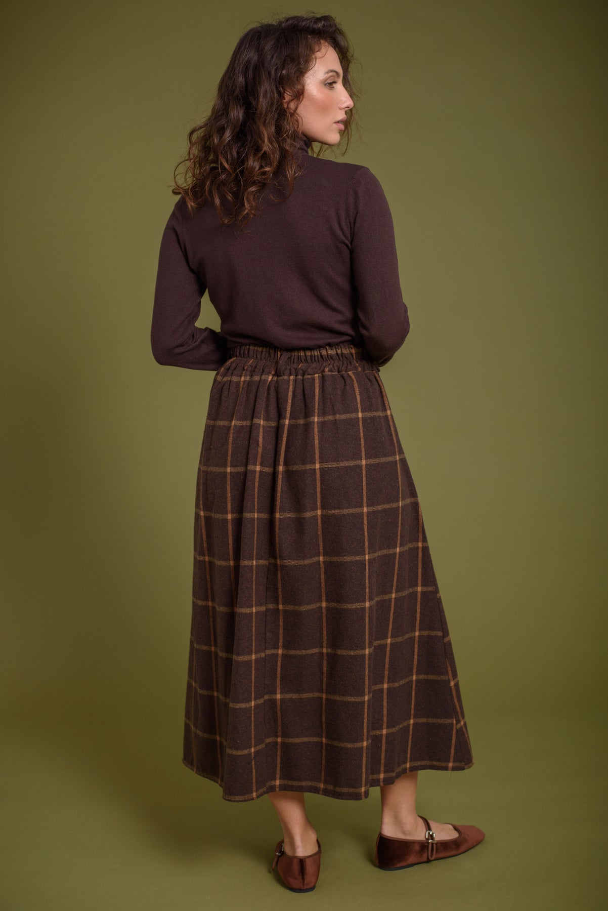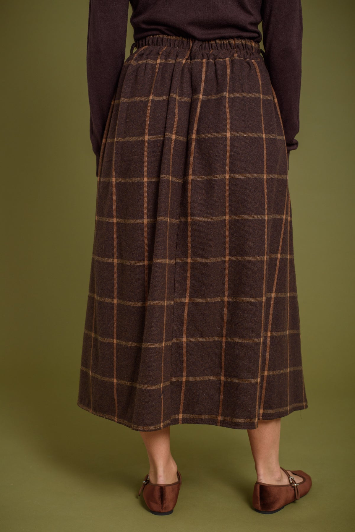 Falda largo midi. Bolsillos laterales. Goma elastica en la espalda. Estampado tartán en tonos chocolate. Tendencia.