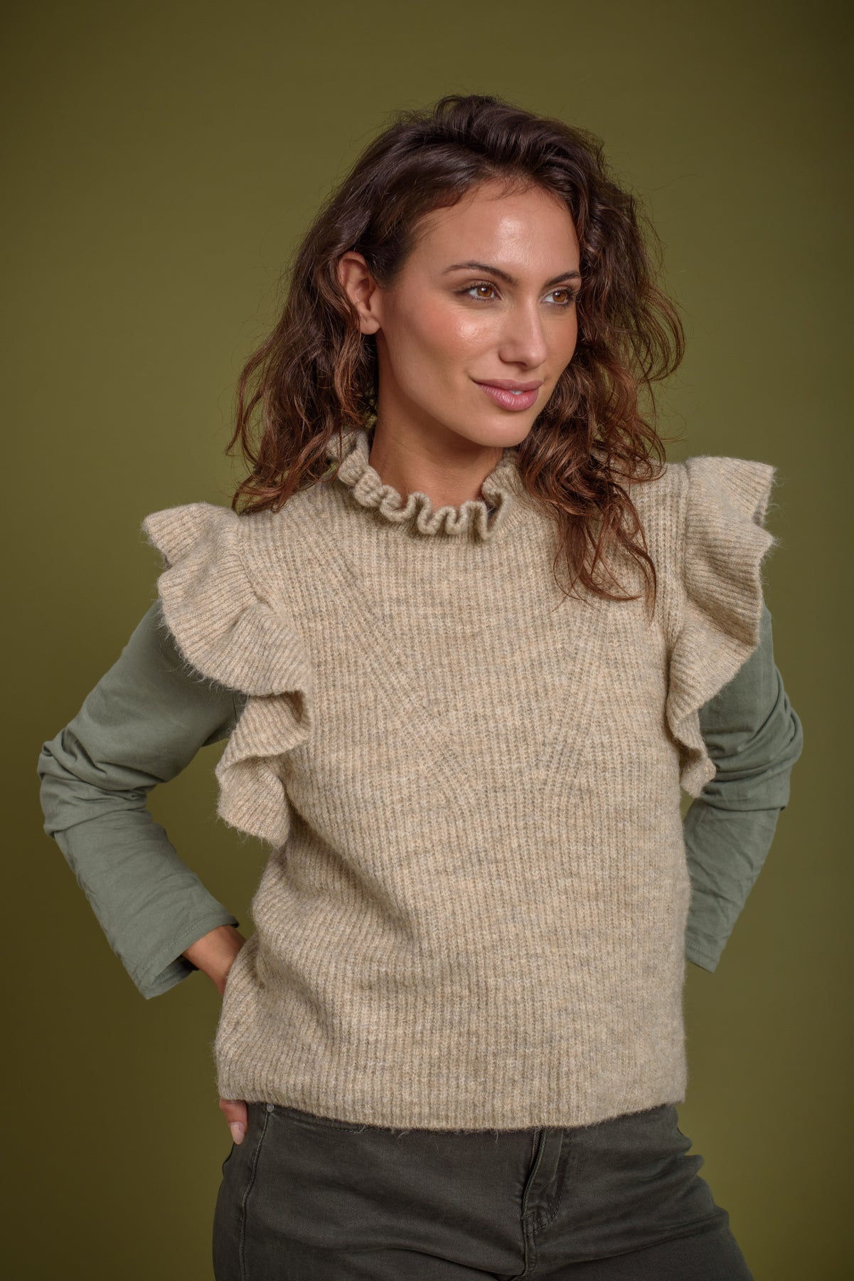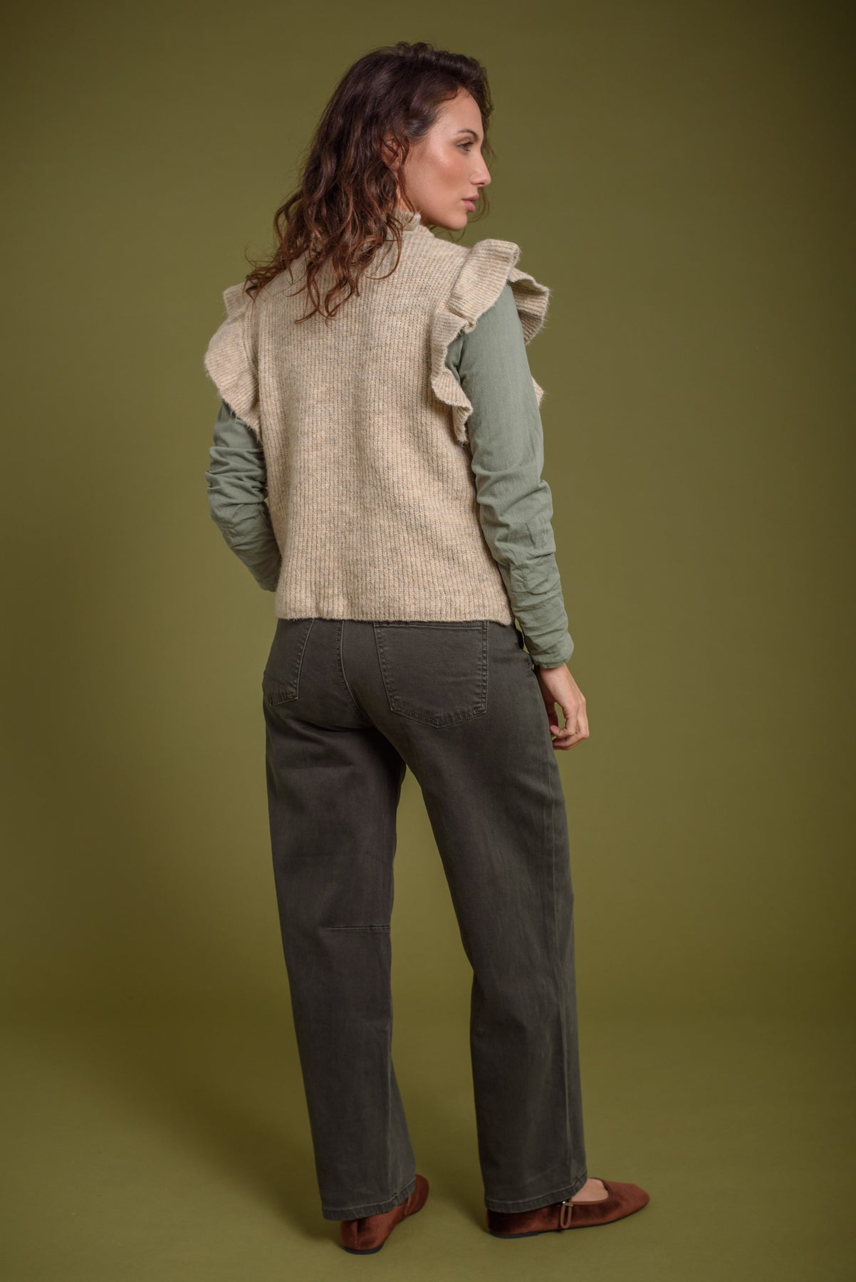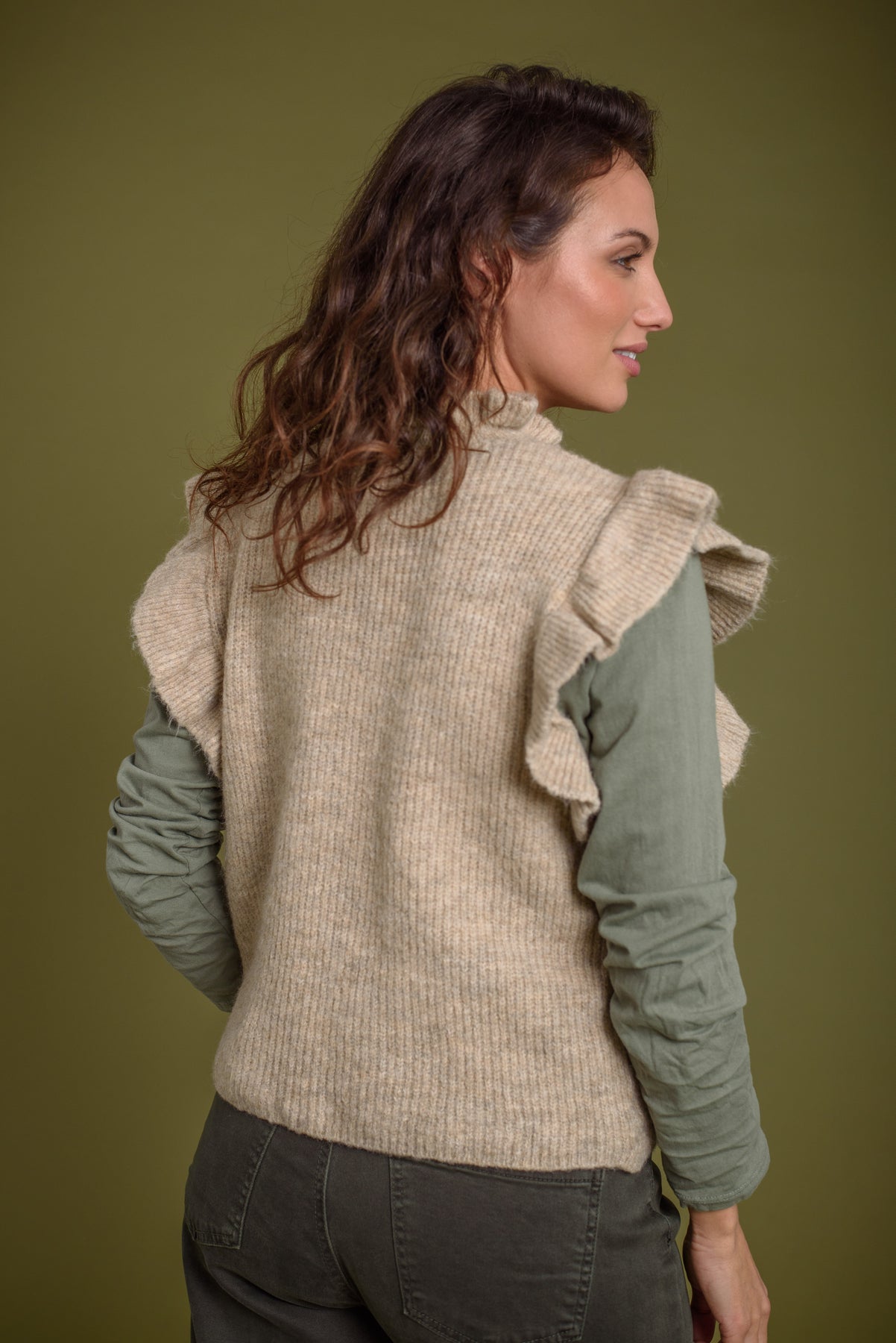 Chaleco de punto. Cuello redondo. Detalle de volante en cuello y mangas. Facil de combinar. Muy favorecedor.