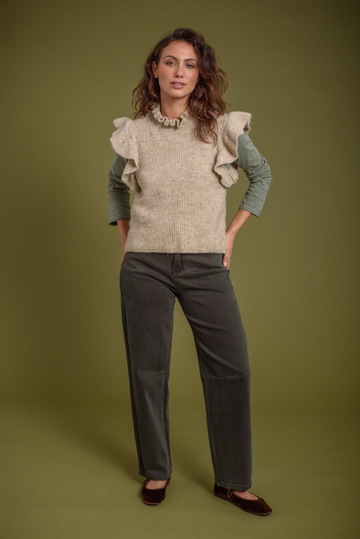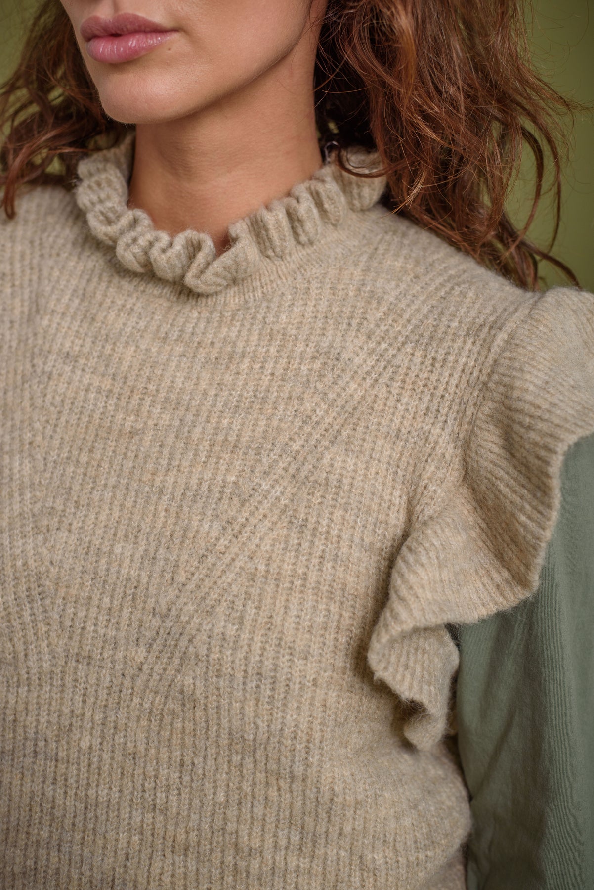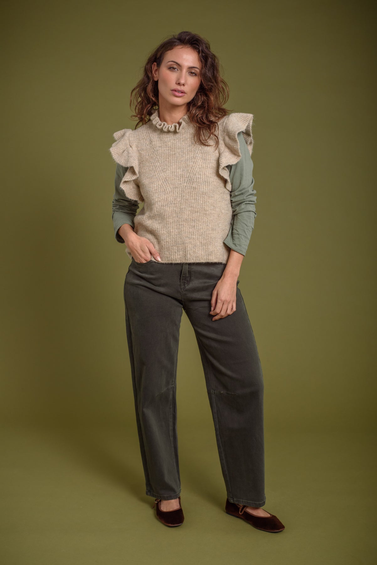 Chaleco de punto. Cuello redondo. Detalle de volante en cuello y mangas. Facil de combinar. Muy favorecedor.