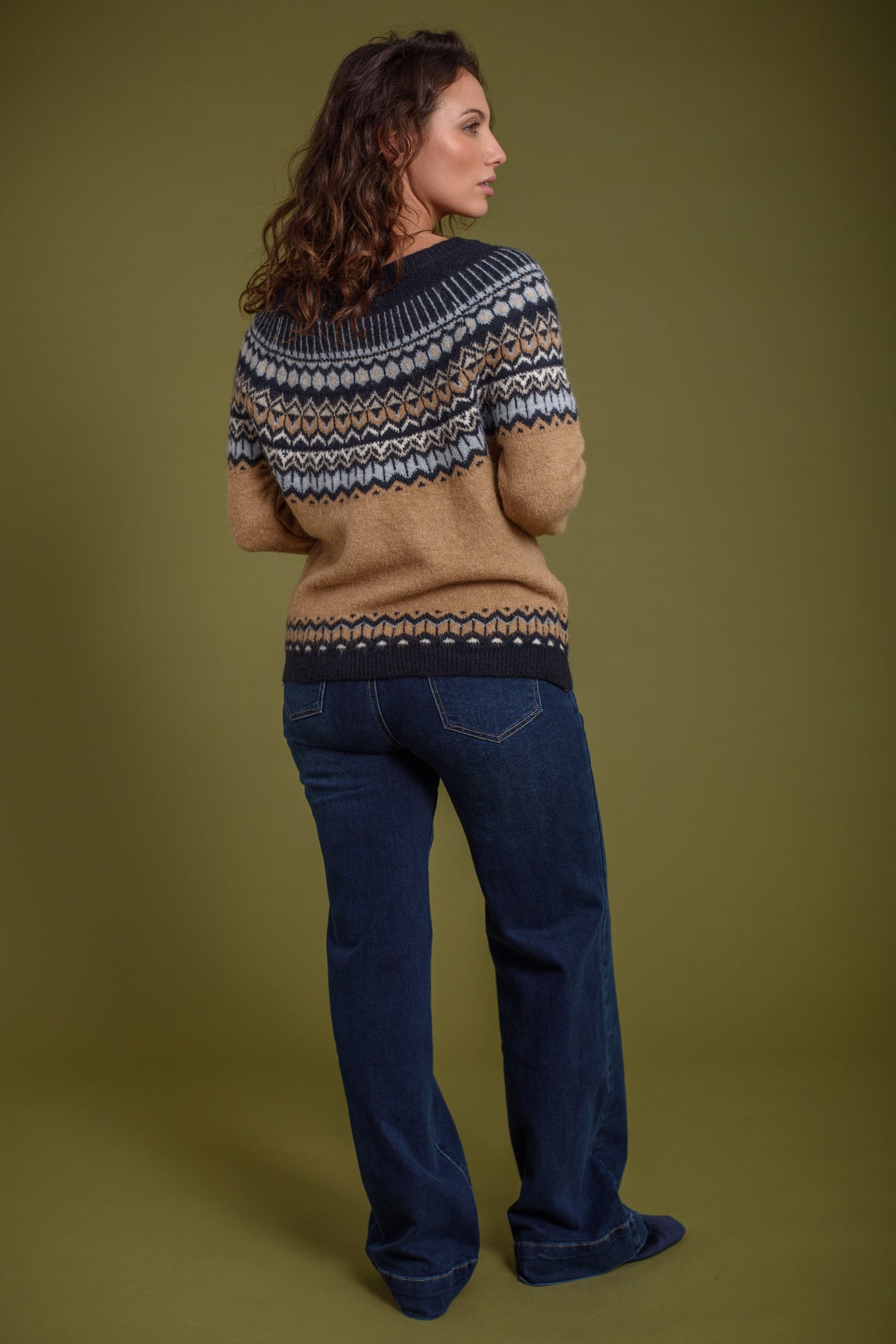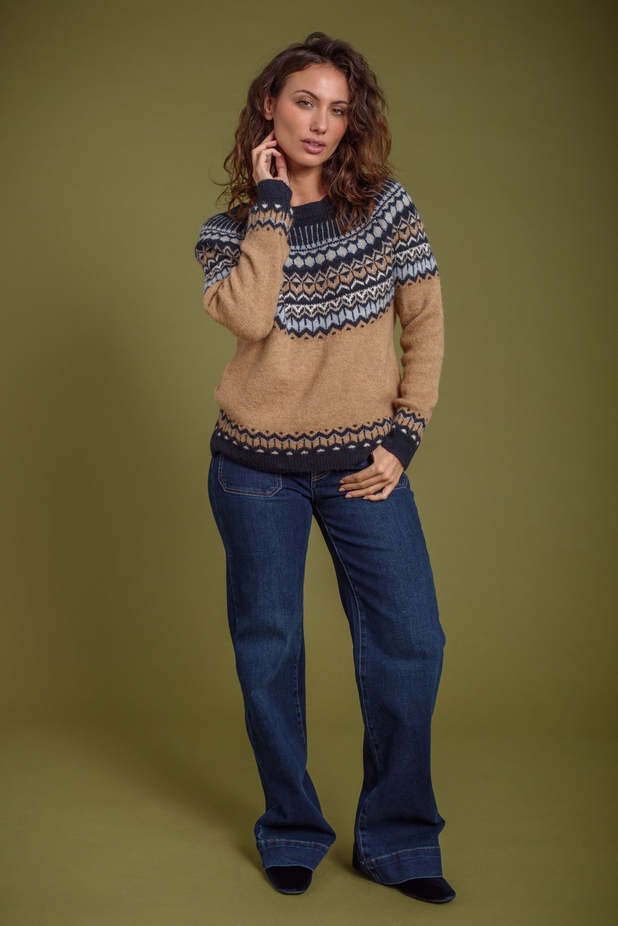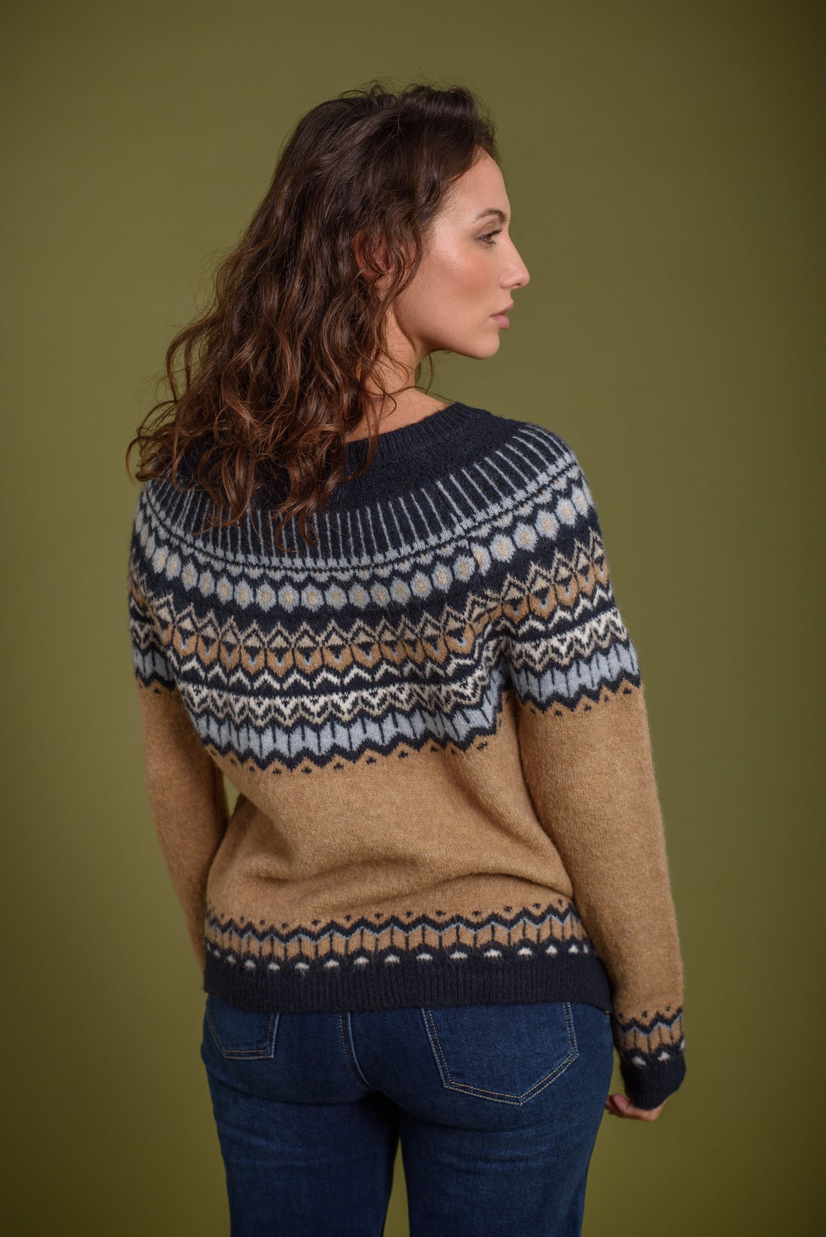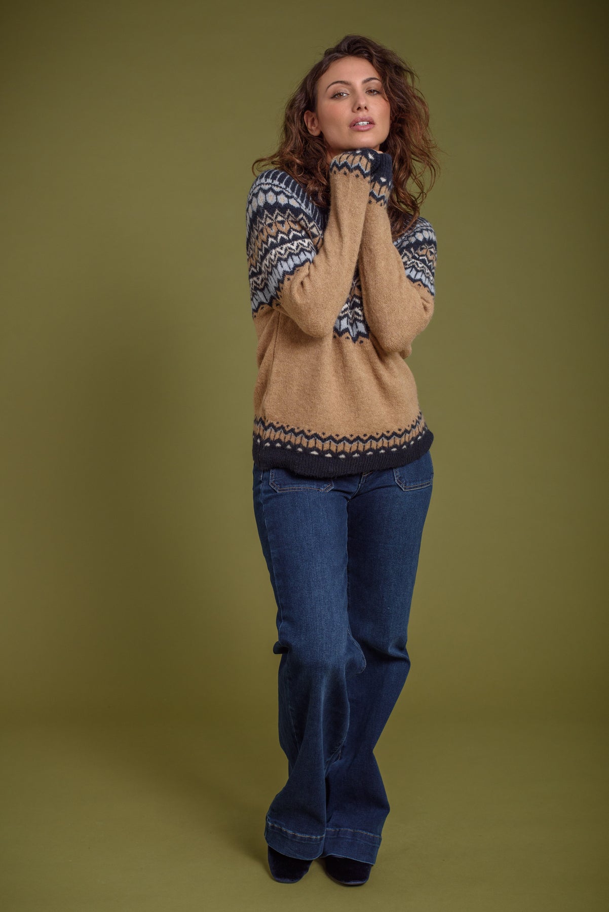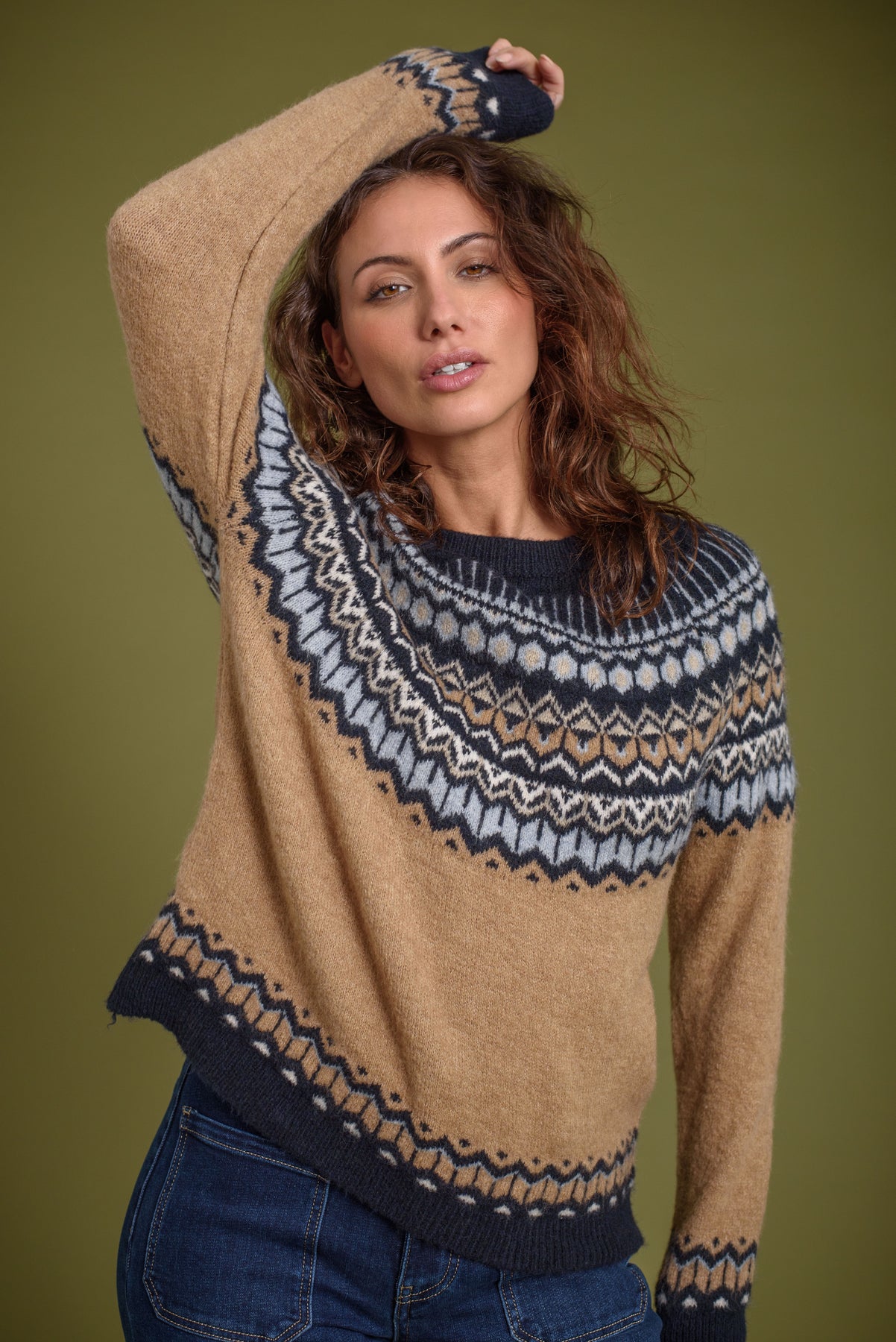 Jersey de punto, estampado grecas, cuello redondo. Un clásico de la temporada invernal que no pasa de moda.