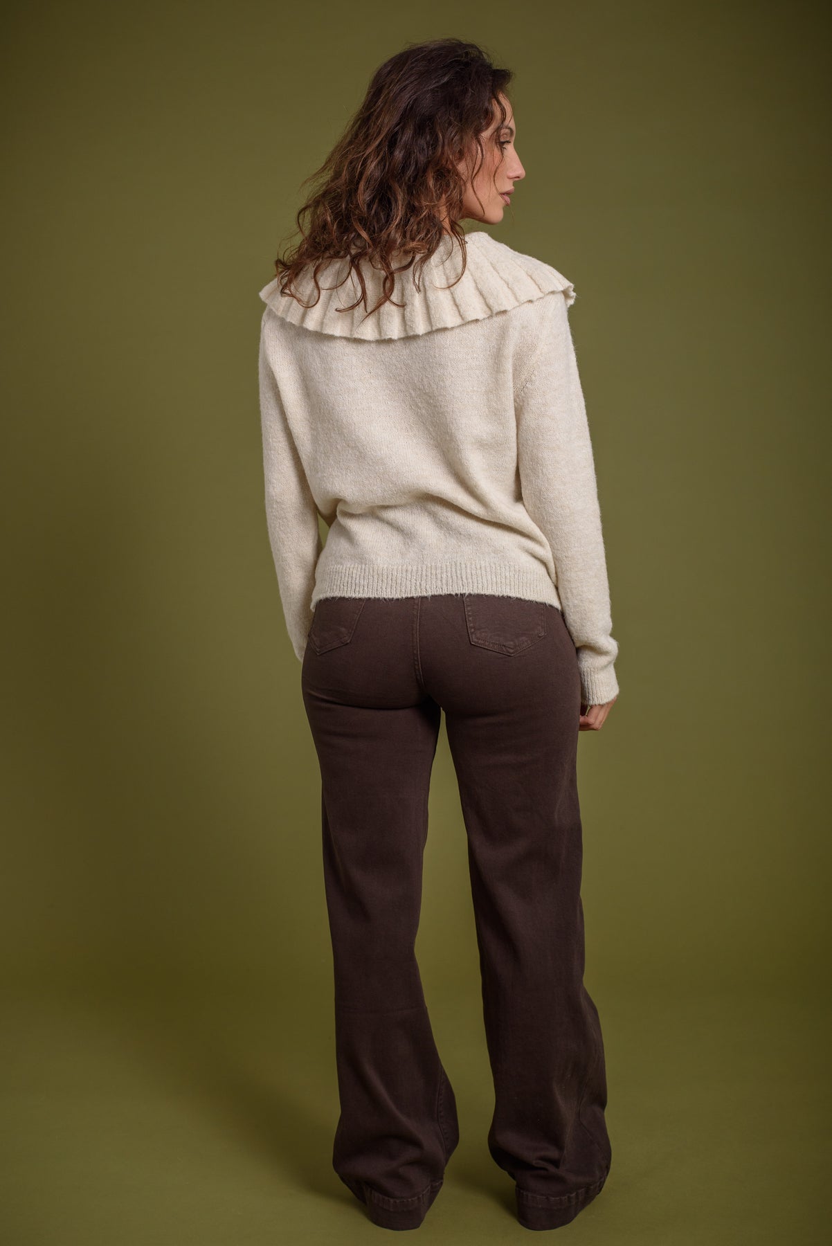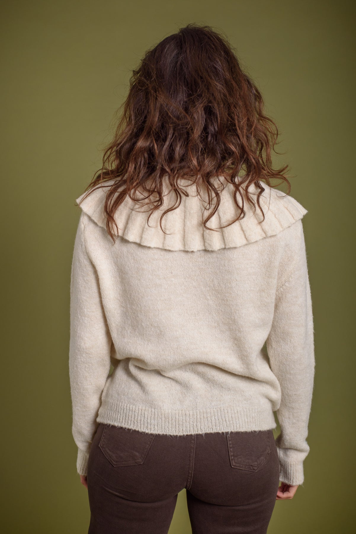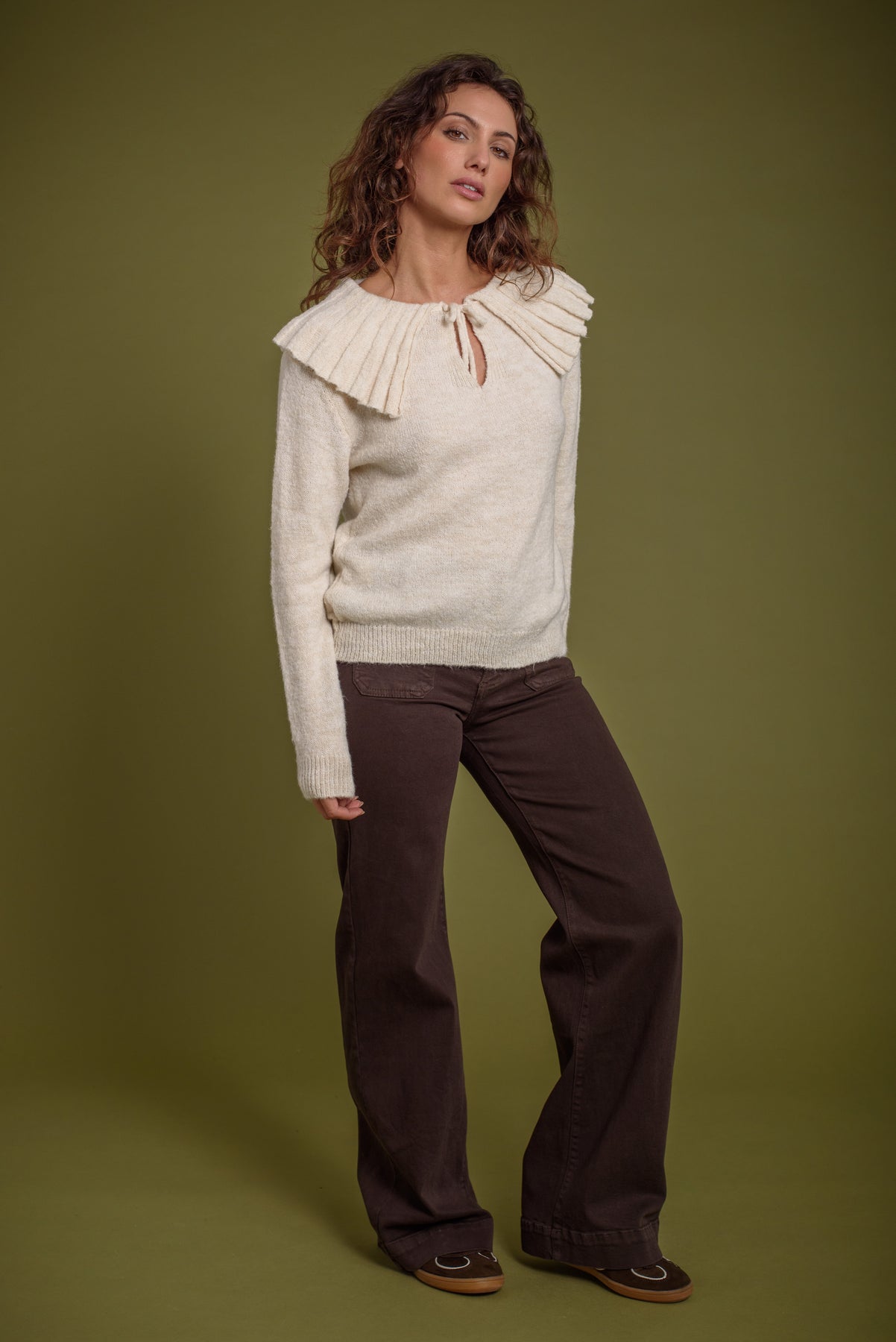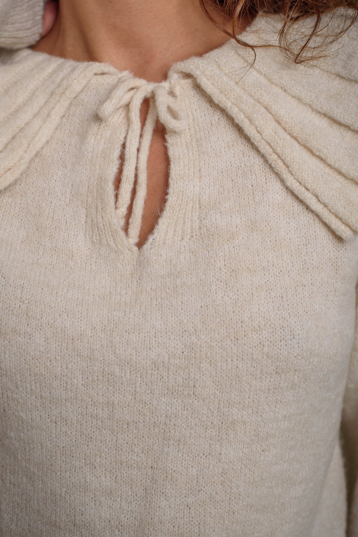 Jersey punto con cuello babero y lazada . Una prenda especial que levantará tu look básico en un segundo.
