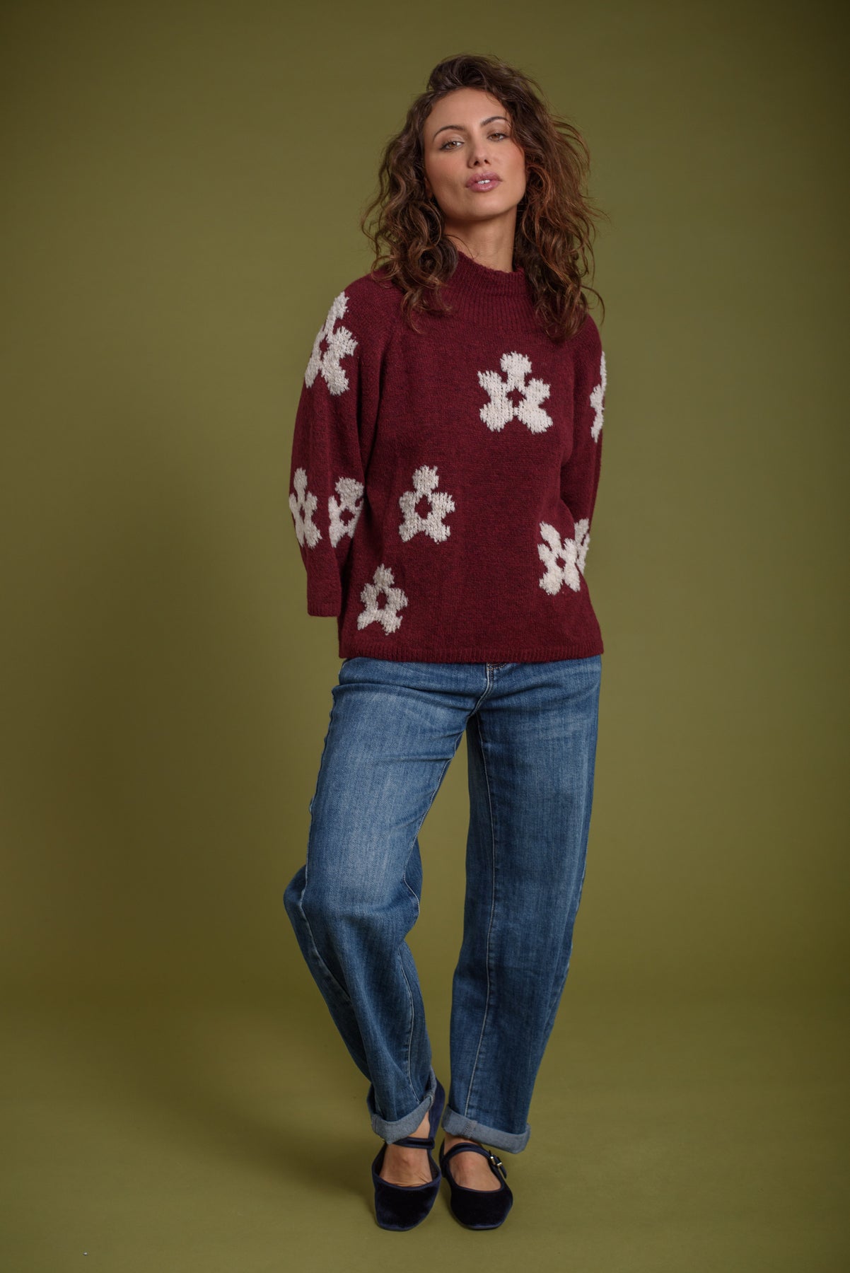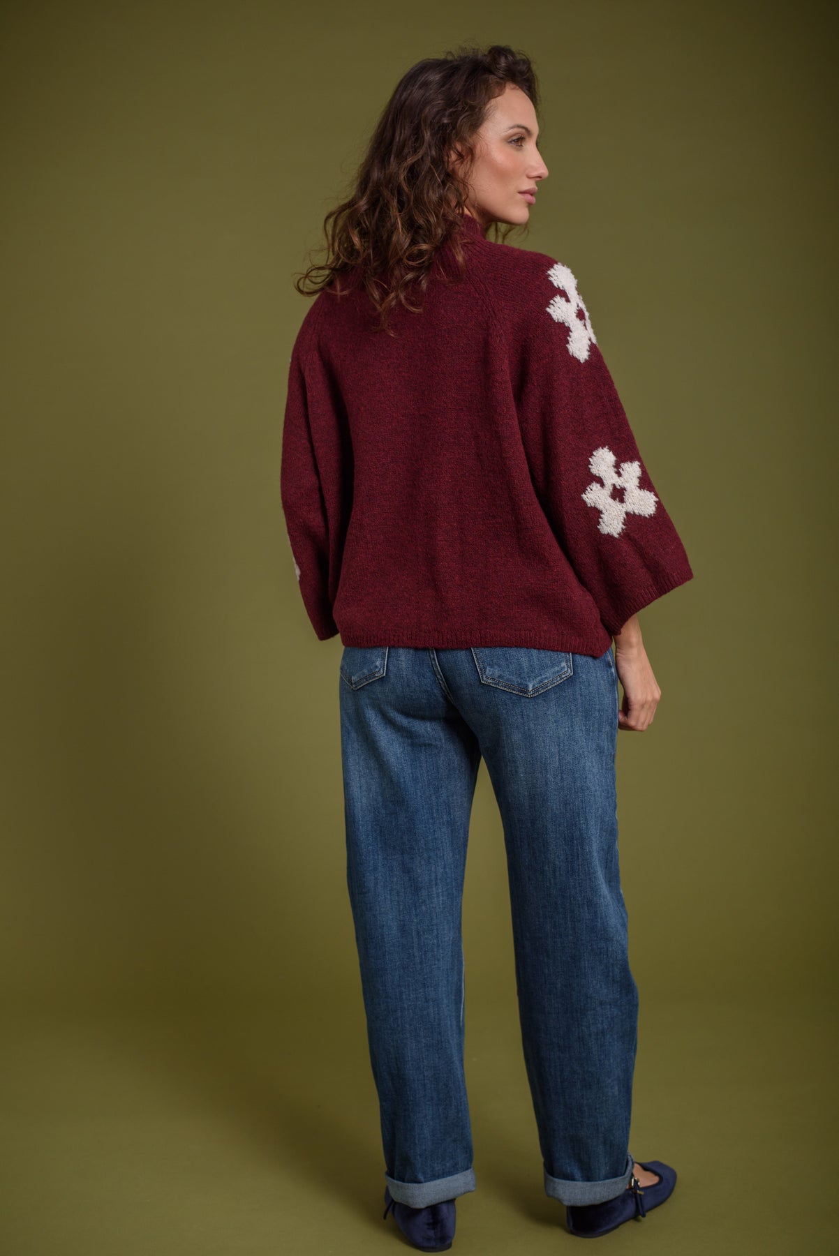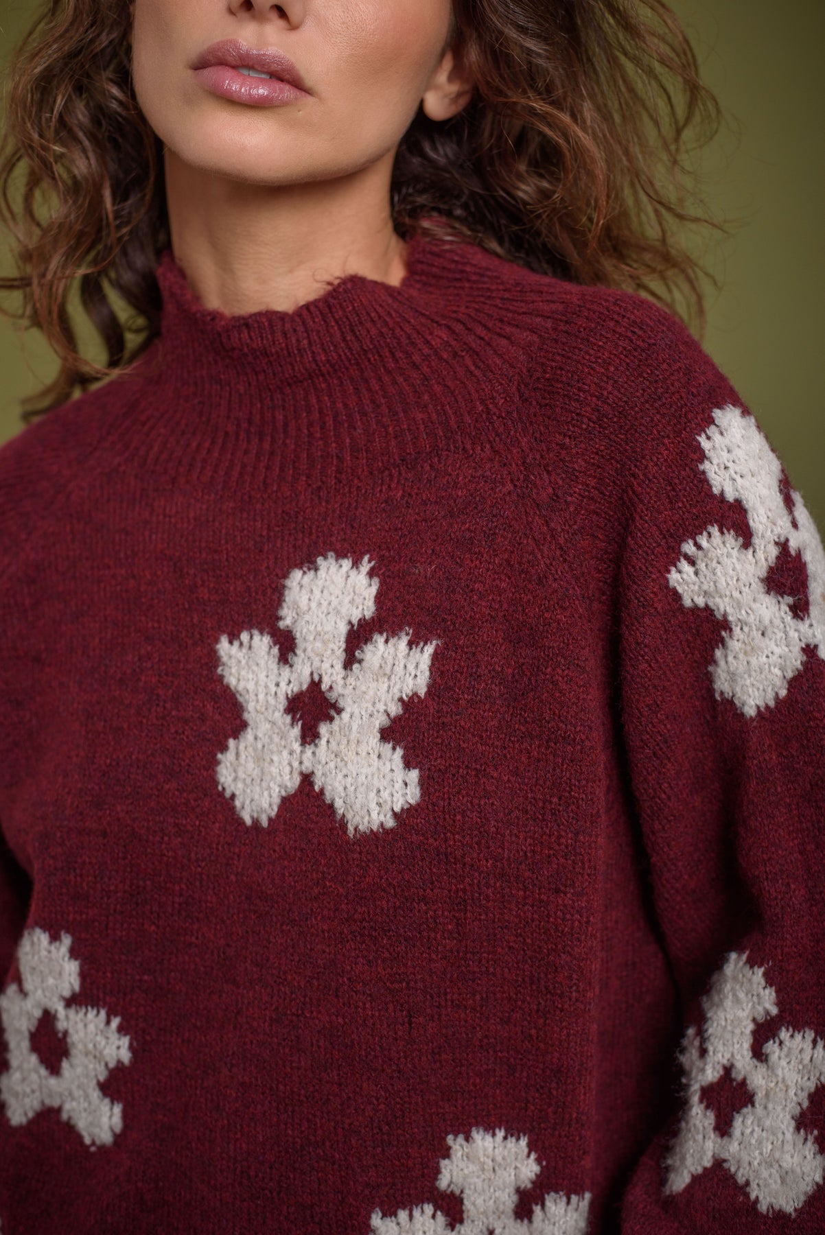 Jersey punto grueso. Cuello chimenea y manga francesa acampanada. Estampado en flores a contraste. Corte amplio.
