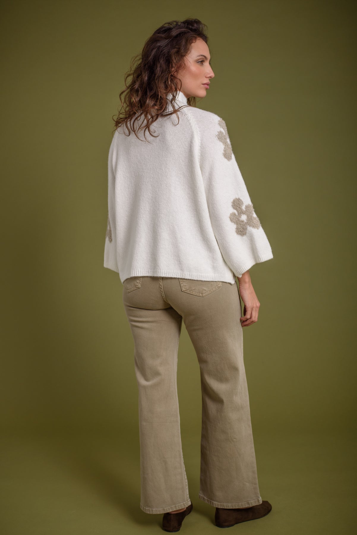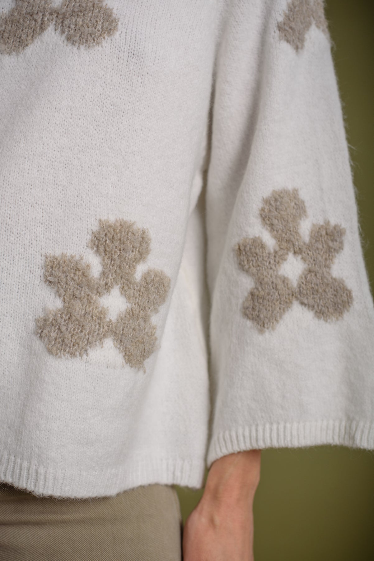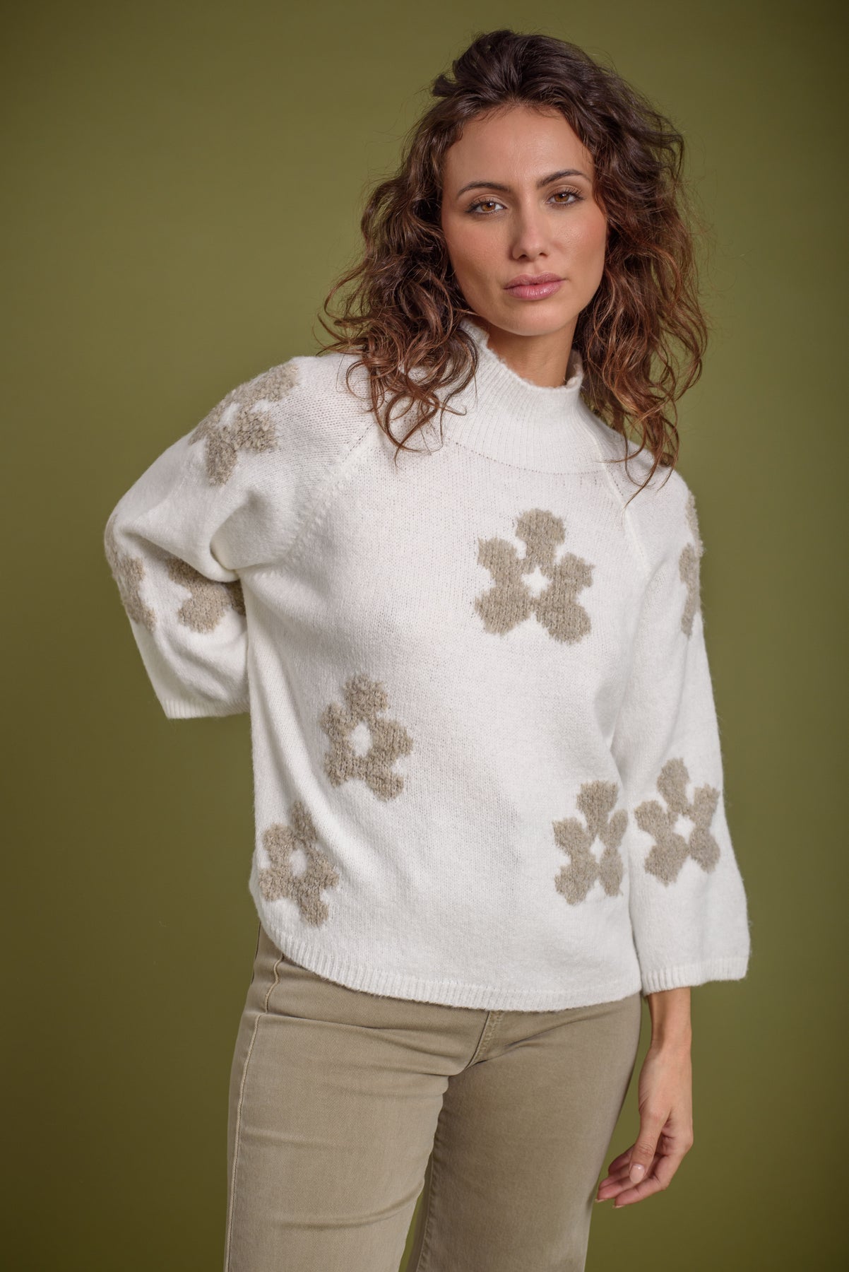 Jersey punto grueso. Cuello chimenea y manga francesa acampanada. Estampado en flores a contraste. Corte amplio.