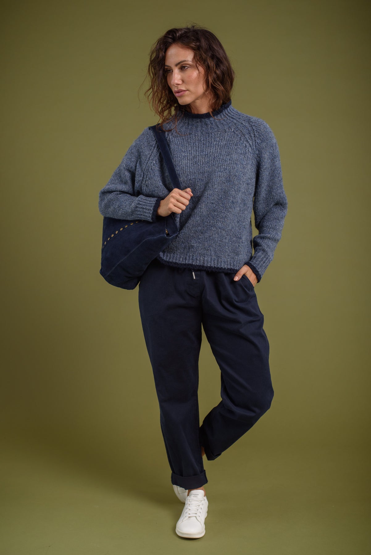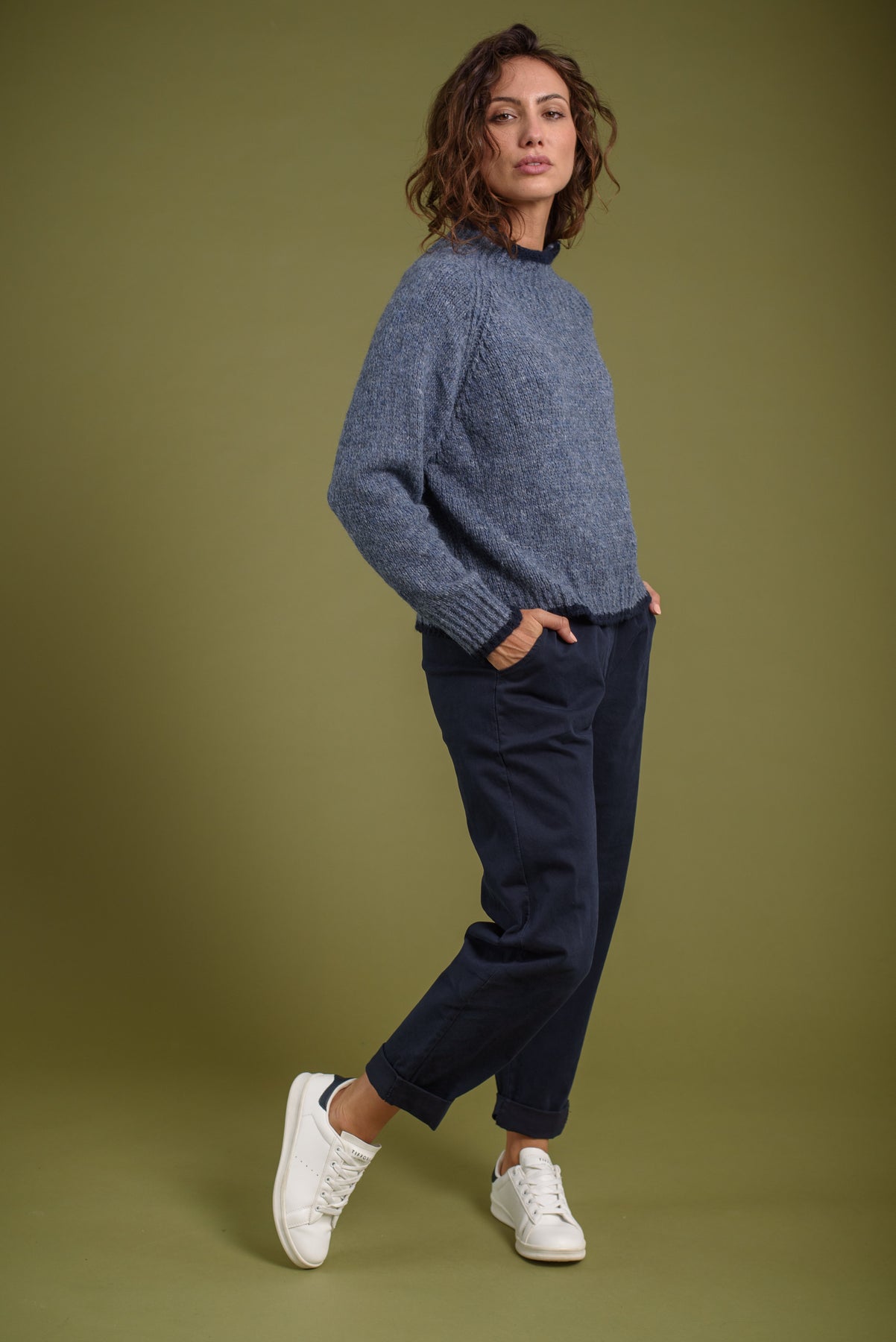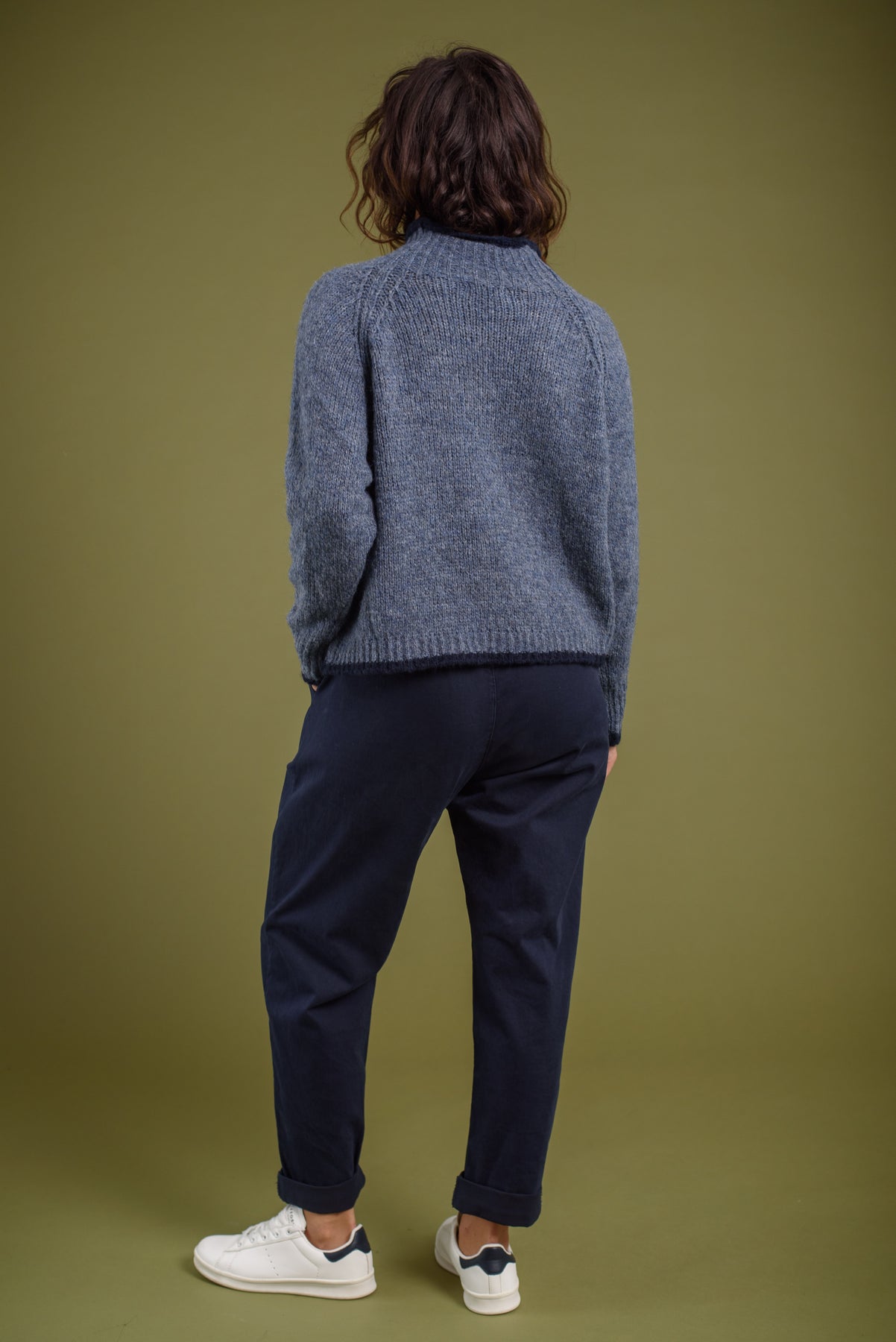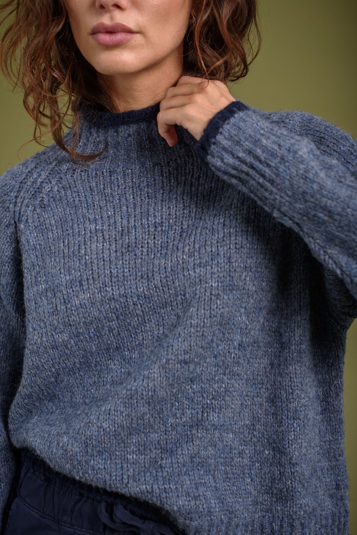 Jersey cuello chimenea, punto gordo. Detalle de franja a contraste en puños, bajo y cuello.