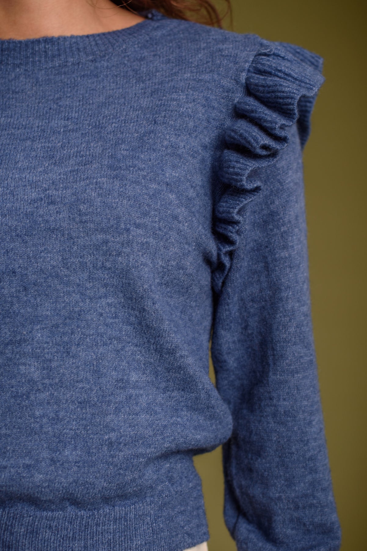 Jersey de punto, cuello redondo, manga larga. Detalle de volante sobre el hombro. Ideal en todos los colores. Super favorecedor.